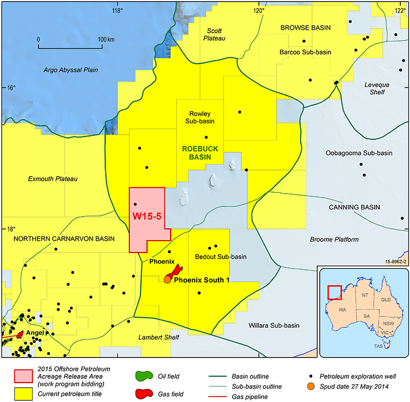 The Roebuck Basin is a lesser-known offshore province southwest of the Browse Basin. It recently made news when the exploration well Phoenix South 1, which was intended to find additional gas in support of possible development of the original gas accumulation at Phoenix 1, unexpectedly discovered oil in September 2014 (Figure 2). Since this discovery, the Roebuck Basin has been the subject of strong interest from explorers and data acquisition companies who are keen to further assess the untapped potential of this basin. A new exploration opportunity is provided by the 2015 Acreage Release with a large block now available for work-program bidding to the north of the Phoenix wells.