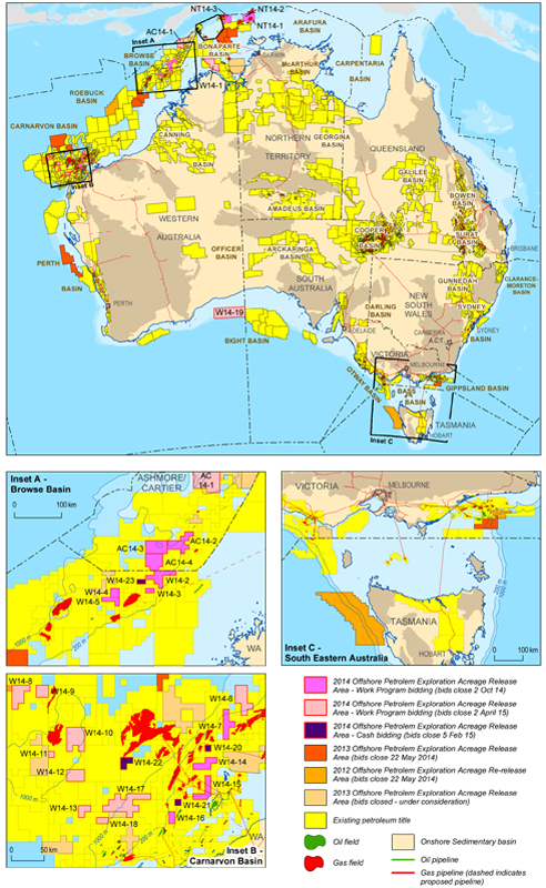It is not surprising that the North West Shelf hosts the majority of the 2014 Release Areas given the sustained strong exploration activities across the Westralian Superbasin which extends from the Northern Carnarvon to the Bonaparte Basin along Australia's northern margin.