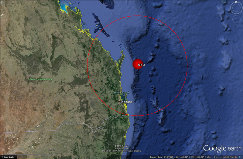 The magnitude 5.3 earthquake occurred at 9.41am Australian Eastern Standard Time (AEST) 100kms east of Queensland's Sunshine Coast at a depth of approximately 30km.