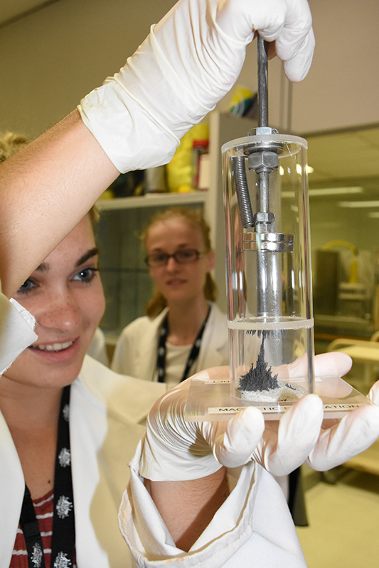 During their visit to Geoscience Australia, students learnt how to find and analyse a hidden heavy mineral sands deposit. Drawing on their teamwork skills, the students completed a magnetic survey, used laboratory equipment to separate out the minerals found, and completed a detailed data analysis of their samples. The event culminated when the groups shared their results, discussing what they had found and reflected on working as part of an interdisciplinary team.