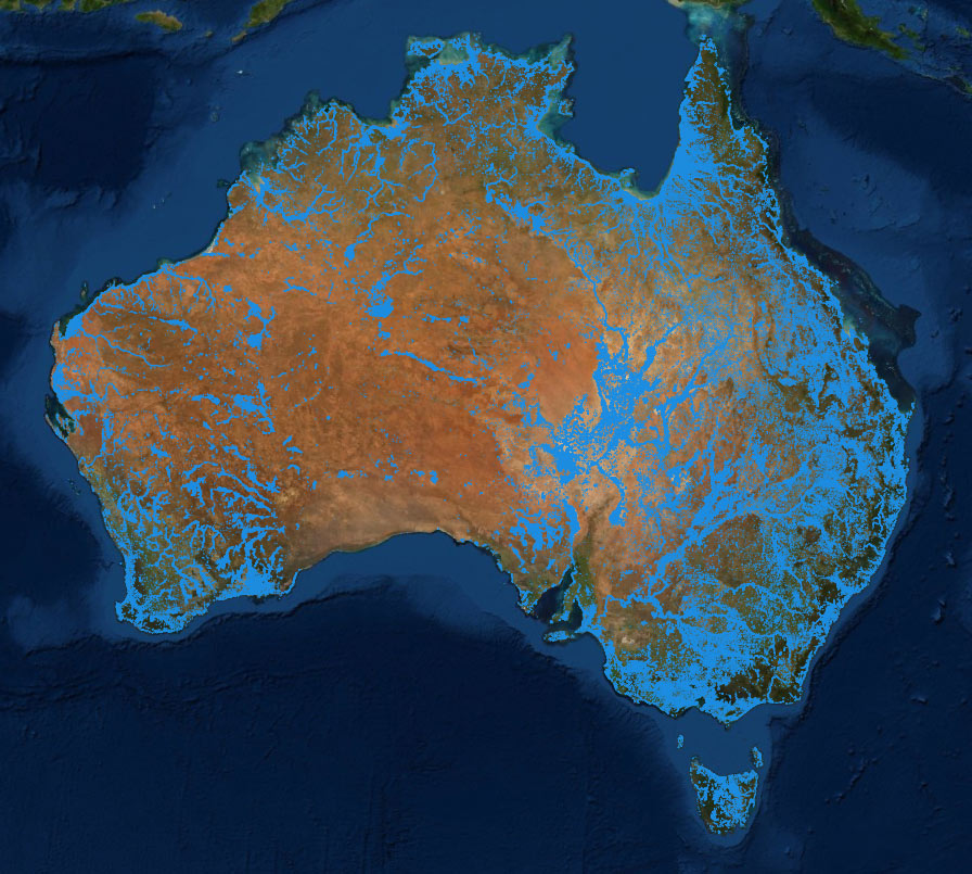 A continent-wide image of Australia overlayed with approximately 300,000 waterbodies of the DEA Waterbodies product. Thick blue outlines indicate areas where water has been observed at least some of the time over the last 30 years (DEA Maps).