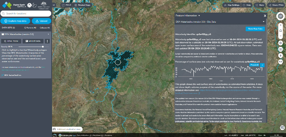 Satellite imagery tells us that there are over 300,000 waterbodies across Australia – but was any water in them recently? The Australasian Fire and Emergency Services Authorities Council (AFAC) asked Geoscience Australia this question in 2023 and the answer has arrived in the latest version of DEA Waterbodies, which now includes improvements to help support emergency managers Australia-wide. DEA Waterbodies uses satellite data collected since 1987 to show changes in the estimated wet surface area of Australian lakes and dams. Since its initial release in 2019, it has been used by farmers and environmental managers to understand how waterbodies in their areas have changed in the last three decades.