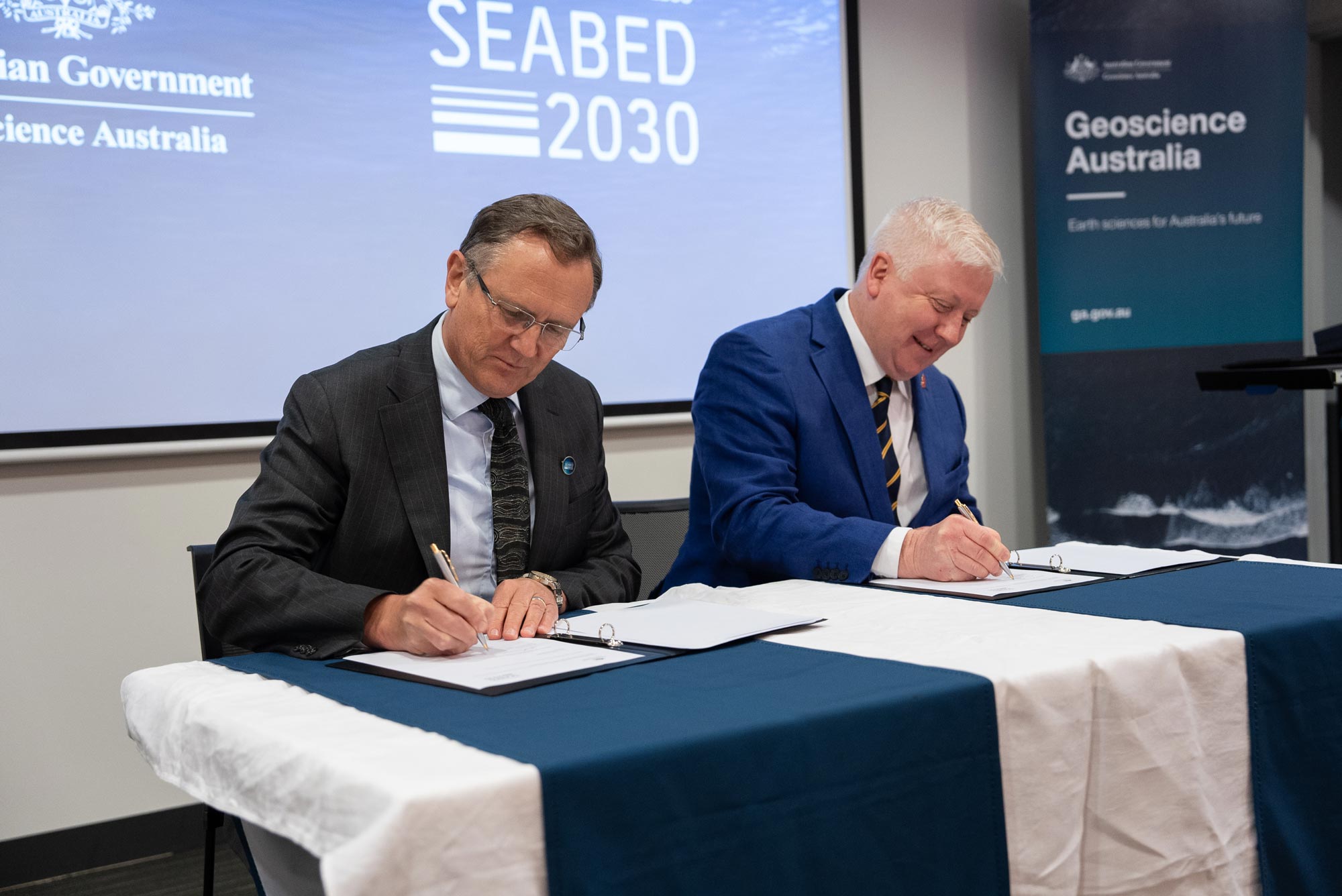 CEO of Geoscience Australia, Dr James Johnson, and Director of Seabed 2030, Jamie McMichael-Phillips, sign the Memorandum of Understanding.