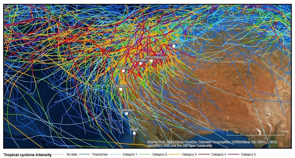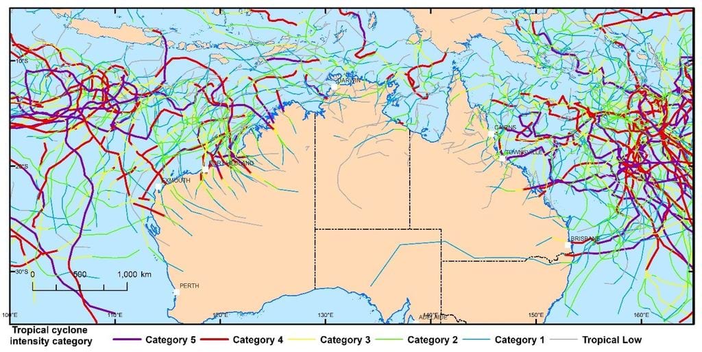 Historical tropical cyclones in the Western Australian region 1907–2017. Tracks are coloured by the estimated intensity category, based on minimum central pressure. Source: Bureau of Meteorology/IBTrACS.