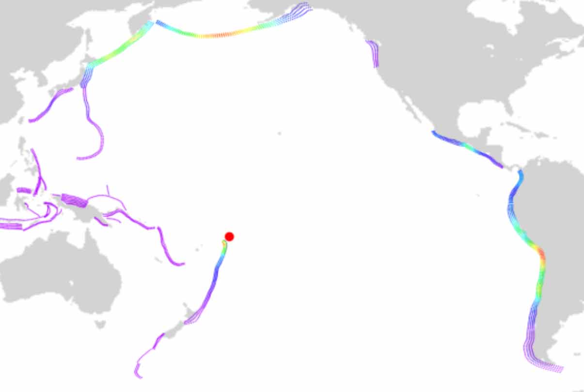 A global map with probabilistic tsunami scenarios superimposed with varying colour to indicated intensities.