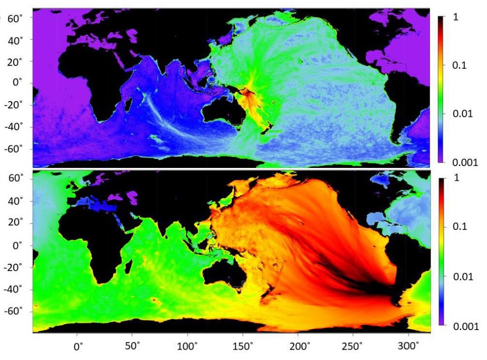 A global map with probabilistic tsunami scenarios superimposed with varying colour to indicated intensities.