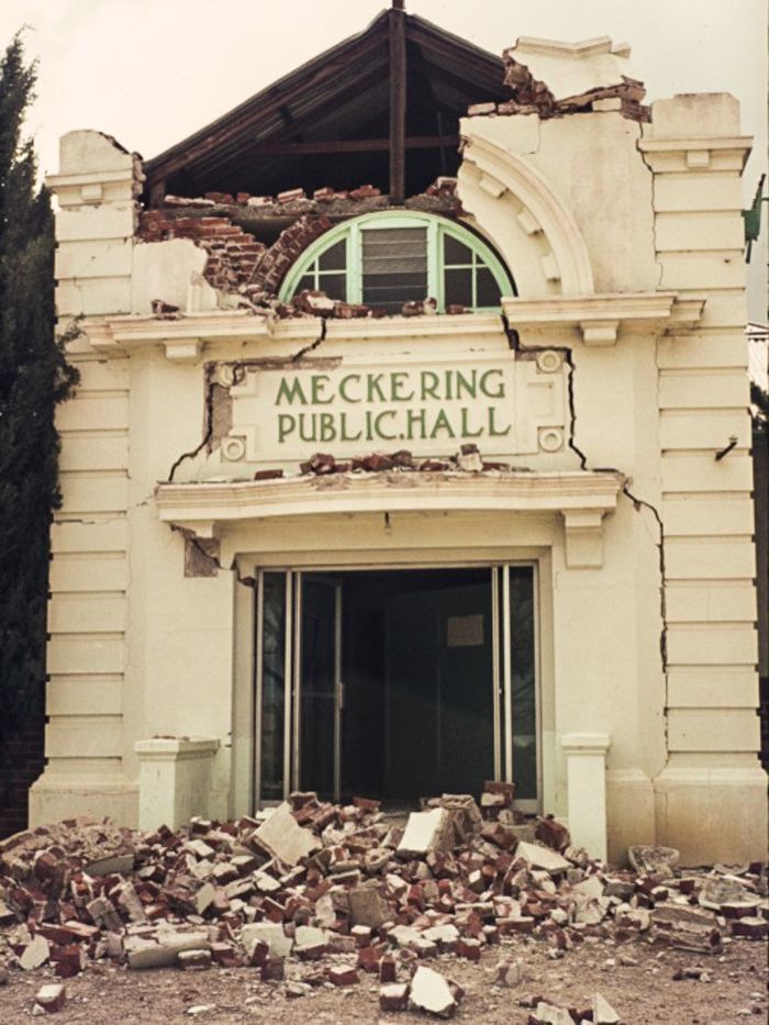 Historic building damage to Meckering Public Hall resulting from the 1968 magnitude-6.5 Meckering earthquake. Image: State Library of Western Australia