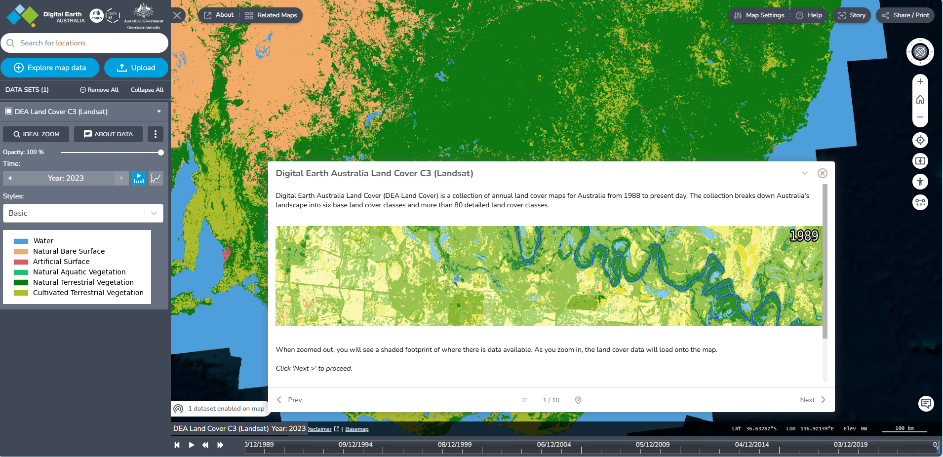 Learn about our ever-changing land and water with DEA Land Cover, which translates over 35 years of satellite imagery into evidence of how Australia's land, vegetation and waterbodies have changed over time.