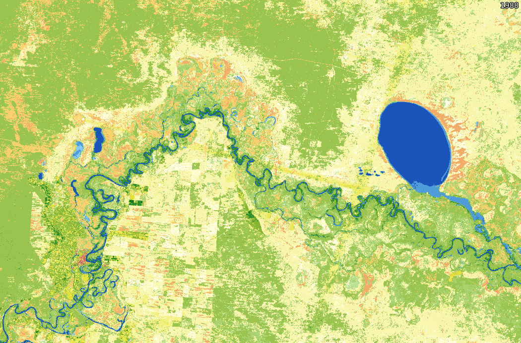 See how the Murray River and its surrounds vary over three decades at the intersection of New South Wales, Victoria and South Australia