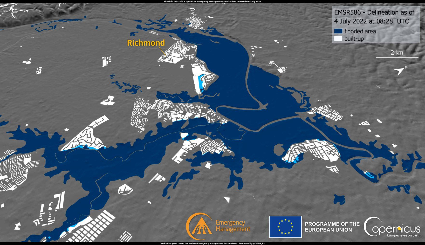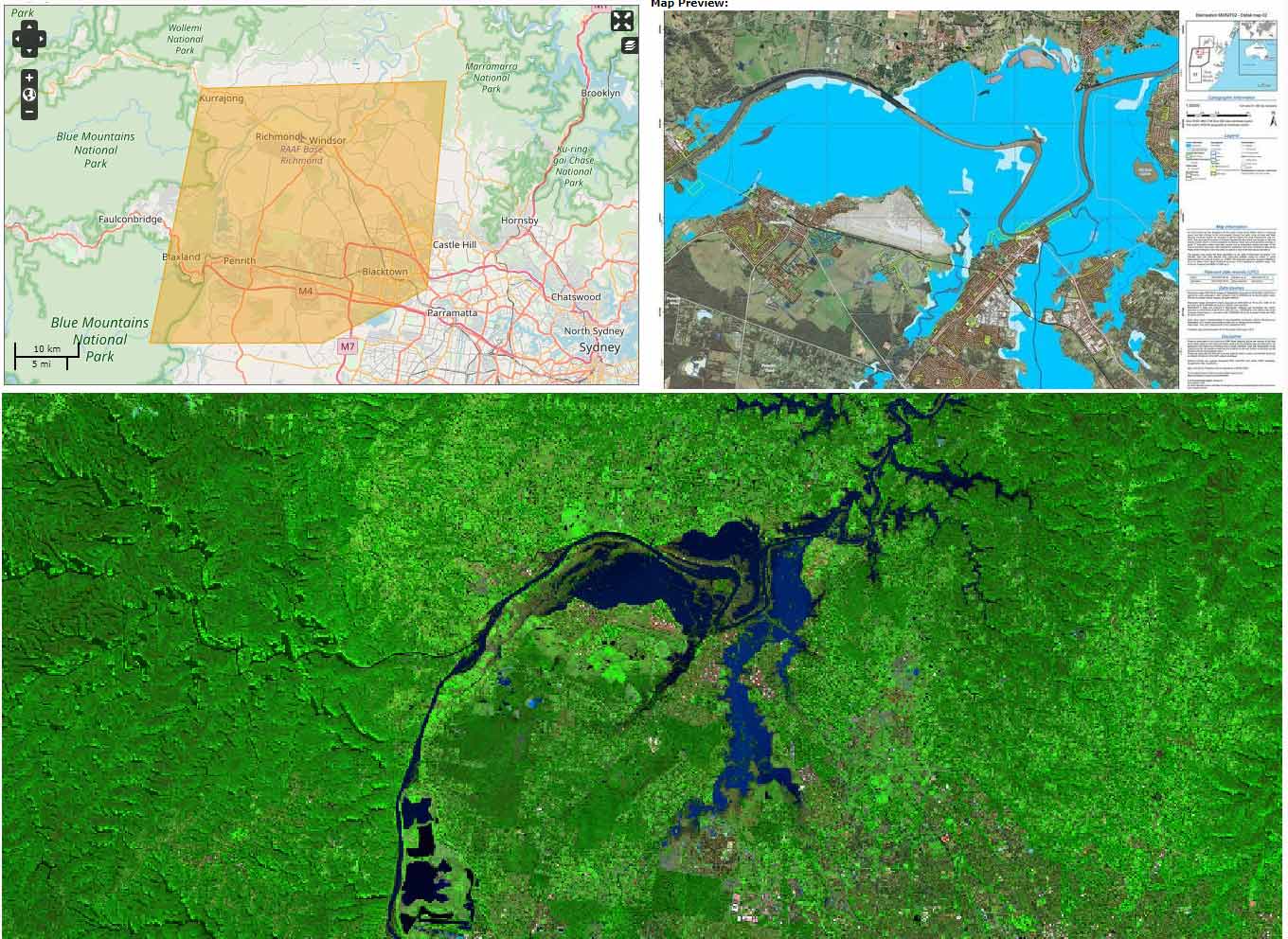 Copernicus Emergency Management System Delineation Product, Monitoring 3, version 1, release 1, RTP Map #02 [EMSR586] showing Richmond, NSW flooded in July, 2022 (top) and Sentinel Hub image of Hawkesbury River flooding Richmond and Windsor areas.