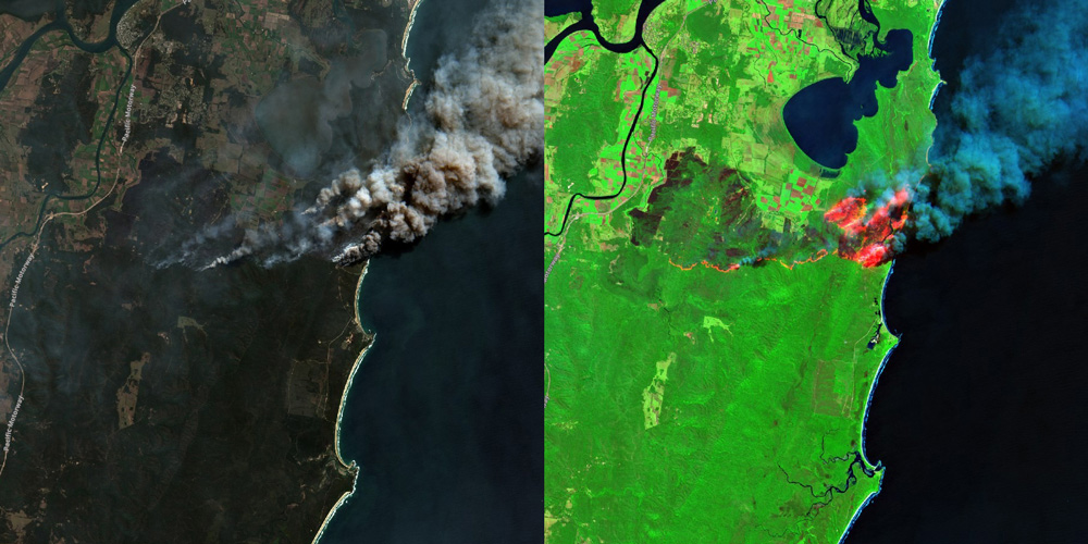 Side-by-side comparison of a bushfire at Yamba, NSW on in September, 2019 using a true colour image (left) and SWIR (short-wave infrared, right), revealing the extent of the fire front. Sentinel 2 L2A True colour and L2A SWIR