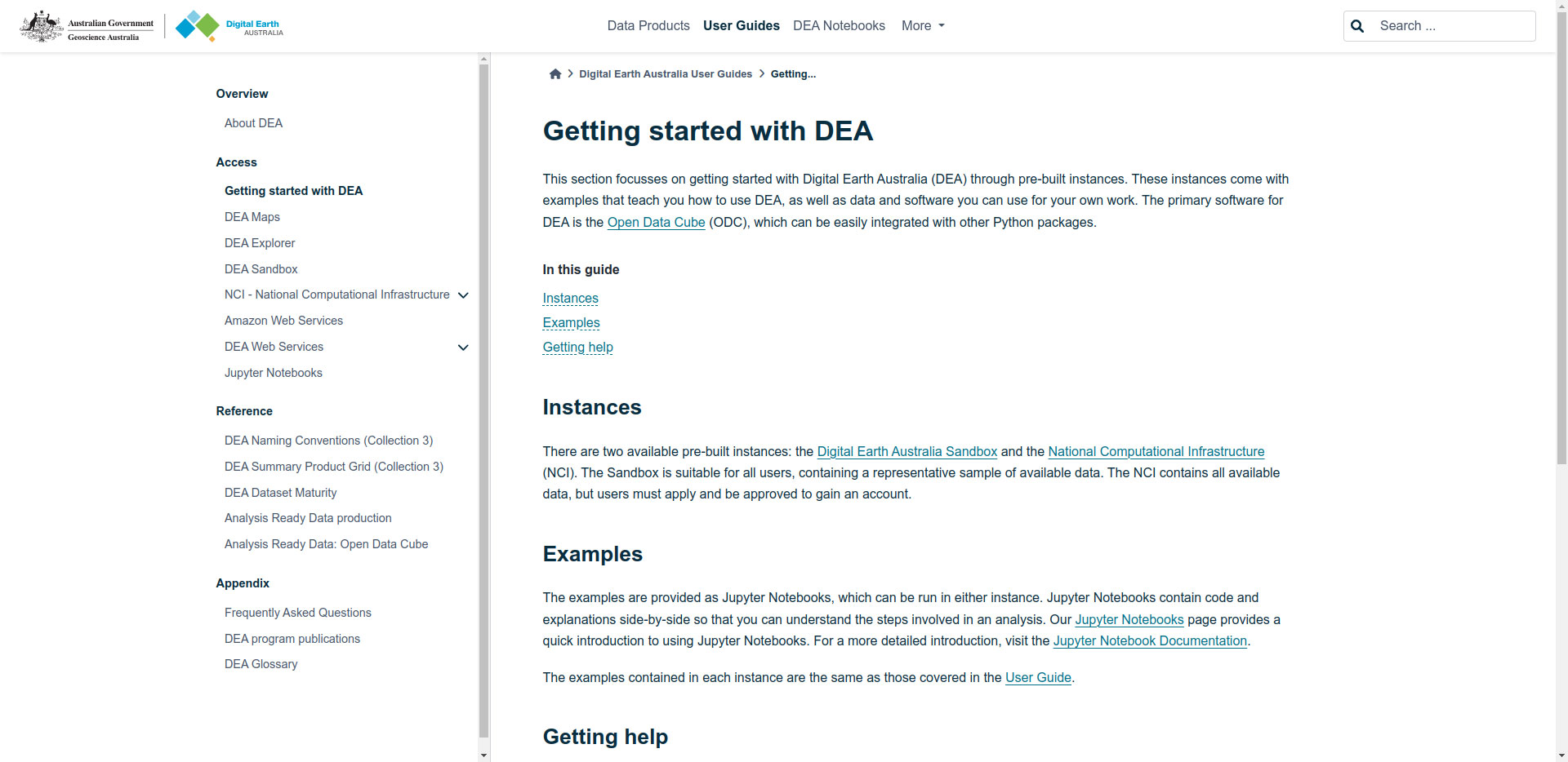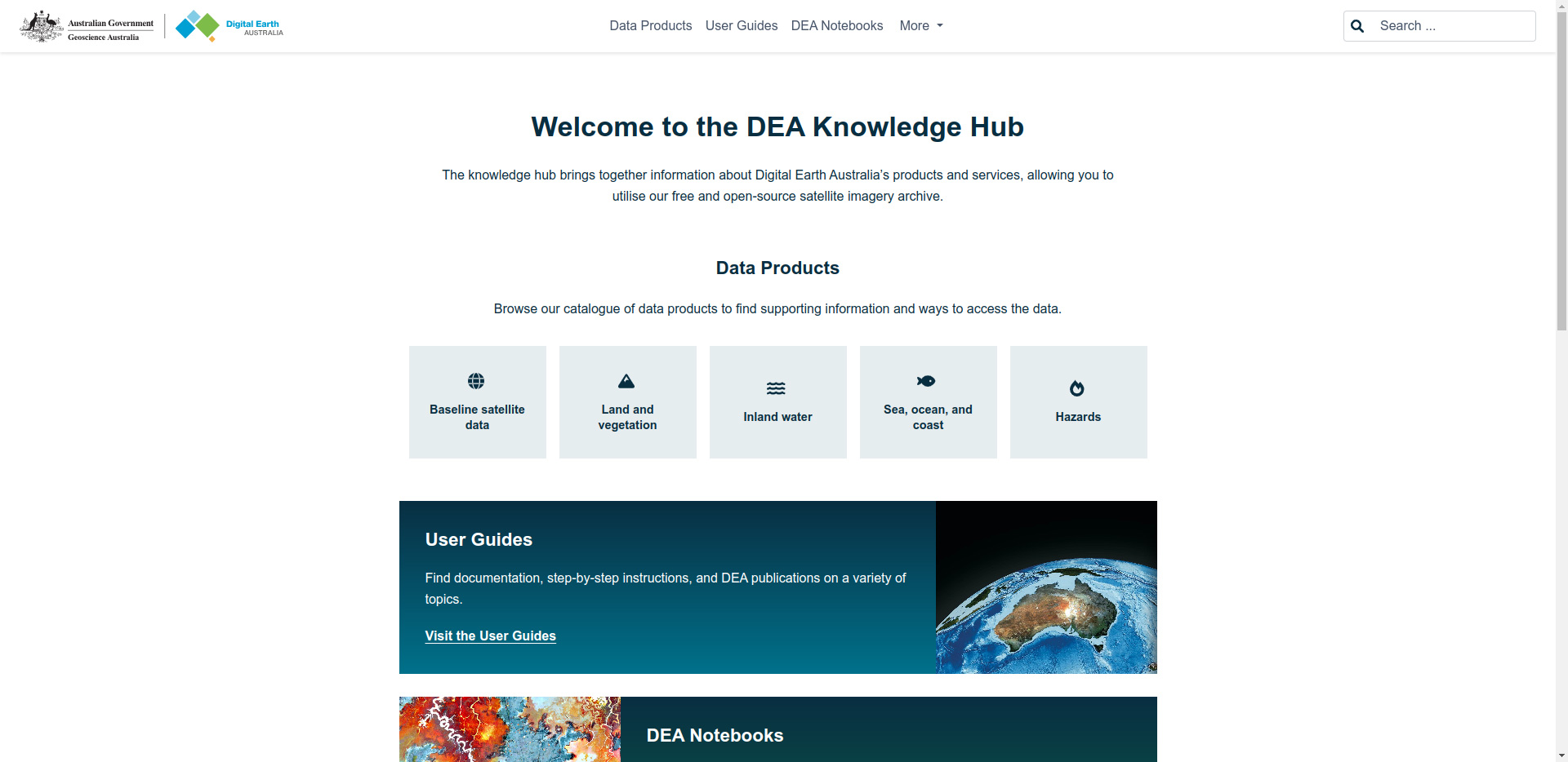 The Knowledge Hub is where you will find information on Digital Earth Australia’s (DEA) products and services. It brings together our User Guides, Data Product information, DEA Notebooks, and more into one central location.