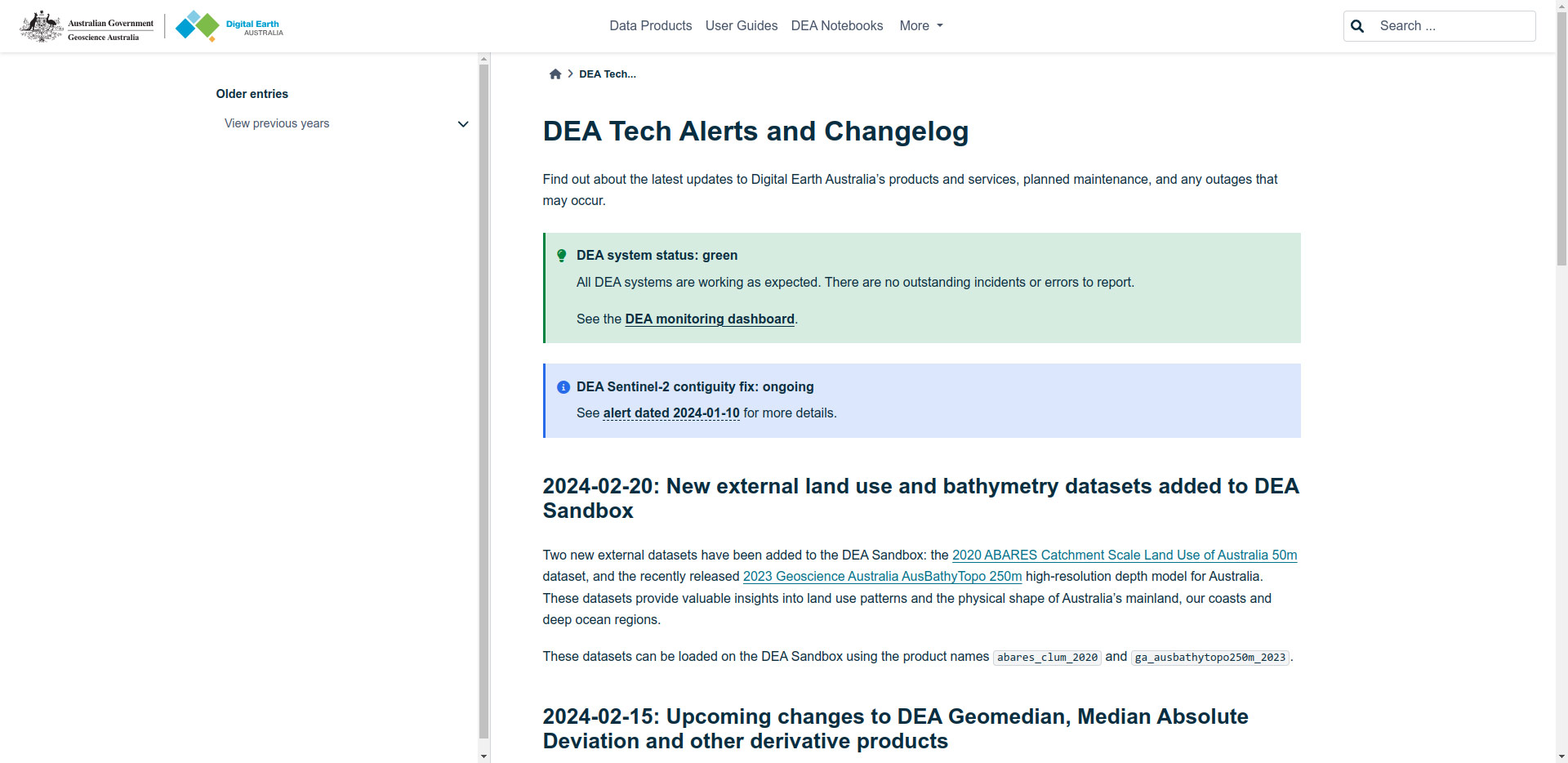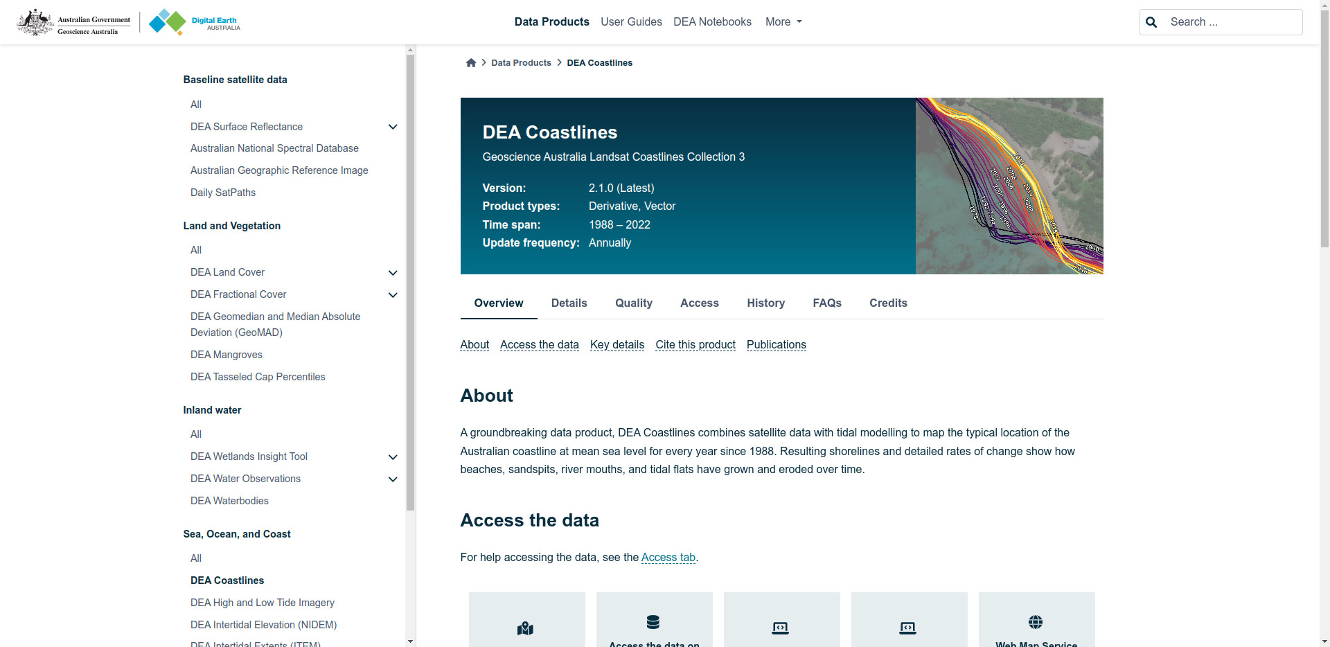 This is where you’ll find information about DEA’s data products (a.k.a. “product metadata”, the information was previously located on the Content Management Interface site). For example, on the DEA Coastlines page there is technical information, links to access the data, FAQs, and so much more.