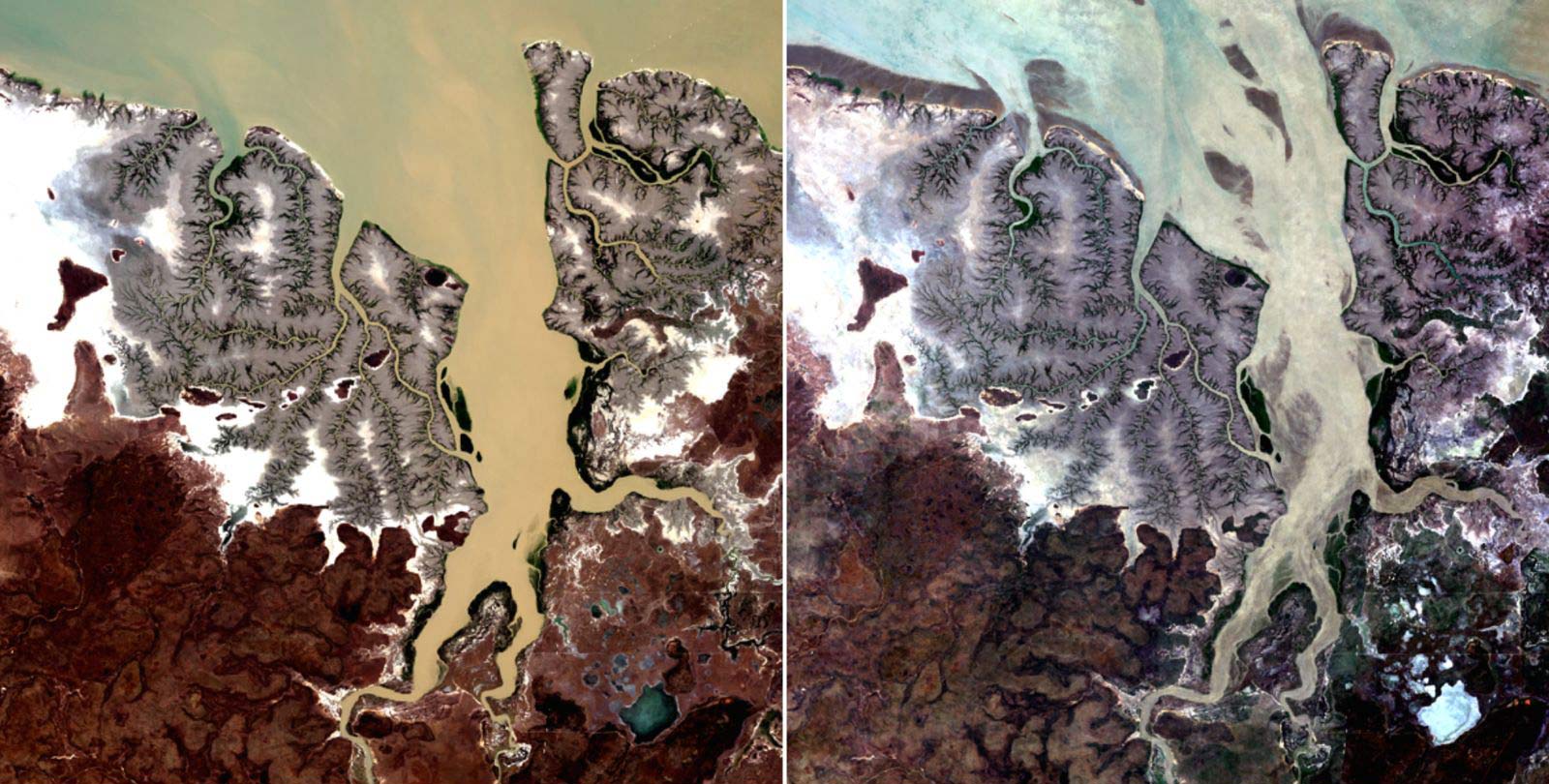 Composite Landsat satellite images for the Keep River estuary at high (left) and low tide (right). At low tide, large areas of sand/mud bank are exposed inside the channel.