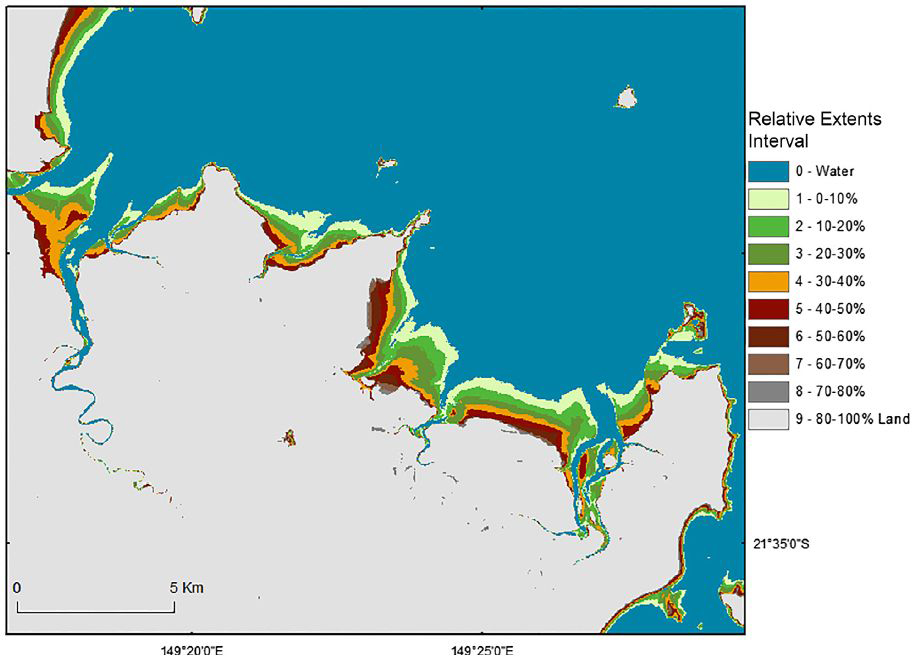 On average there were over 850 Landsat observations for each 25 sq m location (pixel) in the coastal study area. Those observations were sorted by tidal stage and then binned into nine categories starting from the lowest 10% of observed tidal range and so on in 10% intervals until the ninth interval which included the highest tidal stages from 80–100% of the observed tidal range.