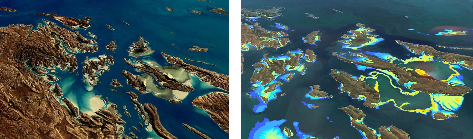 Talbot Bay in the Kimberley — without (left) and with (right) the overlay identifying the area’s intertidal zone and onshore reefs.