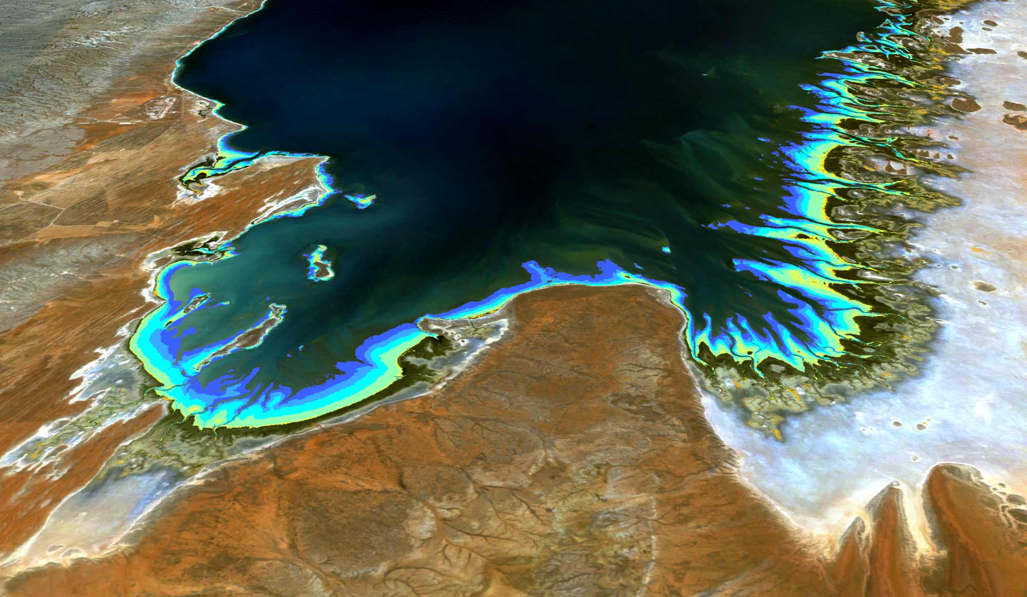 The DEA Intertidal Extents map overlaid on a Landsat 8 image of Exmouth Gulf in Western Australia. This area has an extensive intertidal zone.