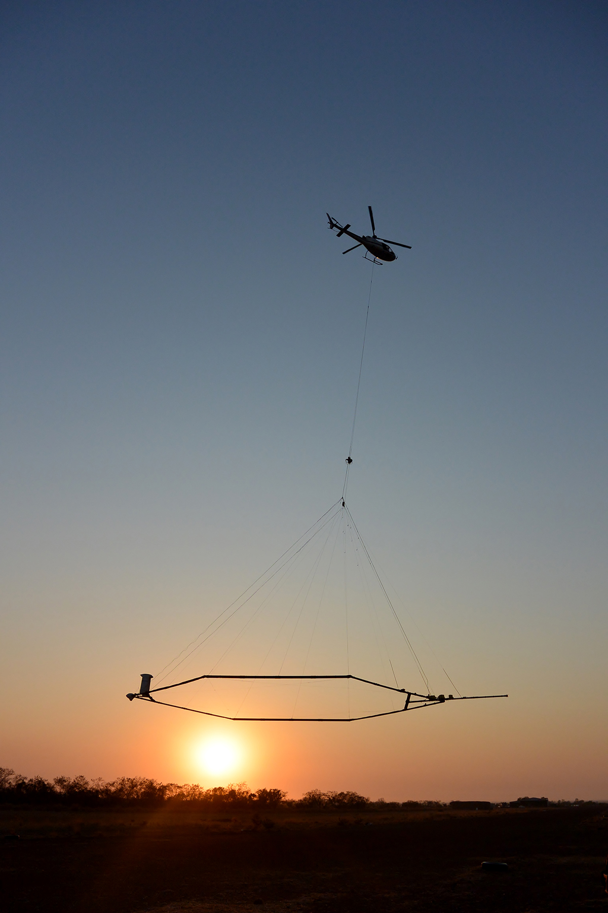AEM data are collected by transmitting an electromagnetic signal from a system attached to a plane or helicopter. The signal induces eddy currents in the ground which are detected by receiver coils towed below and behind the aircraft. AEM techniques can detect variations in the conductivity of the ground to a depth of several hundred metres, depending on the acquisition system and geological and hydrogeological stratigraphy. AEM surveys require complex processing to allow interpretation and, therefore, are usually designed to detect particular subsurface targets which are based on a perceived conductivity contrast, for example: