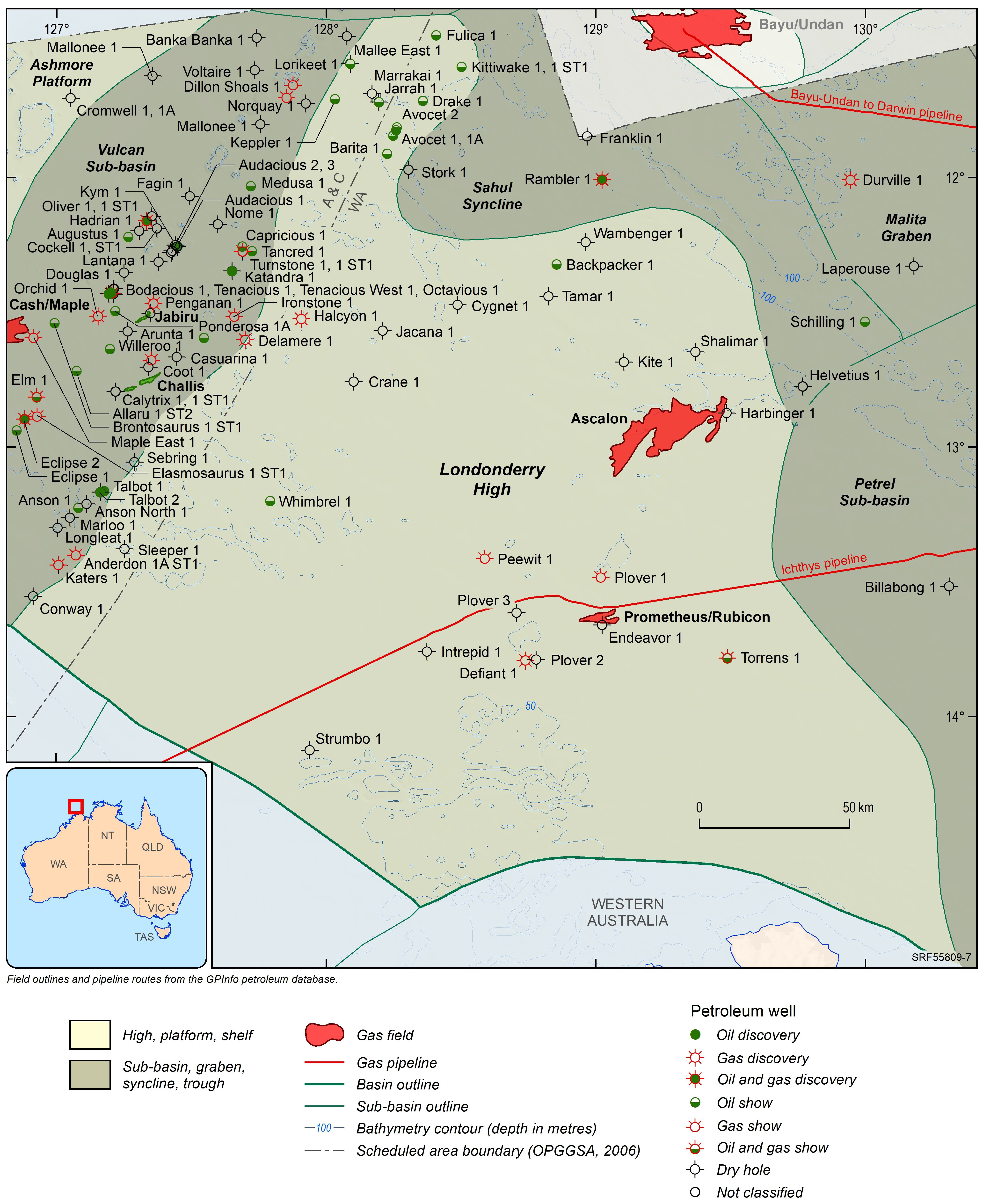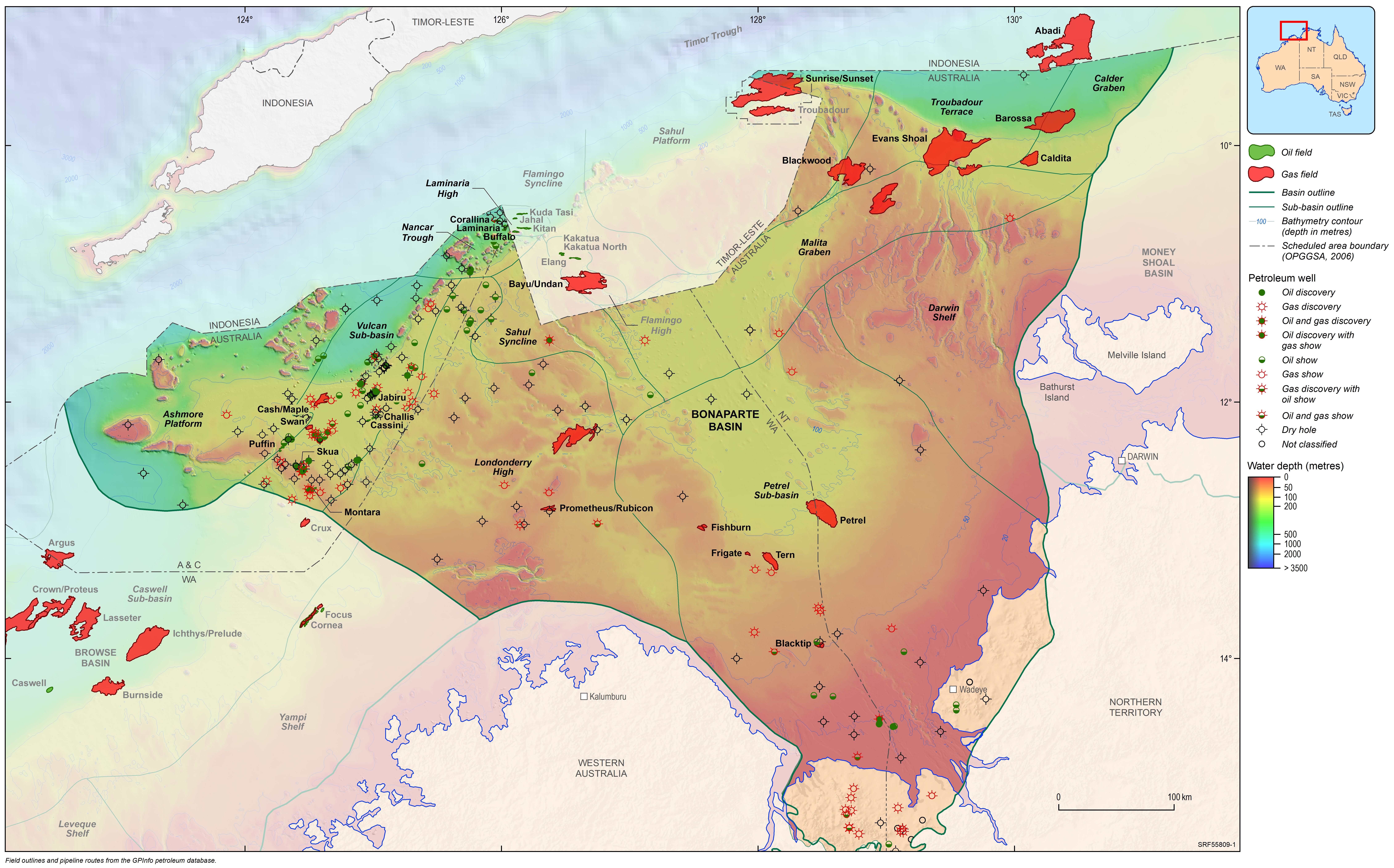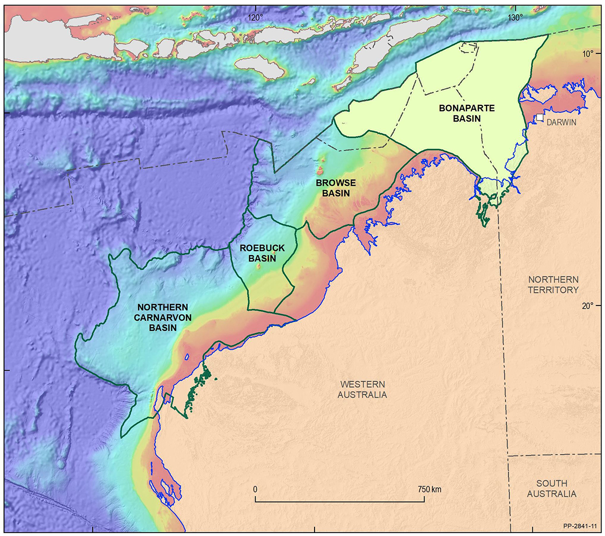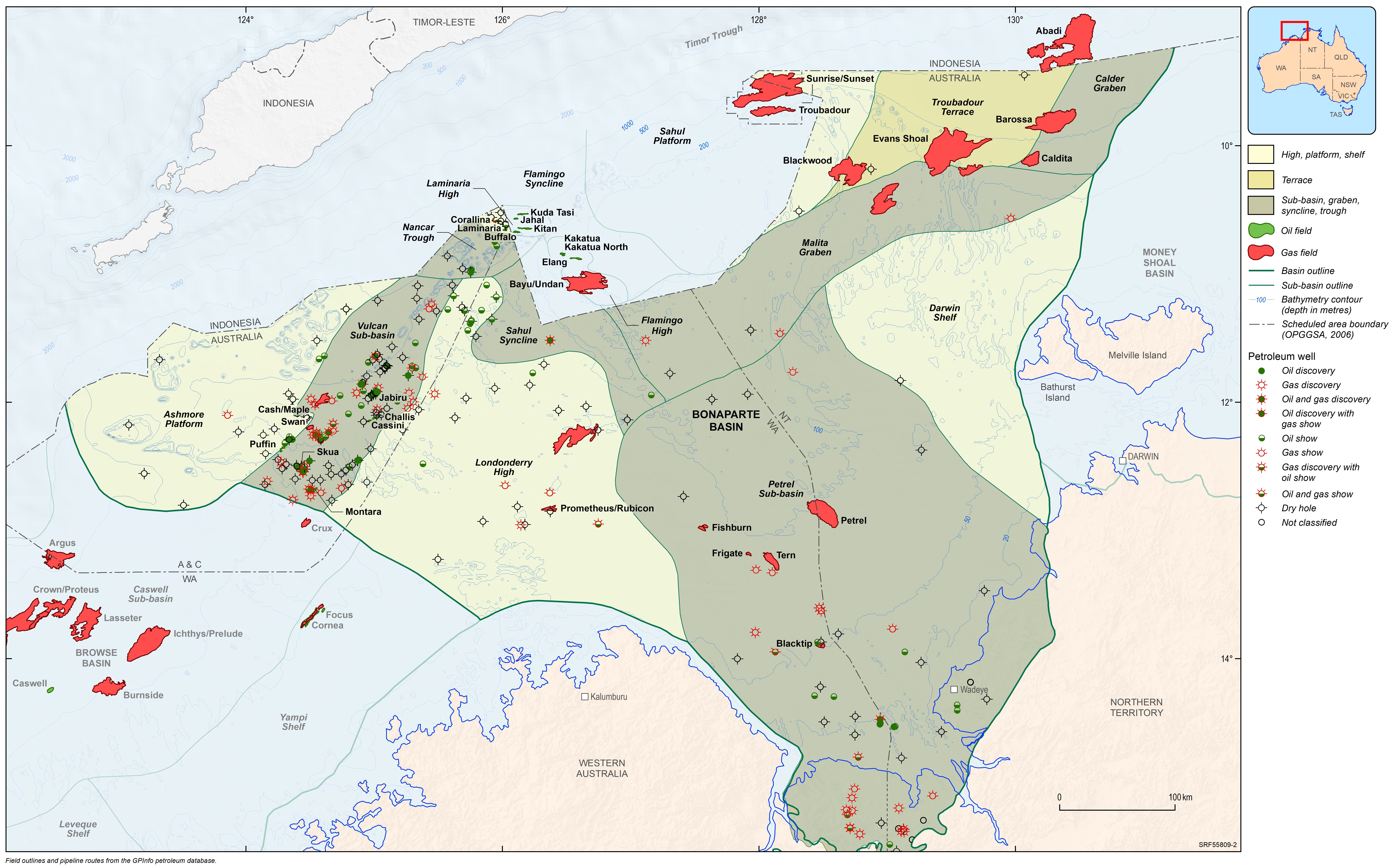The Bonaparte Basin represents the easternmost offshore province of Australia’s North West Shelf comprising also the Browse, Roebuck, Offshore Canning and Northern Carnarvon basins (Figure 1). Located predominantly offshore (Figure 2), the Bonaparte Basin contains a Paleozoic, Mesozoic and Cenozoic sedimentary succession that exceeds 15 000 m in thickness in the southern portion (“Petrel Sub-basin”) and a Mesozoic-Cenozoic basin fill in the northern part. The basin has been an established oil and gas province since the development of the Bayu-Undan and Blacktip gas discoveries (1995 and 2001 respectively) and first oil discoveries in the Vulcan Sub-basin (Jabiru in 1986; Challis and Cassini in1989).