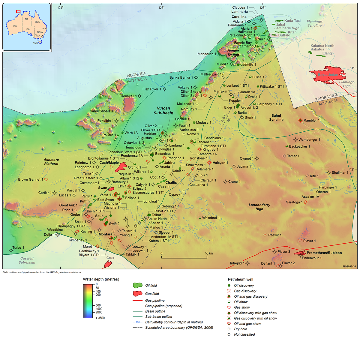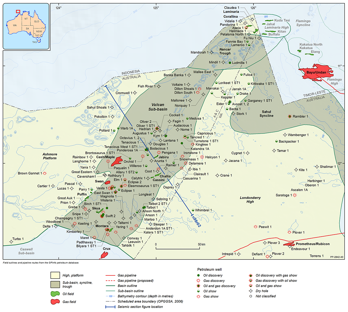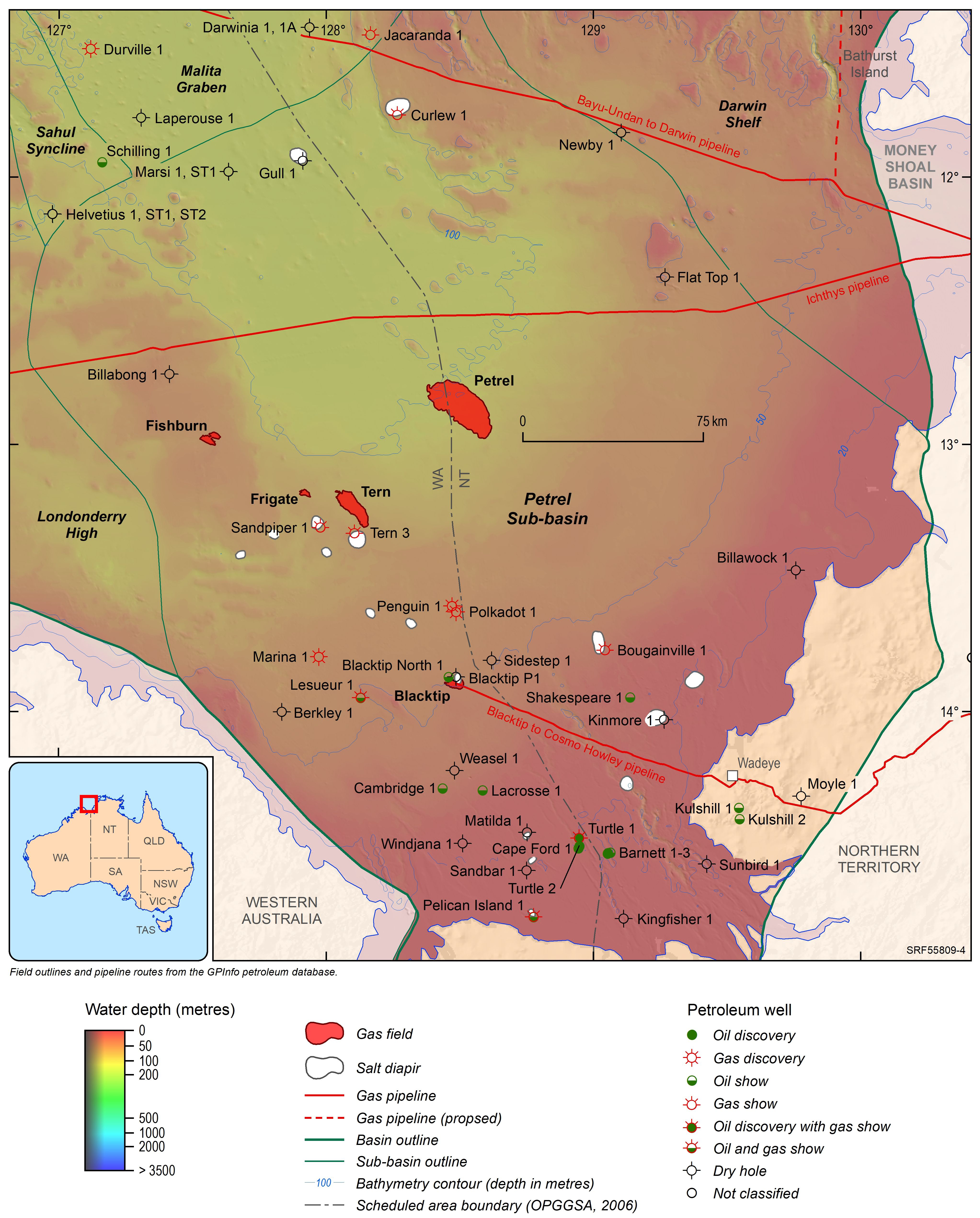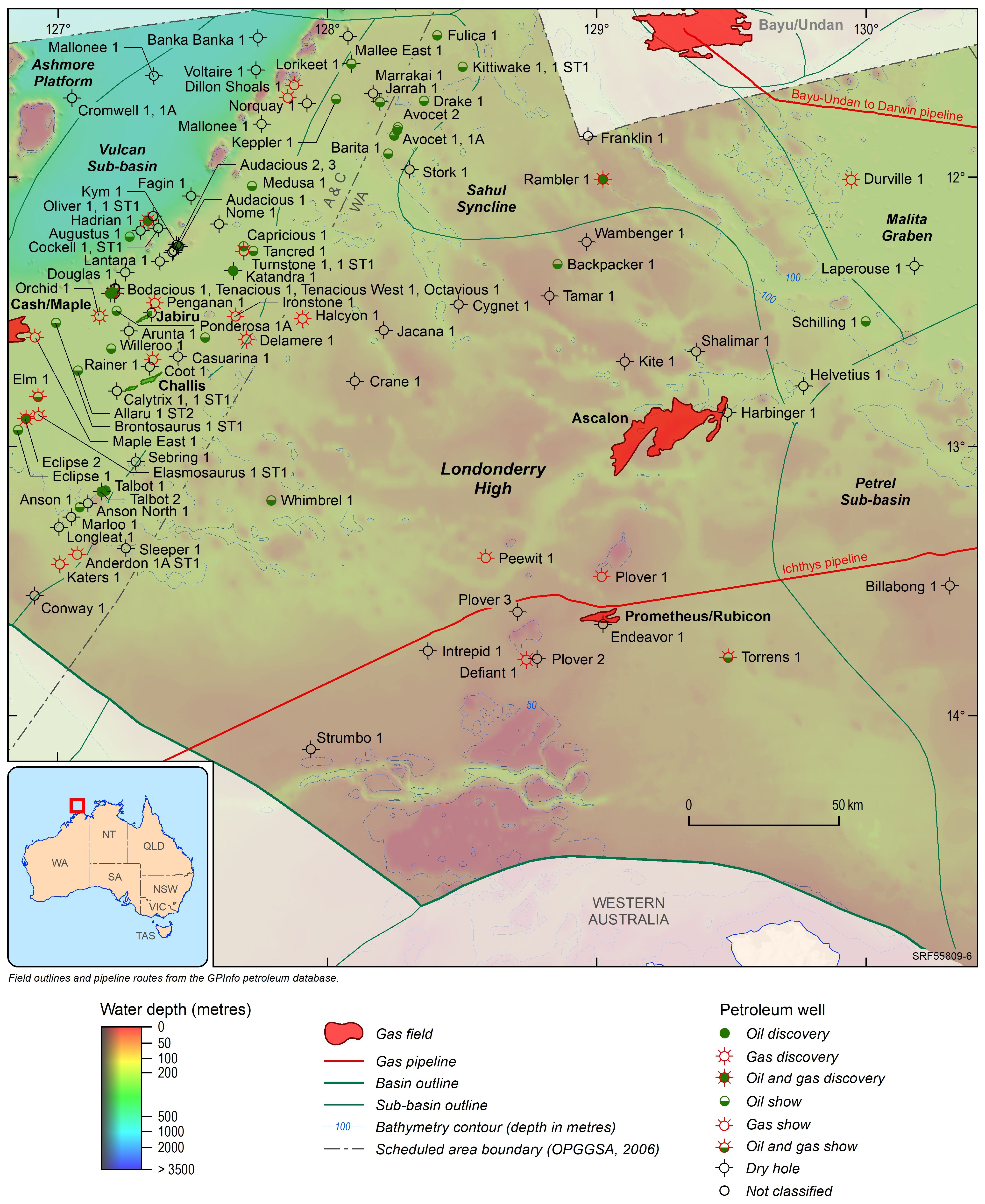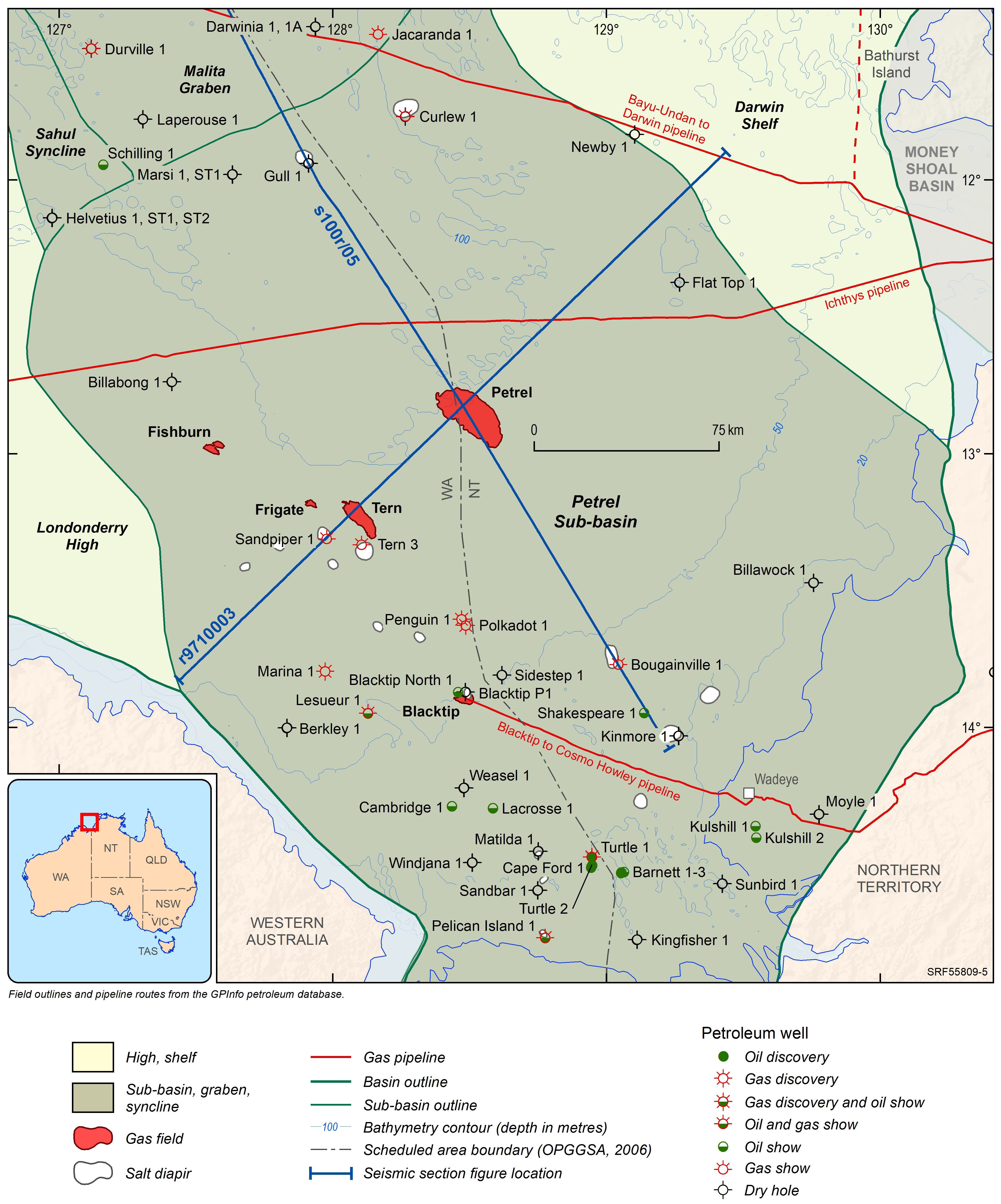 The Bonaparte Basin represents the easternmost offshore province of Australia’s North West Shelf comprising also the Browse, Roebuck, Offshore Canning and Northern Carnarvon basins (Figure 1). Located predominantly offshore (Figure 2), the Bonaparte Basin contains a Paleozoic, Mesozoic and Cenozoic sedimentary succession that exceeds 15 000 m in thickness in the southern portion (“Petrel Sub-basin”) and a Mesozoic-Cenozoic basin fill in the northern part. The basin has been an established oil and gas province since the development of the Bayu-Undan and Blacktip gas discoveries (1995 and 2001 respectively) and first oil discoveries in the Vulcan Sub-basin (Jabiru in 1986; Challis and Cassini in1989).