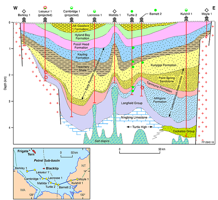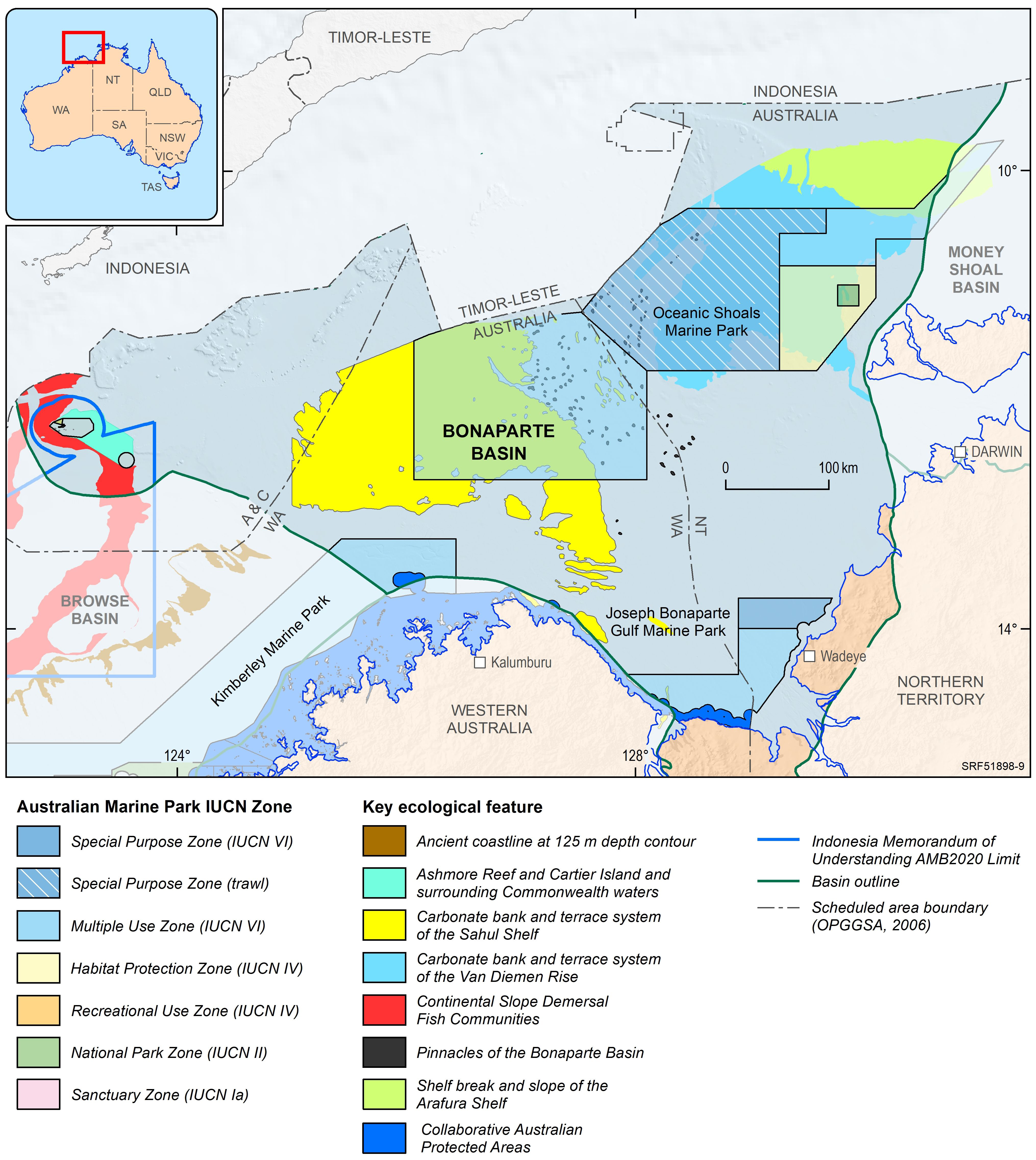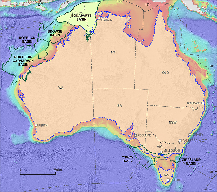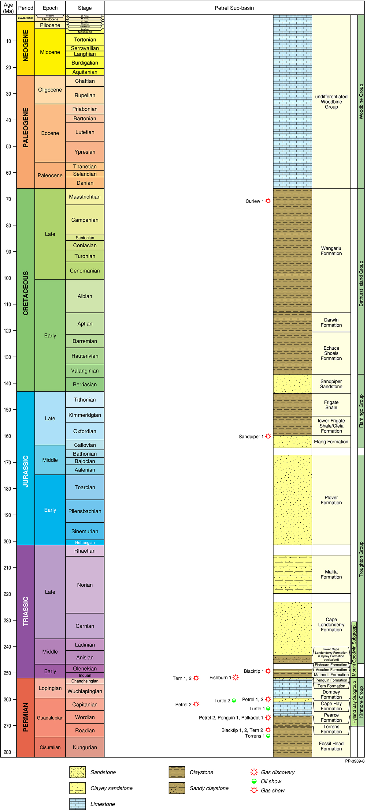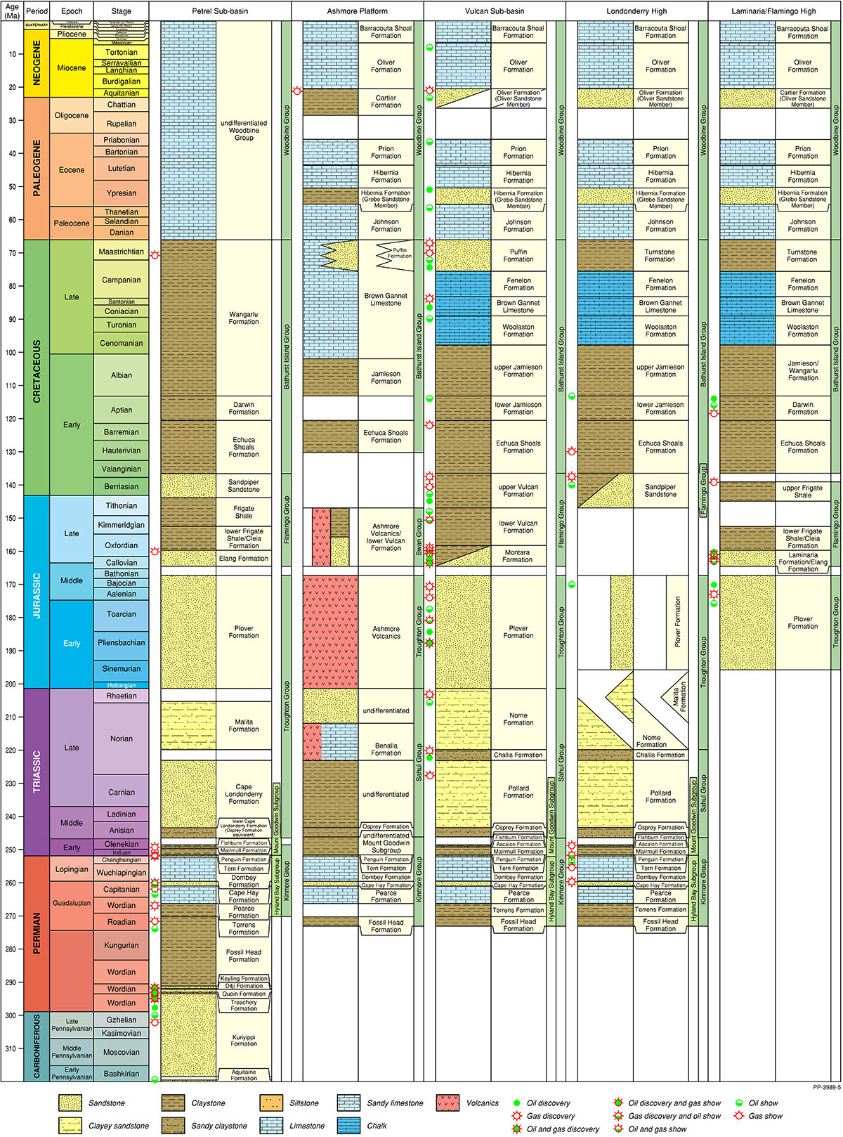 The Bonaparte Basin represents the easternmost offshore province of Australia’s North West Shelf comprising also the Browse, Roebuck, Offshore Canning and Northern Carnarvon basins (Figure 1). Located predominantly offshore (Figure 2), the Bonaparte Basin contains a Paleozoic, Mesozoic and Cenozoic sedimentary succession that exceeds 15 000 m in thickness in the southern portion (“Petrel Sub-basin”) and a Mesozoic-Cenozoic basin fill in the northern part. The basin has been an established oil and gas province since the development of the Bayu-Undan and Blacktip gas discoveries (1995 and 2001 respectively) and first oil discoveries in the Vulcan Sub-basin (Jabiru in 1986; Challis and Cassini in1989).