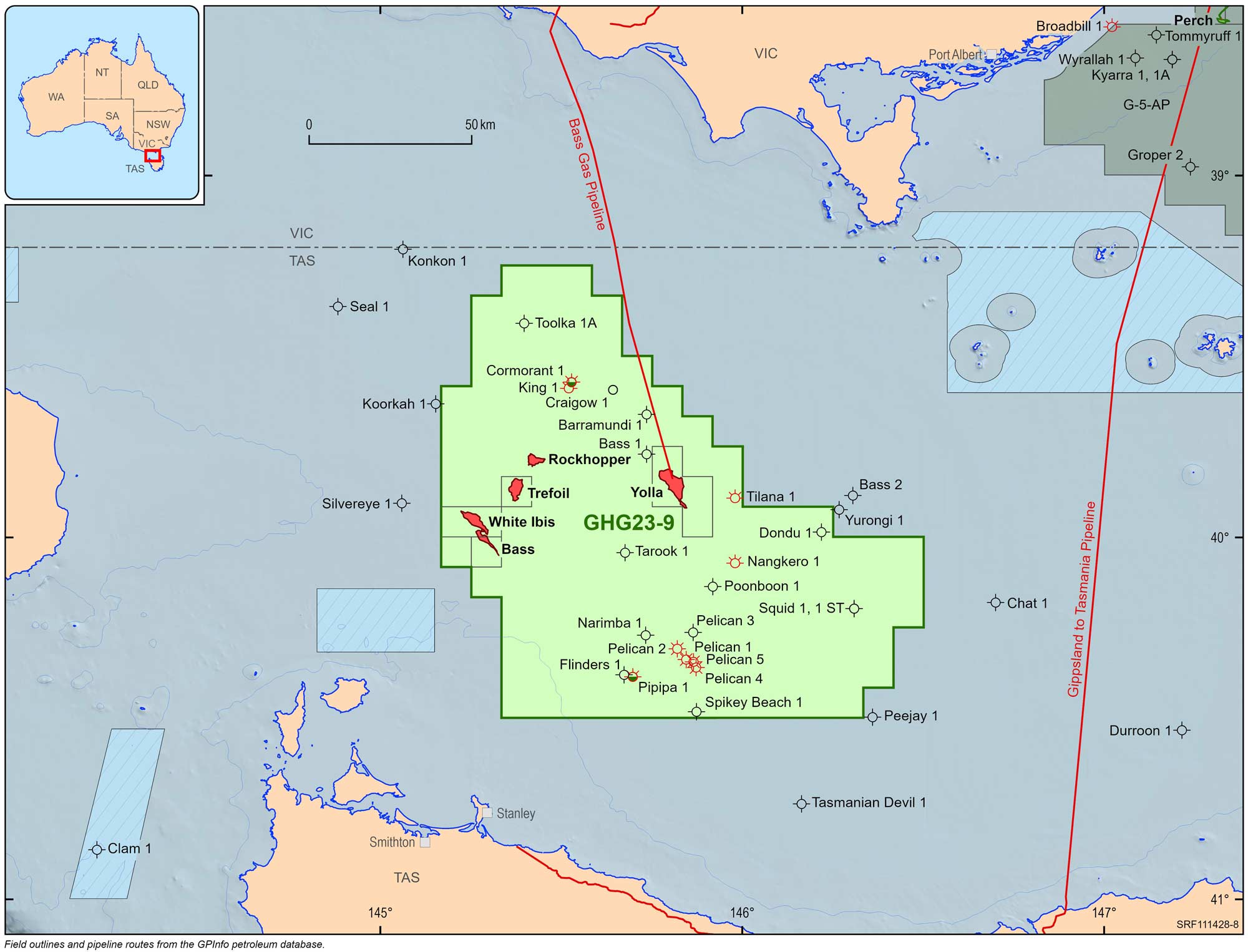 - Storage targets: primarily depleted fields reservoired in the upper Latrobe Group (Upper Cretaceous to Eocene) and possible deeper seated saline aquifers