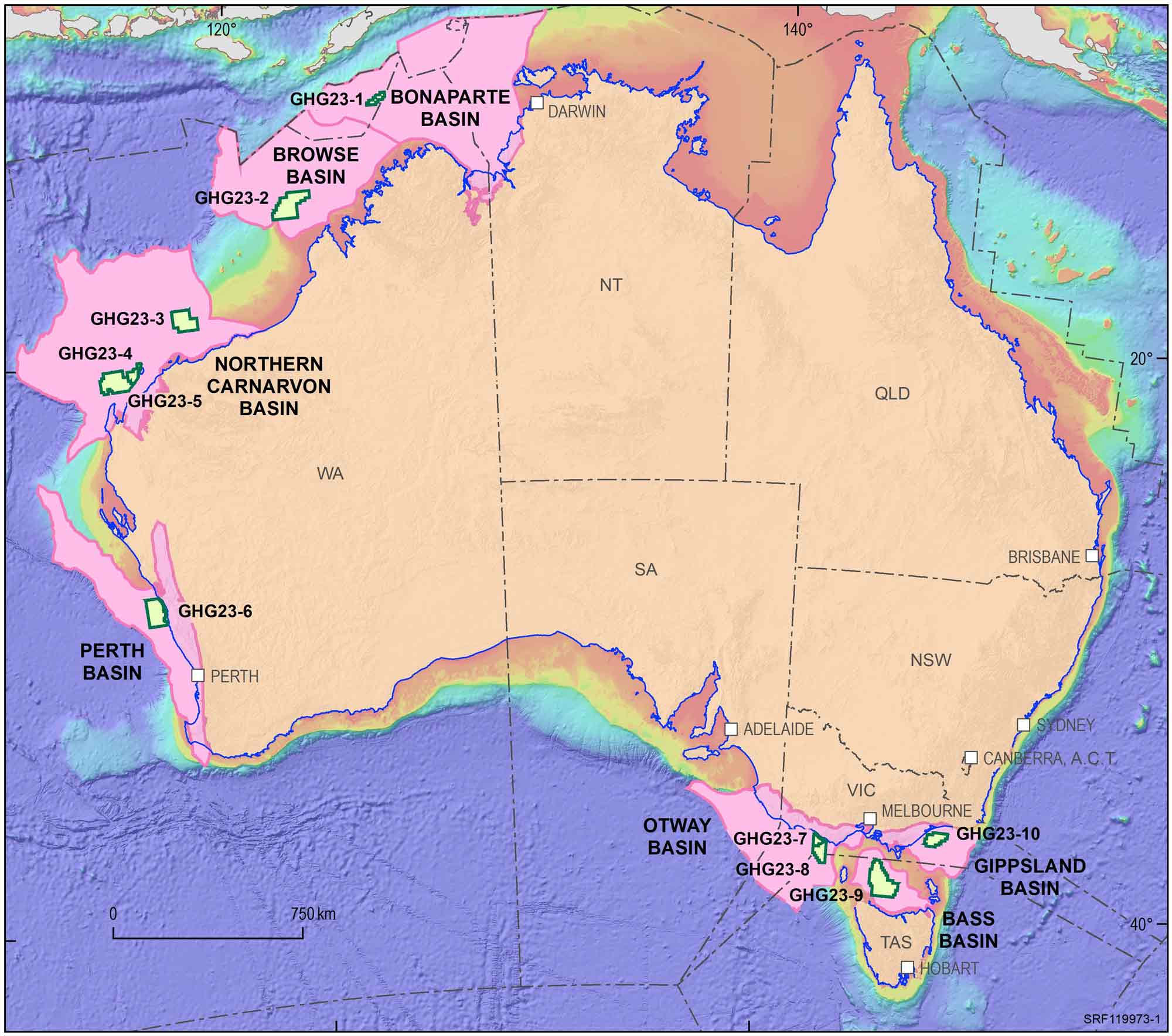 The 2023 Offshore Greenhouse Gas Storage (GHG) Acreage Release comprises 10 areas located across seven sedimentary basins in Commonwealth waters including the Bonaparte, Browse, Northern Carnarvon, Perth, Otway, Bass and Gippsland basins. The areas are open for work program bidding until 28 November 2023. Companies awarded a permit must meet a range of requirements before starting any offshore exploration activities in Australian Commonwealth waters. We have partnered with the Department of Industry, Science and Resources to provide geological information to support this release. Please refer to the Department of Industry, Science and Resources for more information about the release areas, including maps, shapefiles, bidding instructions and the offshore GHG acreage release process.