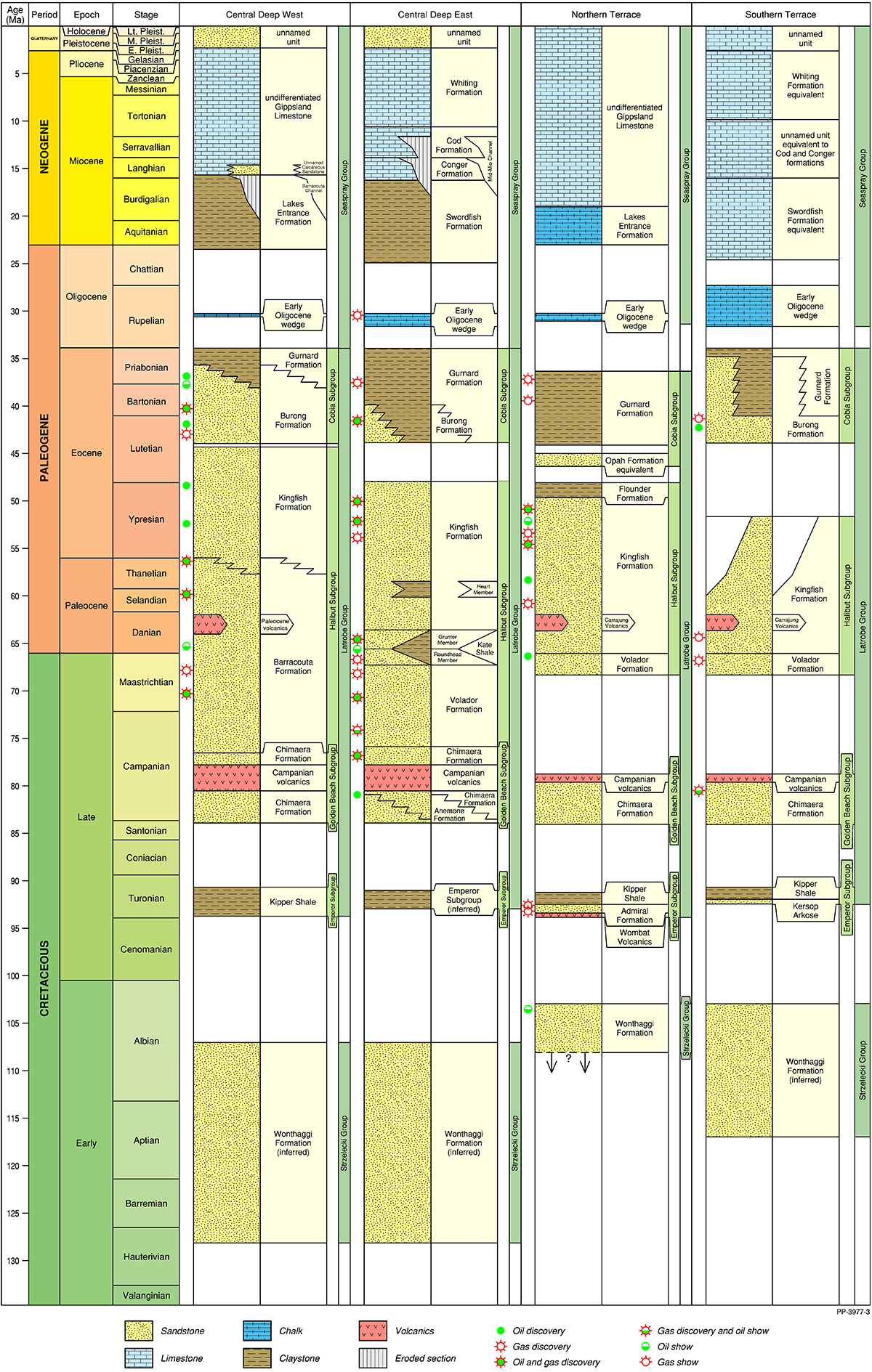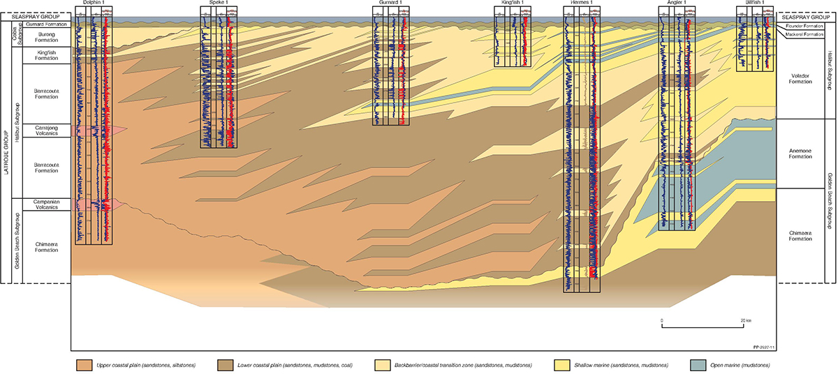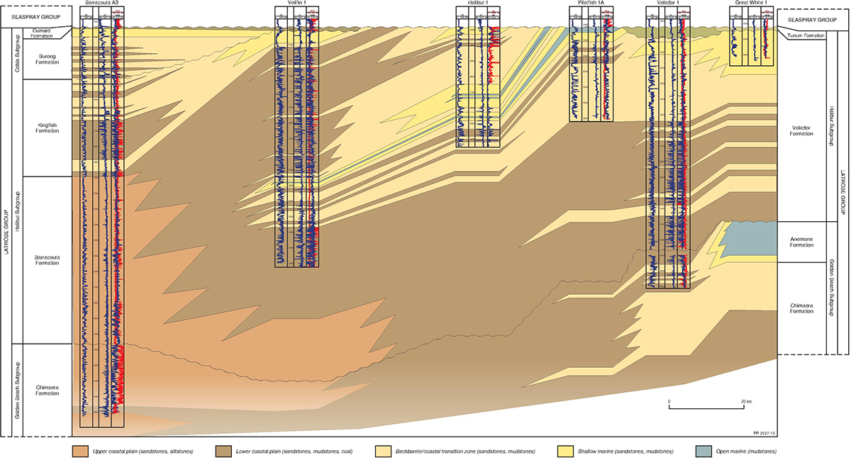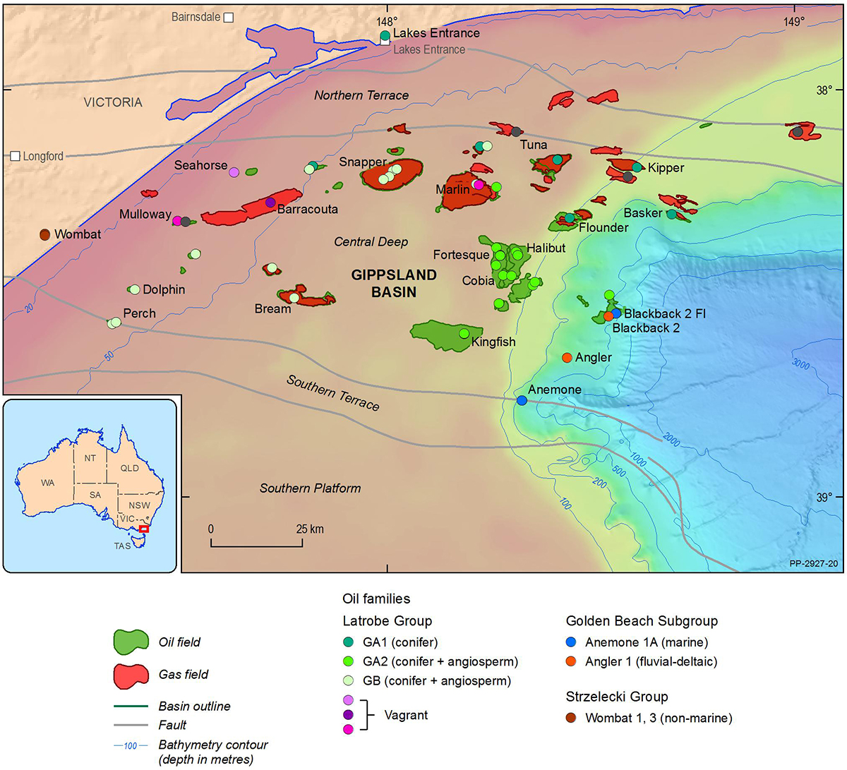 The Gippsland Basin in southeastern Australia is located about 200 km east of the city of Melbourne, covering about 46 000 km2, of which two thirds are located offshore (Figure 1). The Gippsland Basin is recognised as one of Australia’s premier hydrocarbon provinces, having continually produced oil and gas since the late 1960s. In May 2022, remaining reserves were estimated at 1.64 Tcf (1844.5 PJ) of natural gas and ethane, and 94 MMbbls (552.7 PJ) of oil and natural gas liquids (EnergyQuest, 2022). Several petroleum systems operate in the basin, with the largest oil and gas fields hosted by top-Latrobe Group (Eocene) shallow marine barrier sandstones, and additional discoveries made in intra-Latrobe Group (Upper Cretaceous–Paleocene) coastal plain and deltaic channel sandstones. Despite its mature status, parts of the basin remain underexplored and offer a variety of untested plays.