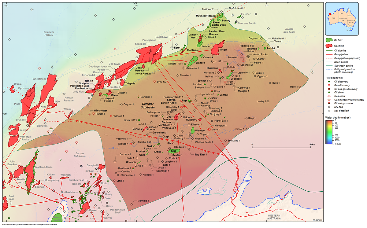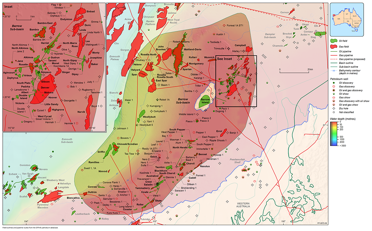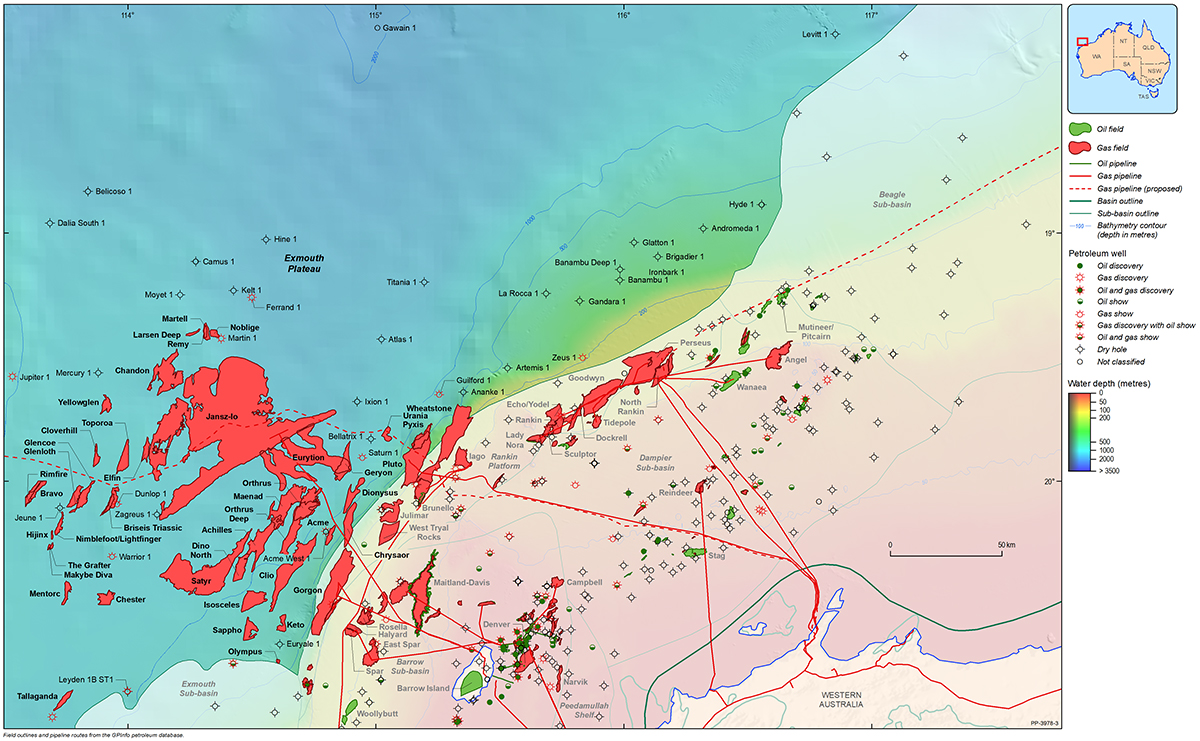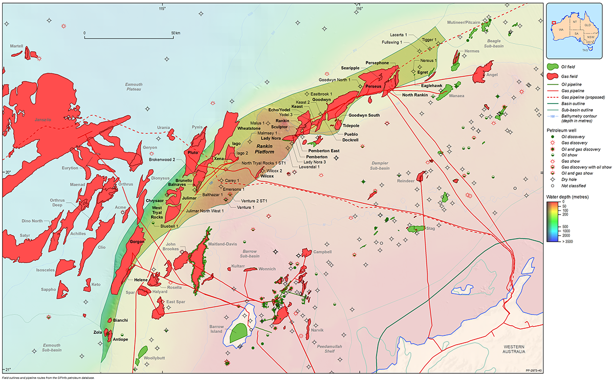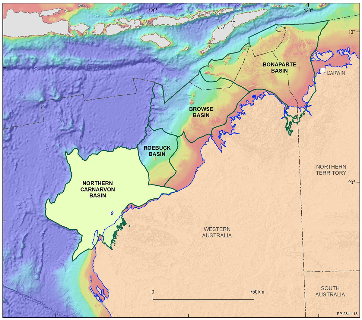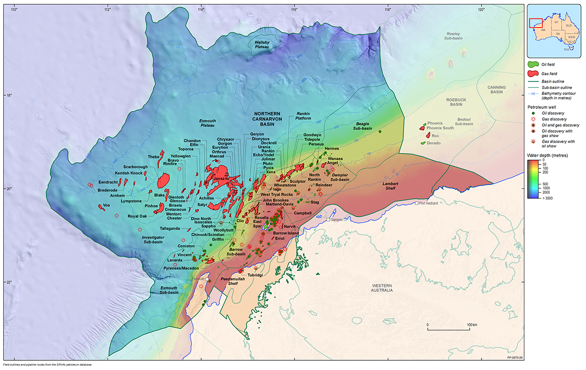 The Northern Carnarvon Basin represents the westernmost offshore province of Australia’s North West Shelf comprising also the Browse, Roebuck, Offshore Canning and Bonaparte basins (Figure 1). The Northern Carnarvon Basin covers an area of approximately 535 000 km2, predominantly offshore, in water depths of up to 4500 m (Figure 2). It contains a Paleozoic, Mesozoic and Cenozoic sedimentary succession up to 15 000 m thick, which is dominated by deltaic to marine siliciclastics and shelfal carbonates of Mesozoic to Cenozoic age. Two Mesozoic petroleum supersystems (Westralian 1 and Westralian 2) have been identified and numerous commercial oil and gas discoveries have been made within the basin. The basin is Australia’s premier hydrocarbon producing province and contains an established network of oil, condensate and gas production infrastructure (Figure 4). As of May 2022, the total proved and probable reserves for the Northern Carnarvon Basin are 3140 PJ (534 MMbbls) of oil and natural gas liquids and 50 982 PJ (45.33 Tcf) of natural gas and ethane (EnergyQuest, 2022).