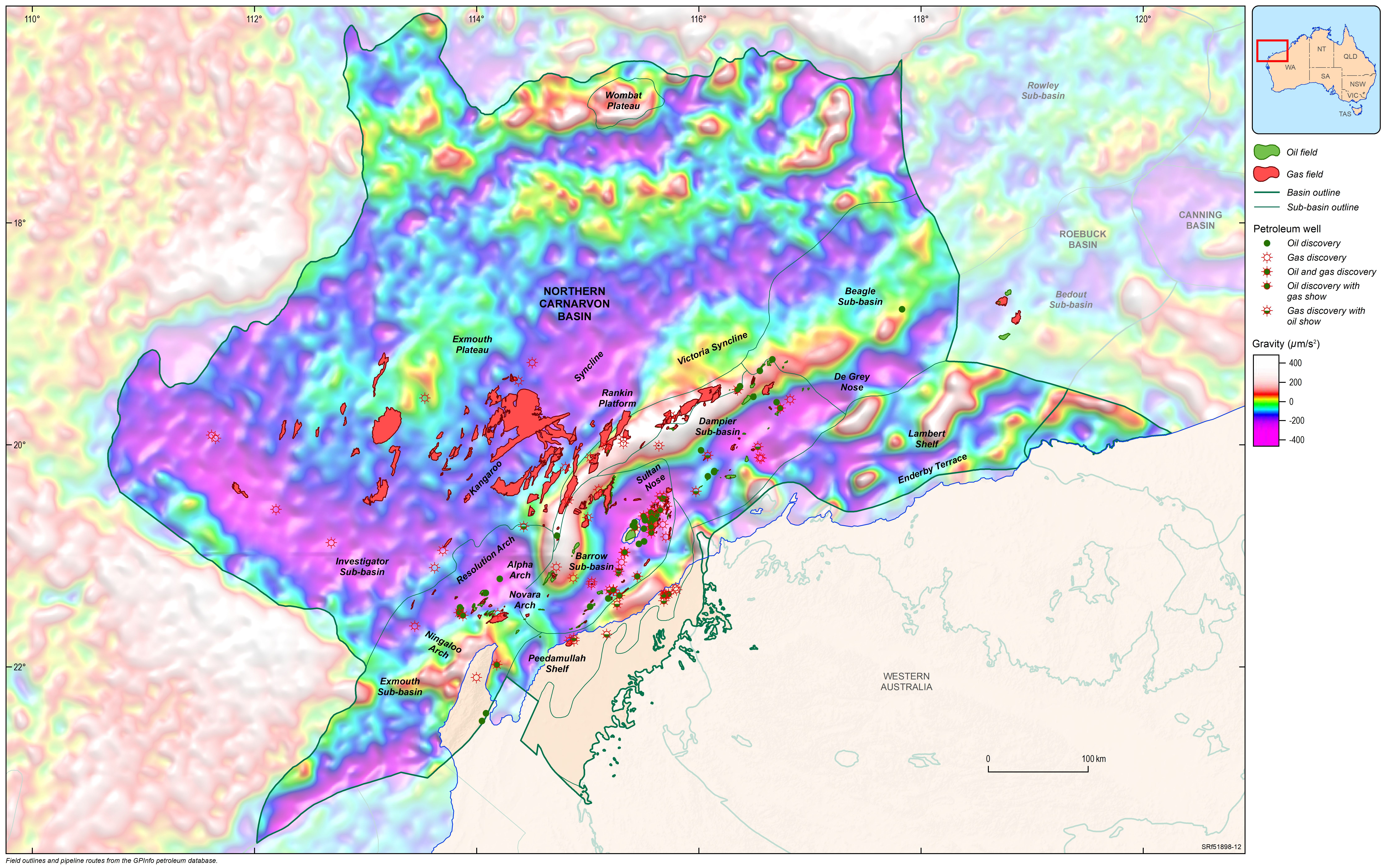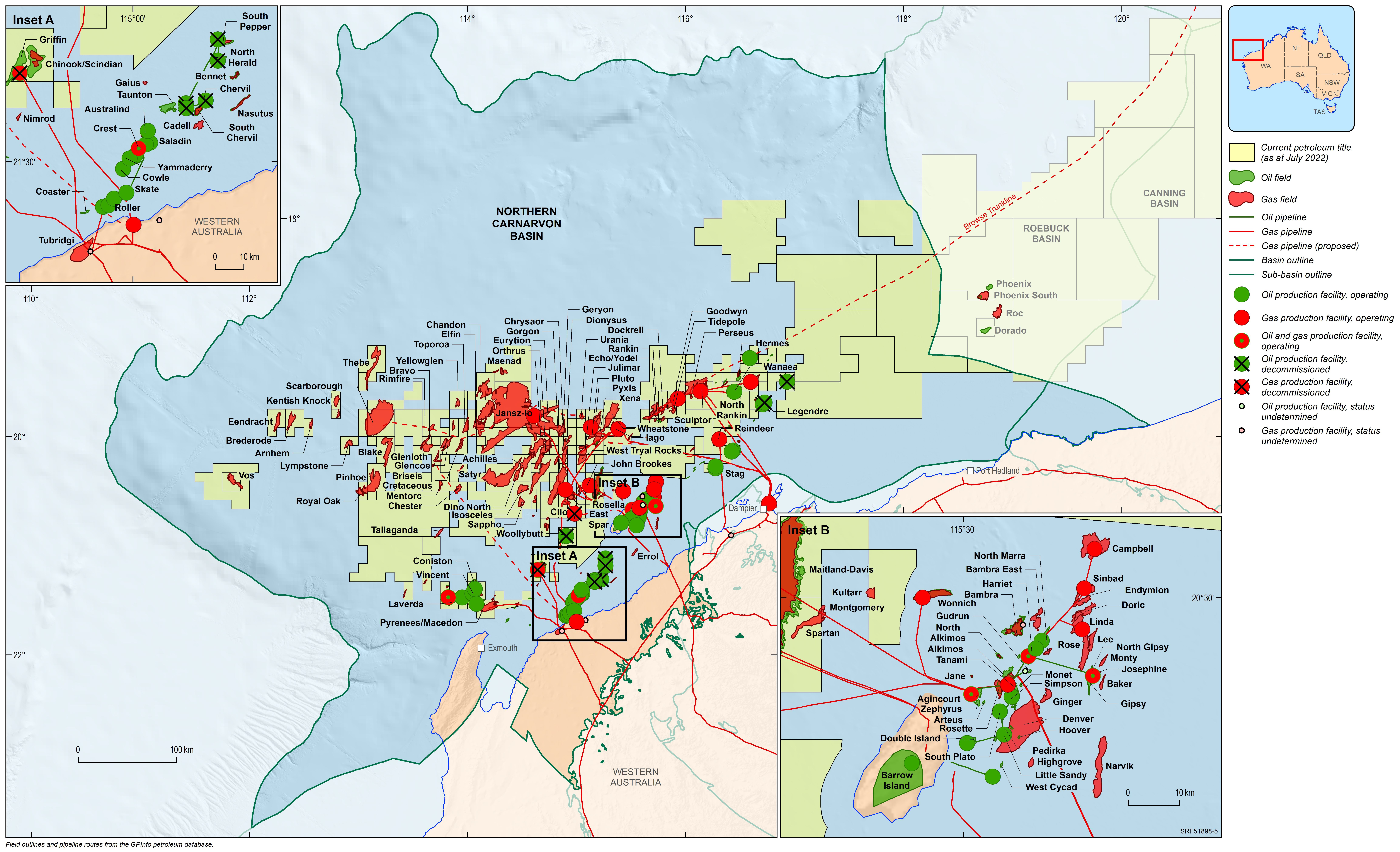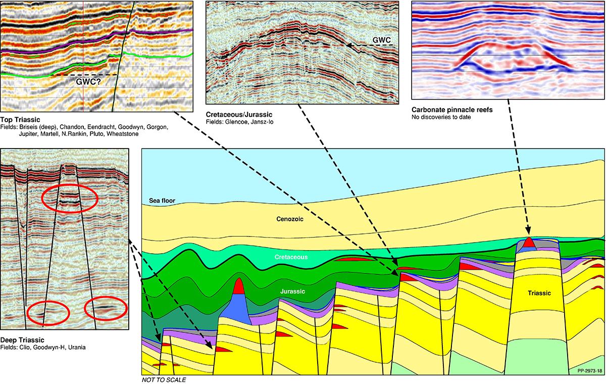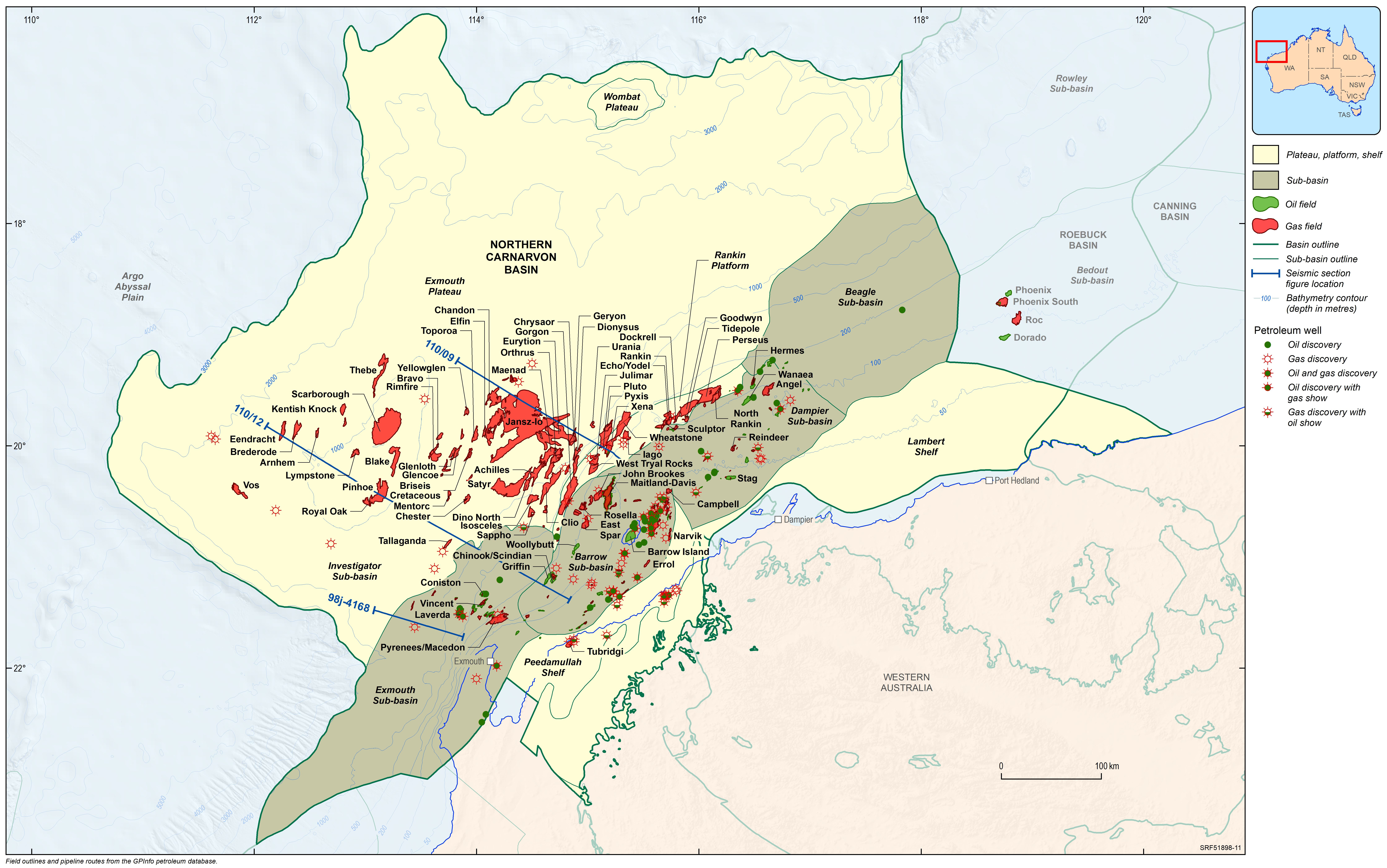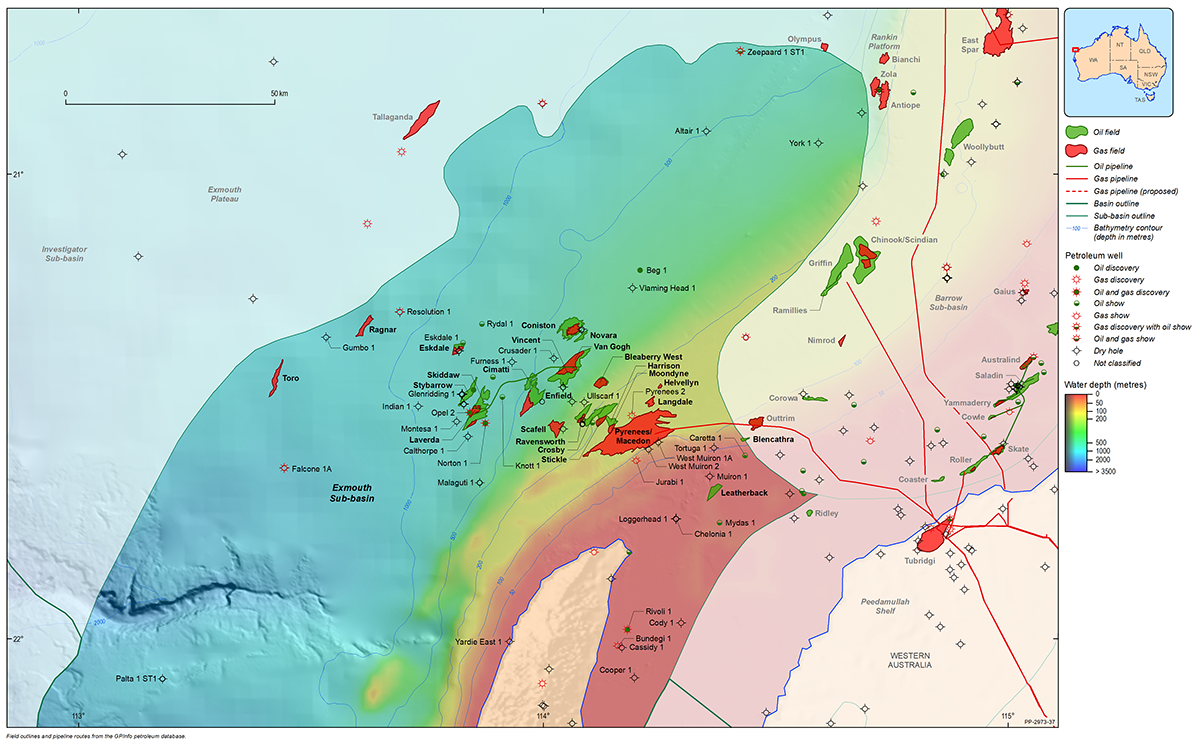 The Northern Carnarvon Basin represents the westernmost offshore province of Australia’s North West Shelf comprising also the Browse, Roebuck, Offshore Canning and Bonaparte basins (Figure 1). The Northern Carnarvon Basin covers an area of approximately 535 000 km2, predominantly offshore, in water depths of up to 4500 m (Figure 2). It contains a Paleozoic, Mesozoic and Cenozoic sedimentary succession up to 15 000 m thick, which is dominated by deltaic to marine siliciclastics and shelfal carbonates of Mesozoic to Cenozoic age. Two Mesozoic petroleum supersystems (Westralian 1 and Westralian 2) have been identified and numerous commercial oil and gas discoveries have been made within the basin. The basin is Australia’s premier hydrocarbon producing province and contains an established network of oil, condensate and gas production infrastructure (Figure 4). As of May 2022, the total proved and probable reserves for the Northern Carnarvon Basin are 3140 PJ (534 MMbbls) of oil and natural gas liquids and 50 982 PJ (45.33 Tcf) of natural gas and ethane (EnergyQuest, 2022).