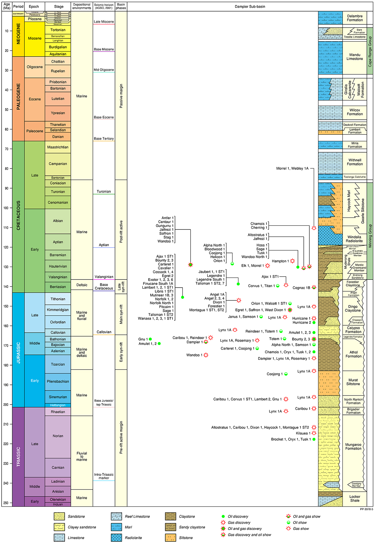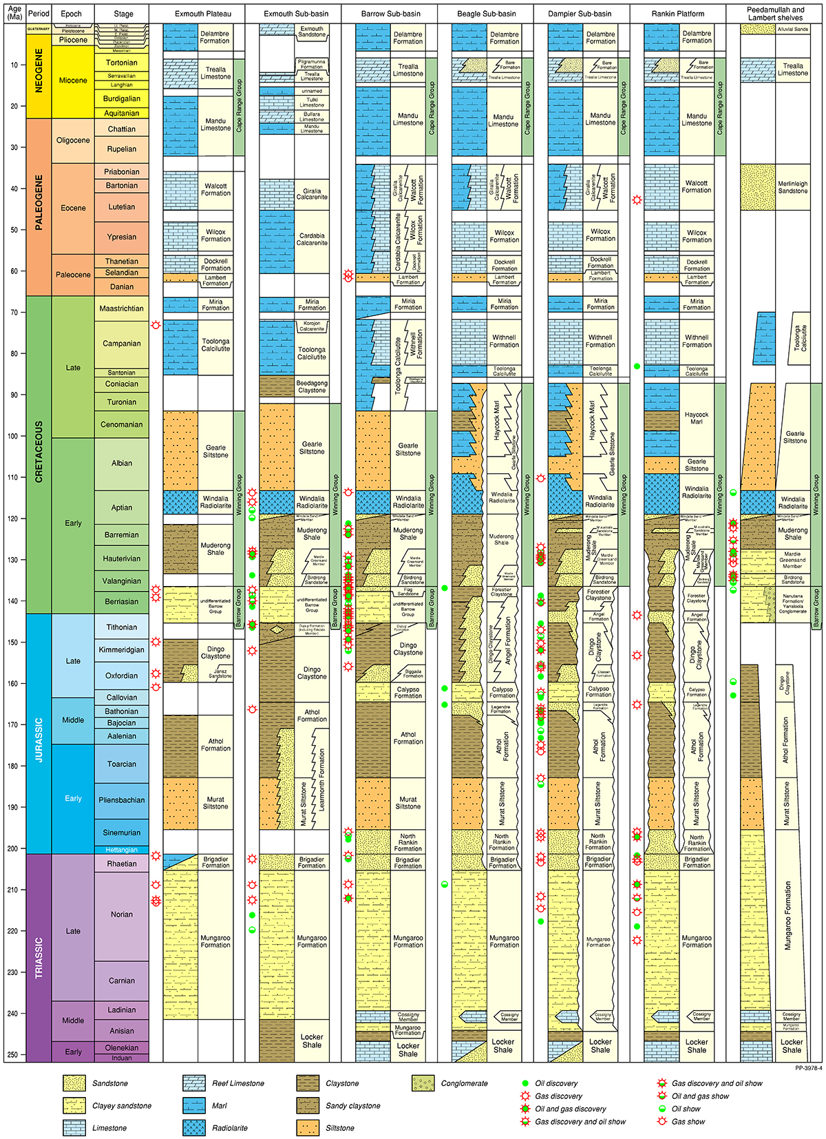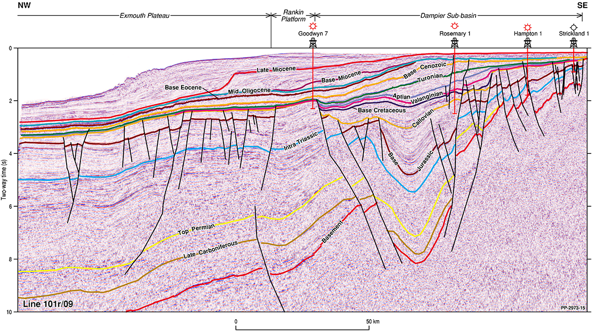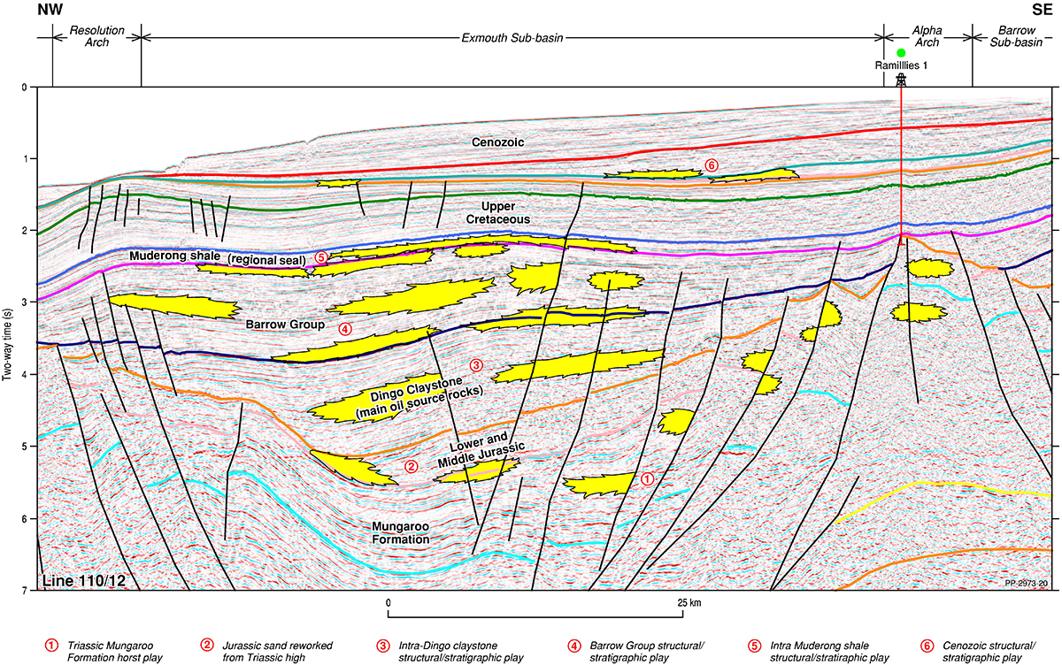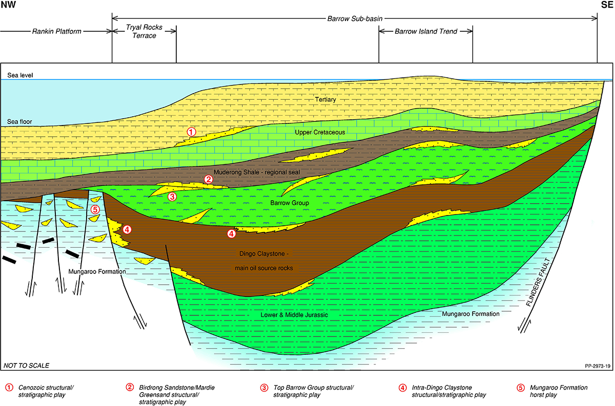 The Northern Carnarvon Basin represents the westernmost offshore province of Australia’s North West Shelf comprising also the Browse, Roebuck, Offshore Canning and Bonaparte basins (Figure 1). The Northern Carnarvon Basin covers an area of approximately 535 000 km2, predominantly offshore, in water depths of up to 4500 m (Figure 2). It contains a Paleozoic, Mesozoic and Cenozoic sedimentary succession up to 15 000 m thick, which is dominated by deltaic to marine siliciclastics and shelfal carbonates of Mesozoic to Cenozoic age. Two Mesozoic petroleum supersystems (Westralian 1 and Westralian 2) have been identified and numerous commercial oil and gas discoveries have been made within the basin. The basin is Australia’s premier hydrocarbon producing province and contains an established network of oil, condensate and gas production infrastructure (Figure 4). As of May 2022, the total proved and probable reserves for the Northern Carnarvon Basin are 3140 PJ (534 MMbbls) of oil and natural gas liquids and 50 982 PJ (45.33 Tcf) of natural gas and ethane (EnergyQuest, 2022).