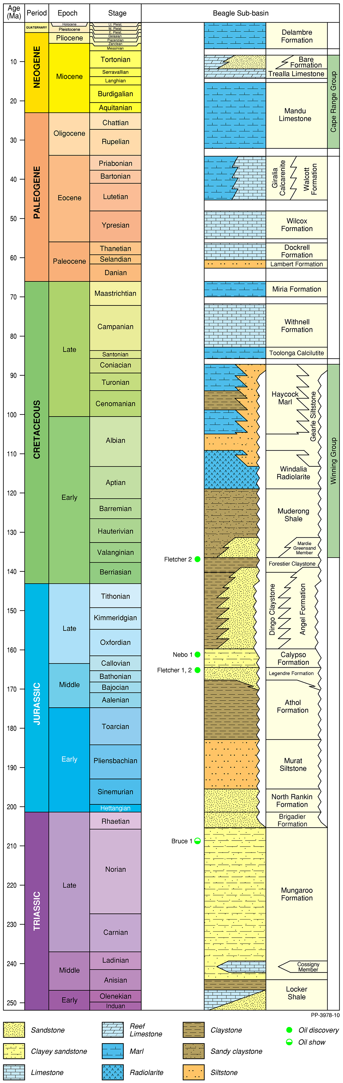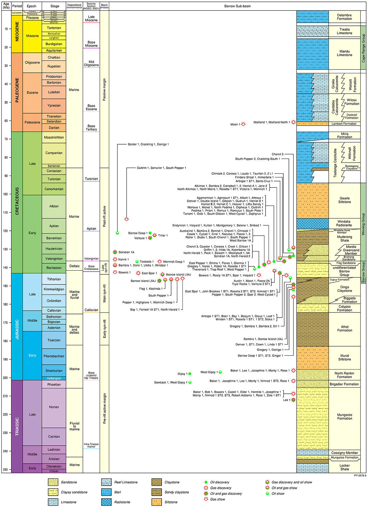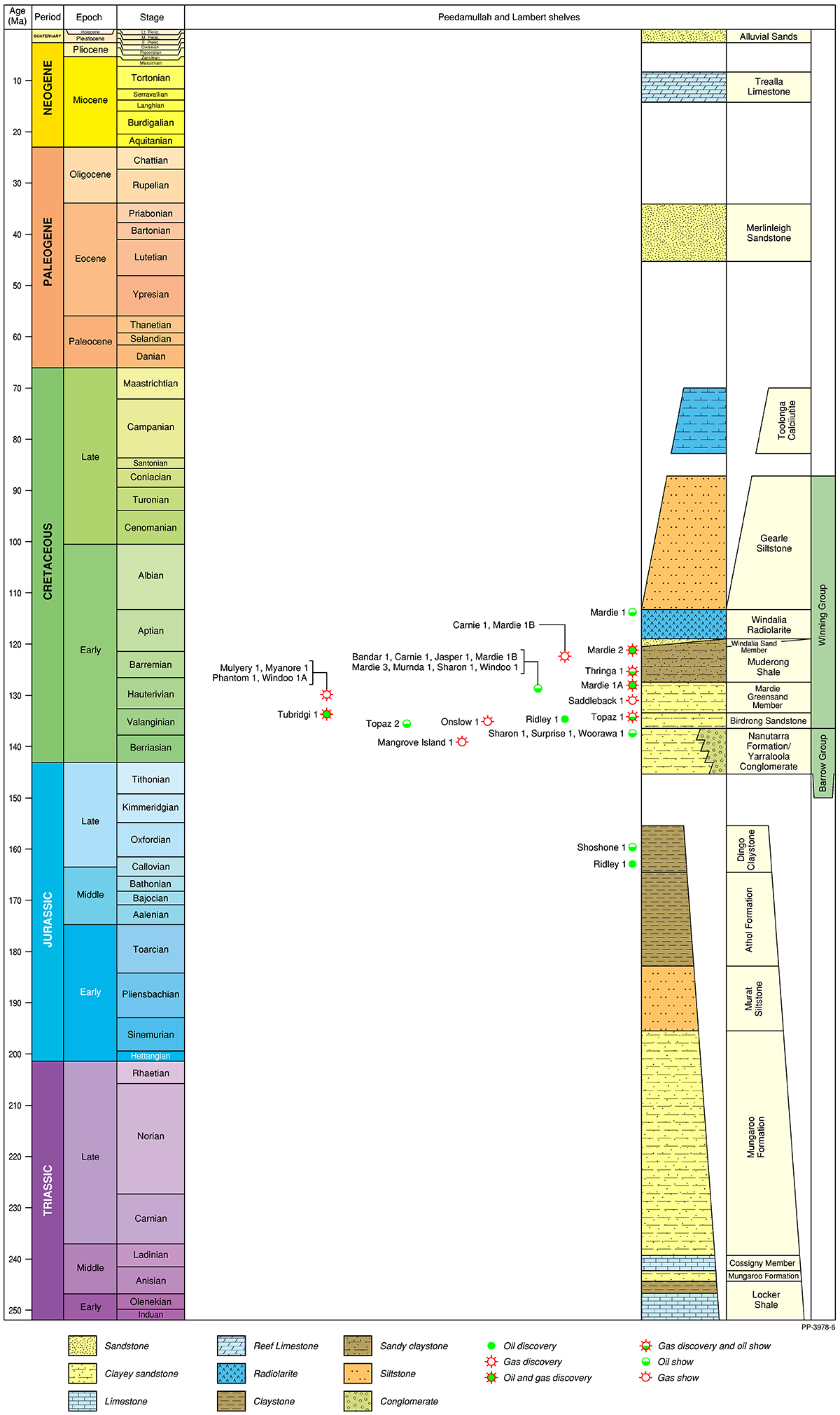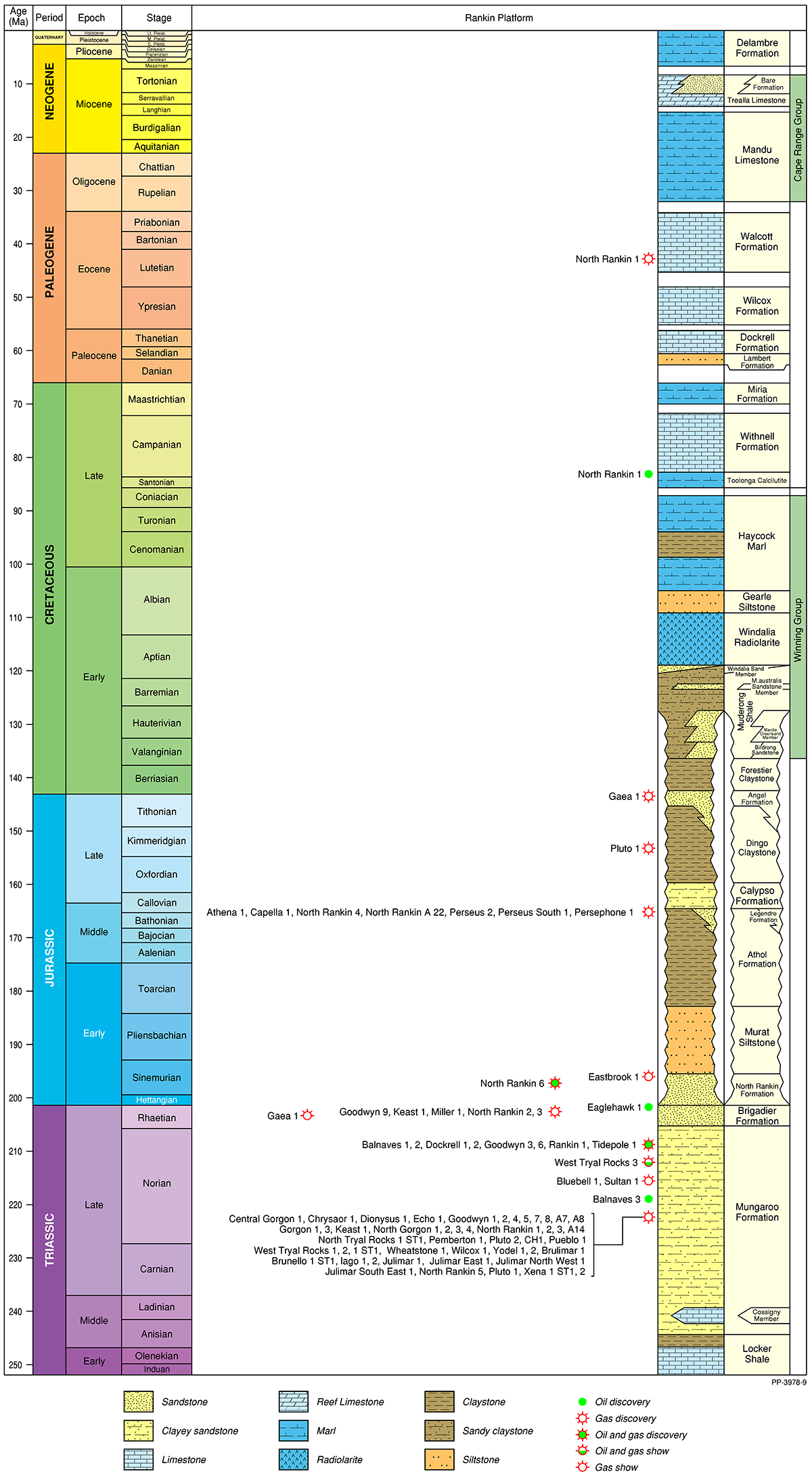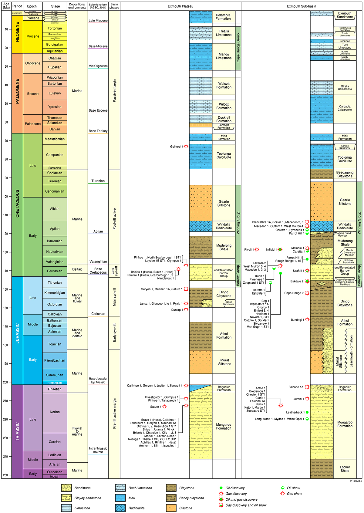 The Northern Carnarvon Basin represents the westernmost offshore province of Australia’s North West Shelf comprising also the Browse, Roebuck, Offshore Canning and Bonaparte basins (Figure 1). The Northern Carnarvon Basin covers an area of approximately 535 000 km2, predominantly offshore, in water depths of up to 4500 m (Figure 2). It contains a Paleozoic, Mesozoic and Cenozoic sedimentary succession up to 15 000 m thick, which is dominated by deltaic to marine siliciclastics and shelfal carbonates of Mesozoic to Cenozoic age. Two Mesozoic petroleum supersystems (Westralian 1 and Westralian 2) have been identified and numerous commercial oil and gas discoveries have been made within the basin. The basin is Australia’s premier hydrocarbon producing province and contains an established network of oil, condensate and gas production infrastructure (Figure 4). As of May 2022, the total proved and probable reserves for the Northern Carnarvon Basin are 3140 PJ (534 MMbbls) of oil and natural gas liquids and 50 982 PJ (45.33 Tcf) of natural gas and ethane (EnergyQuest, 2022).