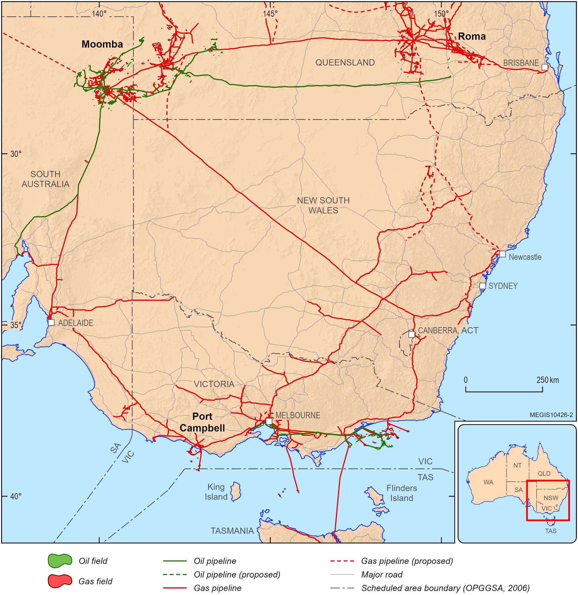 The Otway Basin is an important gas-producing region with discoveries onshore and in shallow water areas offshore approximately 170–220 km west-southwest of Melbourne, the State Capital of Victoria, delivering gas to the southeastern Australian energy market (Figure 2). Natural gas from Victoria, transported via the Port Campbell−Adelaide pipeline and the South East South Australia Pipeline, powers the 80 MW Ladbroke Grove power station adjacent to the Katnook facility. This gas also supplies markets serviced by the South East Pipeline System, replacing declining supply from the local onshore fields (Figure 3). The greater Melbourne region represents a large domestic gas market. Portland, on the western Victorian coast, is a deep-water port suited to offshore operations and is serviced by an excellent road and rail network.