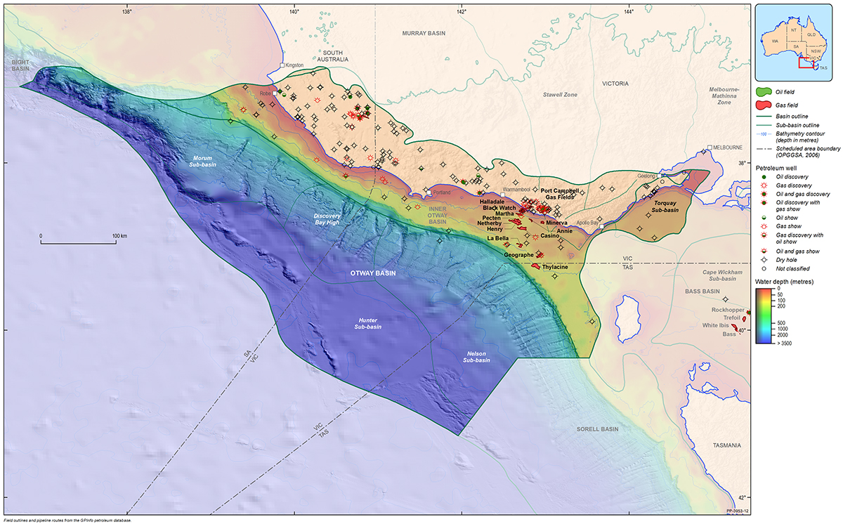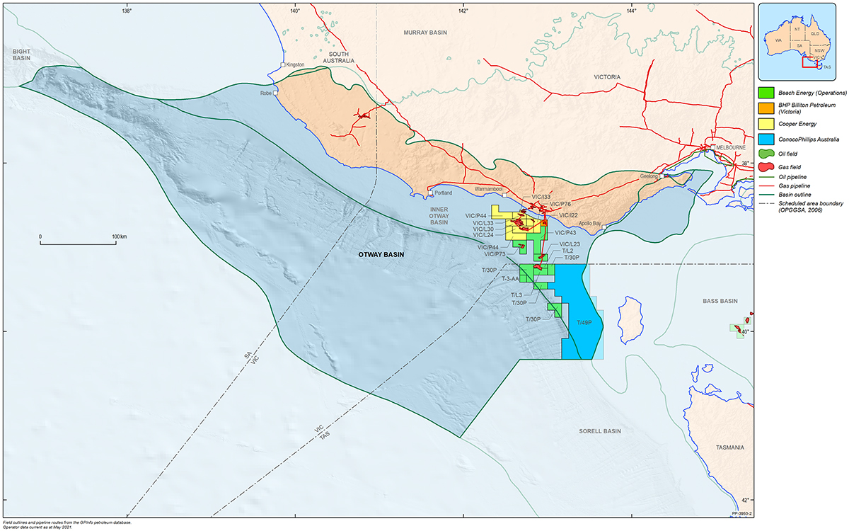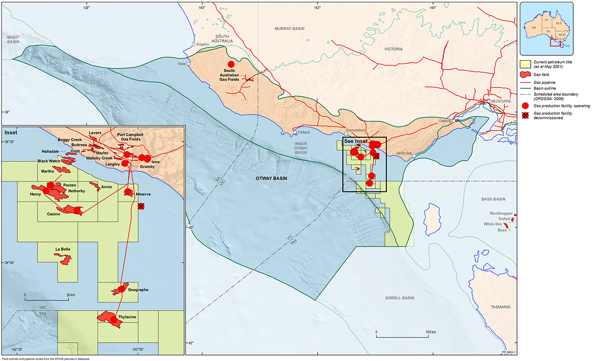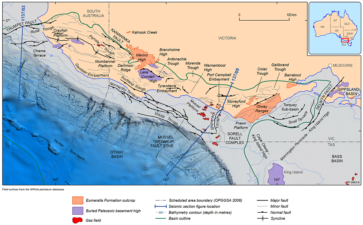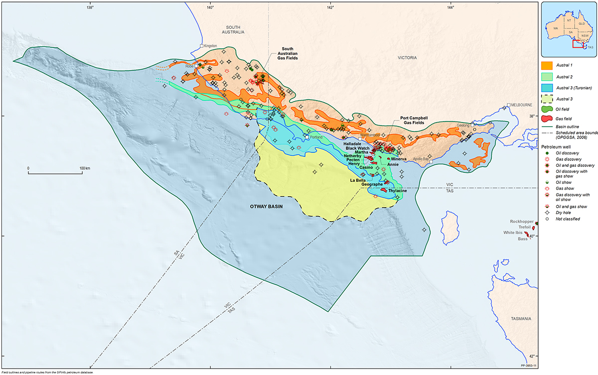 The Otway Basin is a broadly northwest to southeast striking rift basin that extends for approximately 500 km along the onshore and offshore parts of southeastern Australia (Figure 1). Approximately 80% of the basin is located offshore and 20% onshore. In total, the basin covers an area of approximately 155 000 km2; 45% of the basin is located in Victoria, 35% in South Australia and the remaining 20% within Tasmanian jurisdiction.