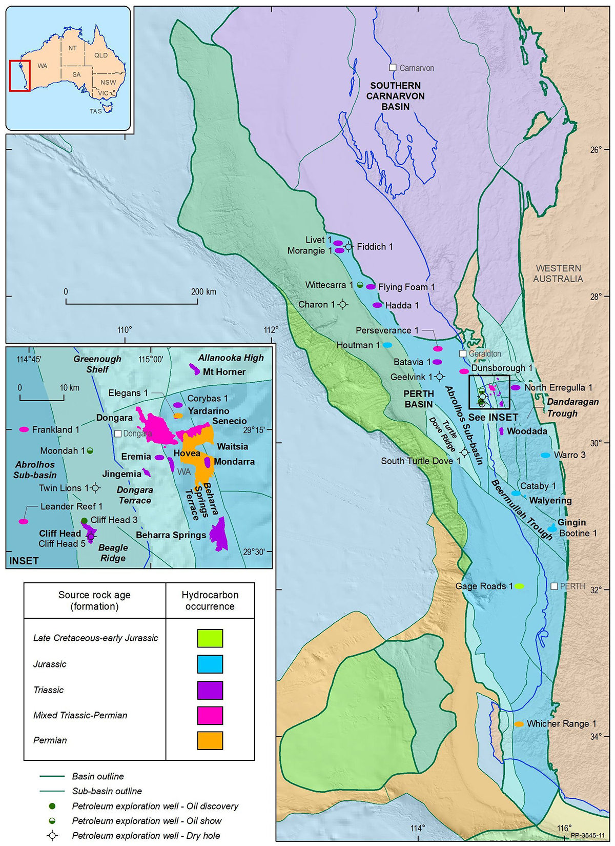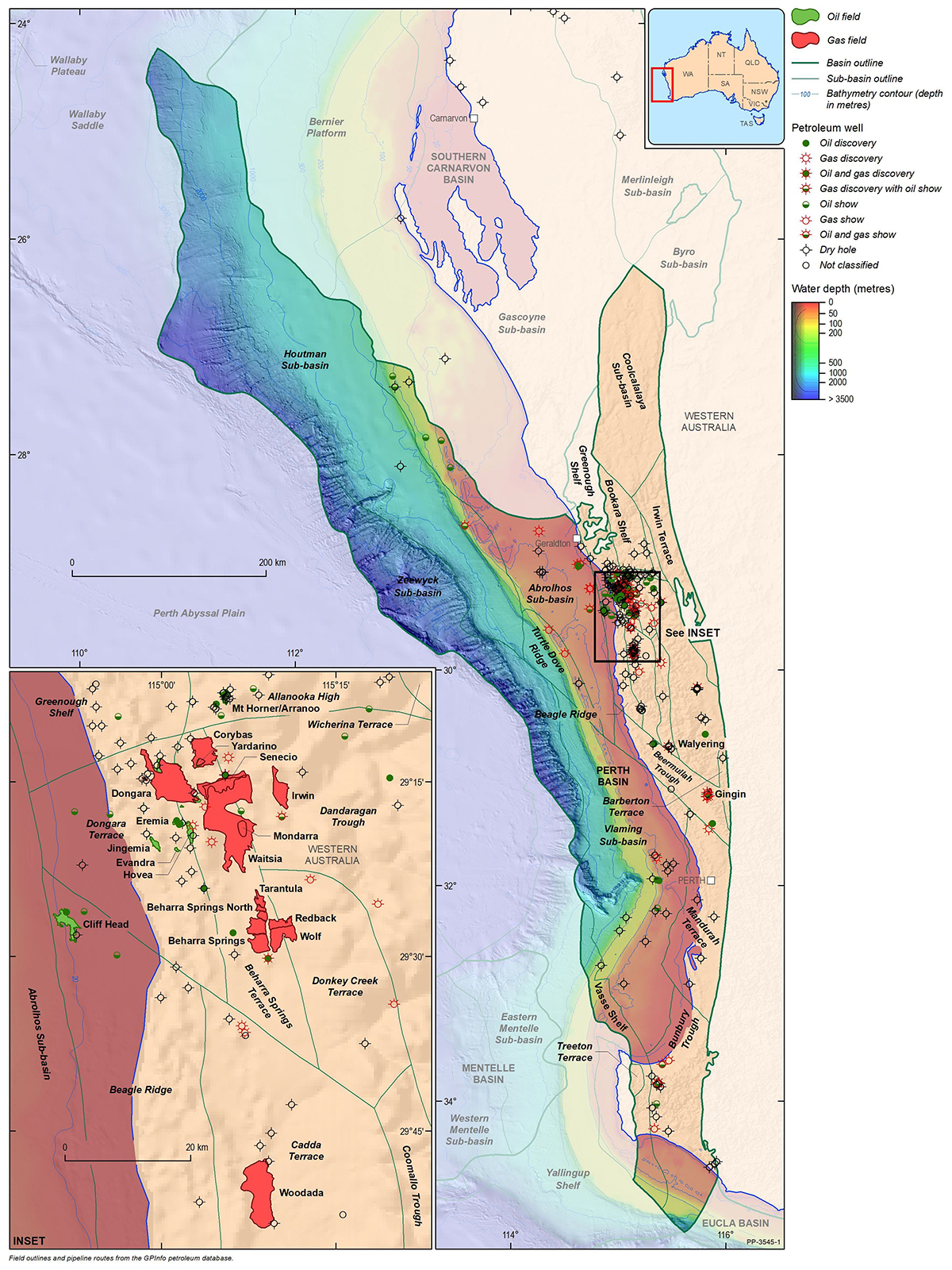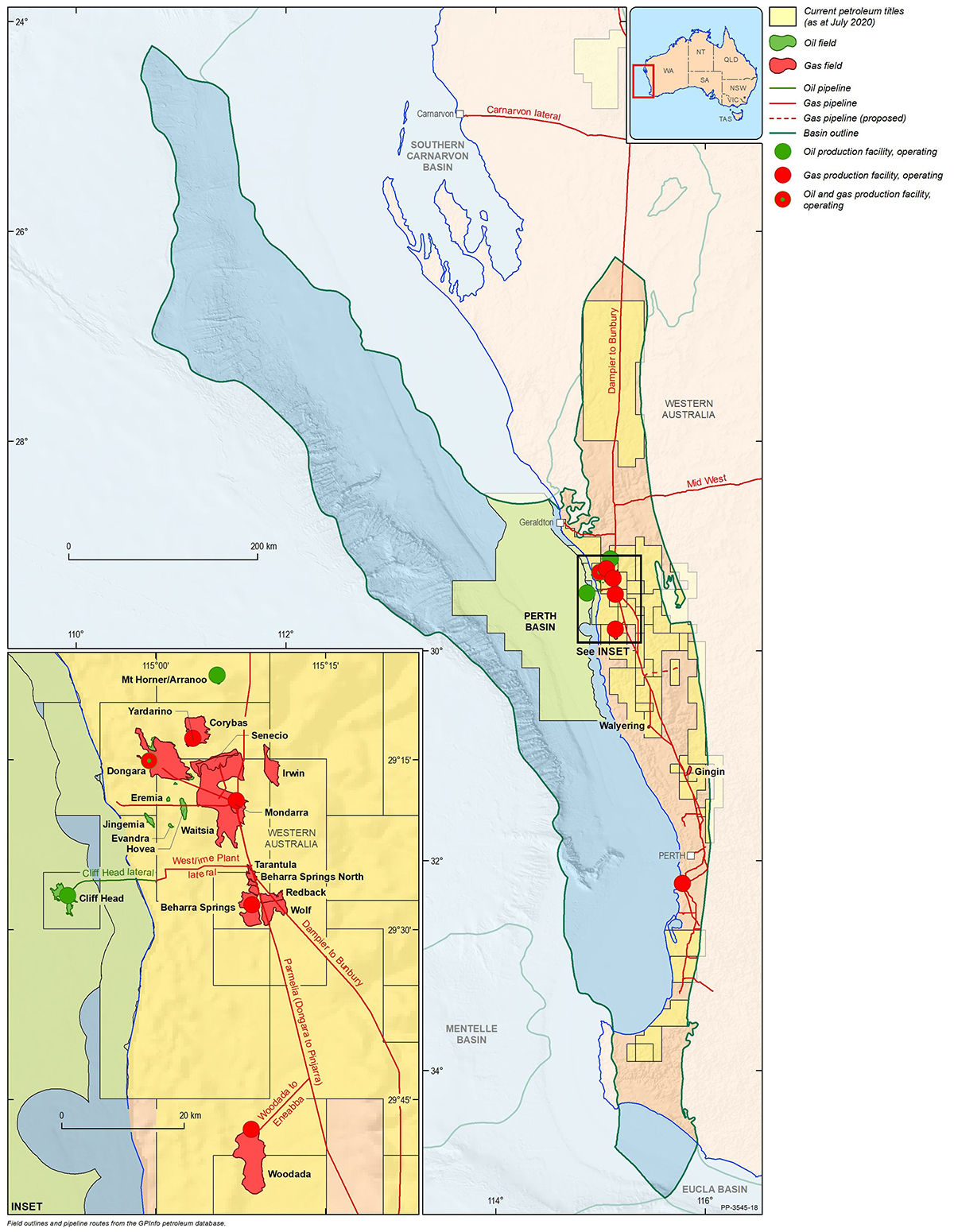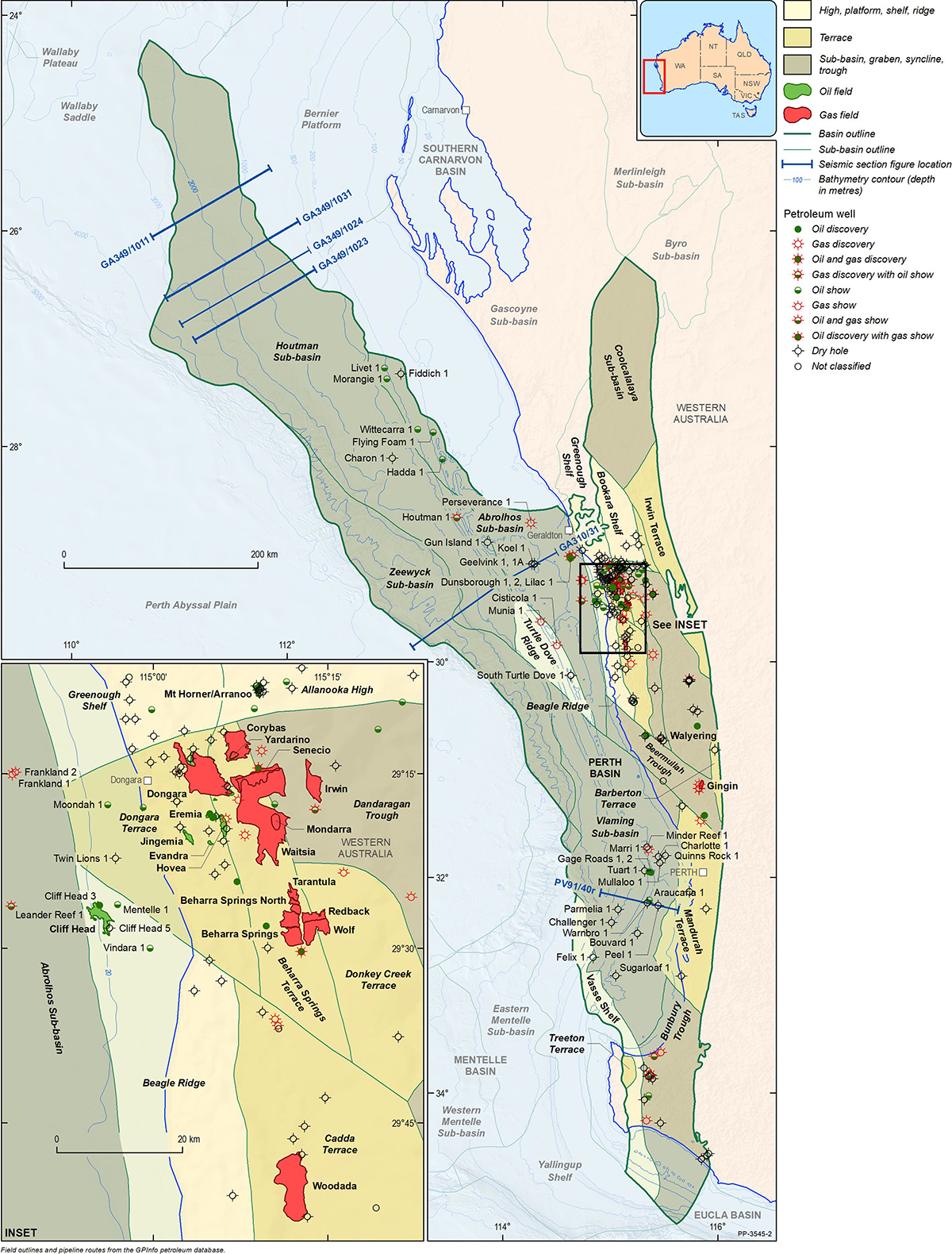 The Perth Basin is a large (172 300 km2) north to north-northwest trending, onshore and offshore sedimentary basin extending about 1300 km along the western margin of the Australian continent (Figure 1). With the exception of Whicher Range and some isolated oil and gas shows in the Vlaming Sub-basin, hydrocarbon occurrences and production are confined to the northern part of the Perth Basin. This includes 20 commercial oil and gas fields and numerous additional significant discoveries of varying size, dominantly in the onshore northern part of the basin. Recent commercial onshore gas discoveries at Waitsia and West Erregulla have highlighted the hydrocarbon potential of the Permian and Triassic sedimentary sequences. The producing region of the basin is close to petroleum industry infrastructure, including two major gas pipelines and trucking facilities to an oil refinery near Perth (Figure 2).