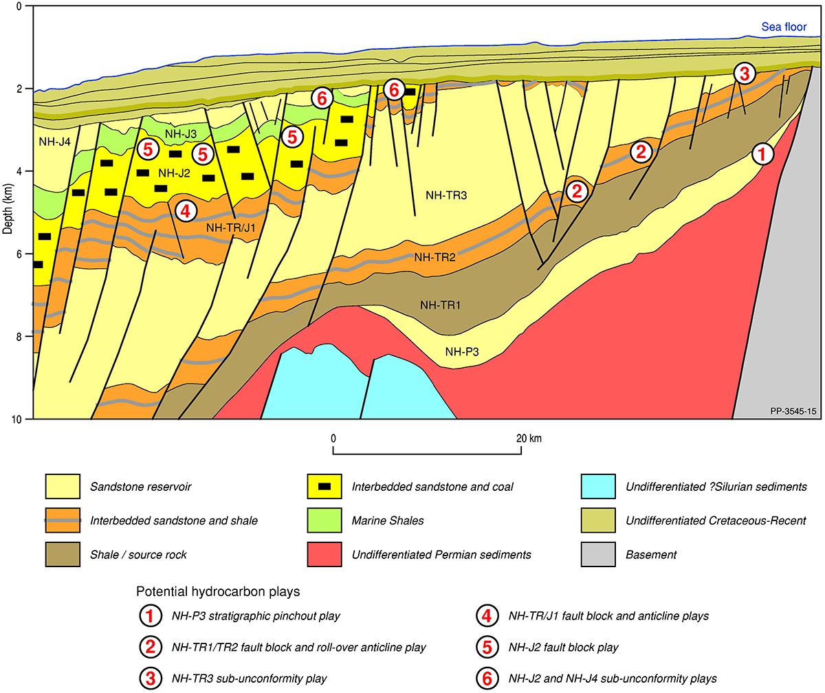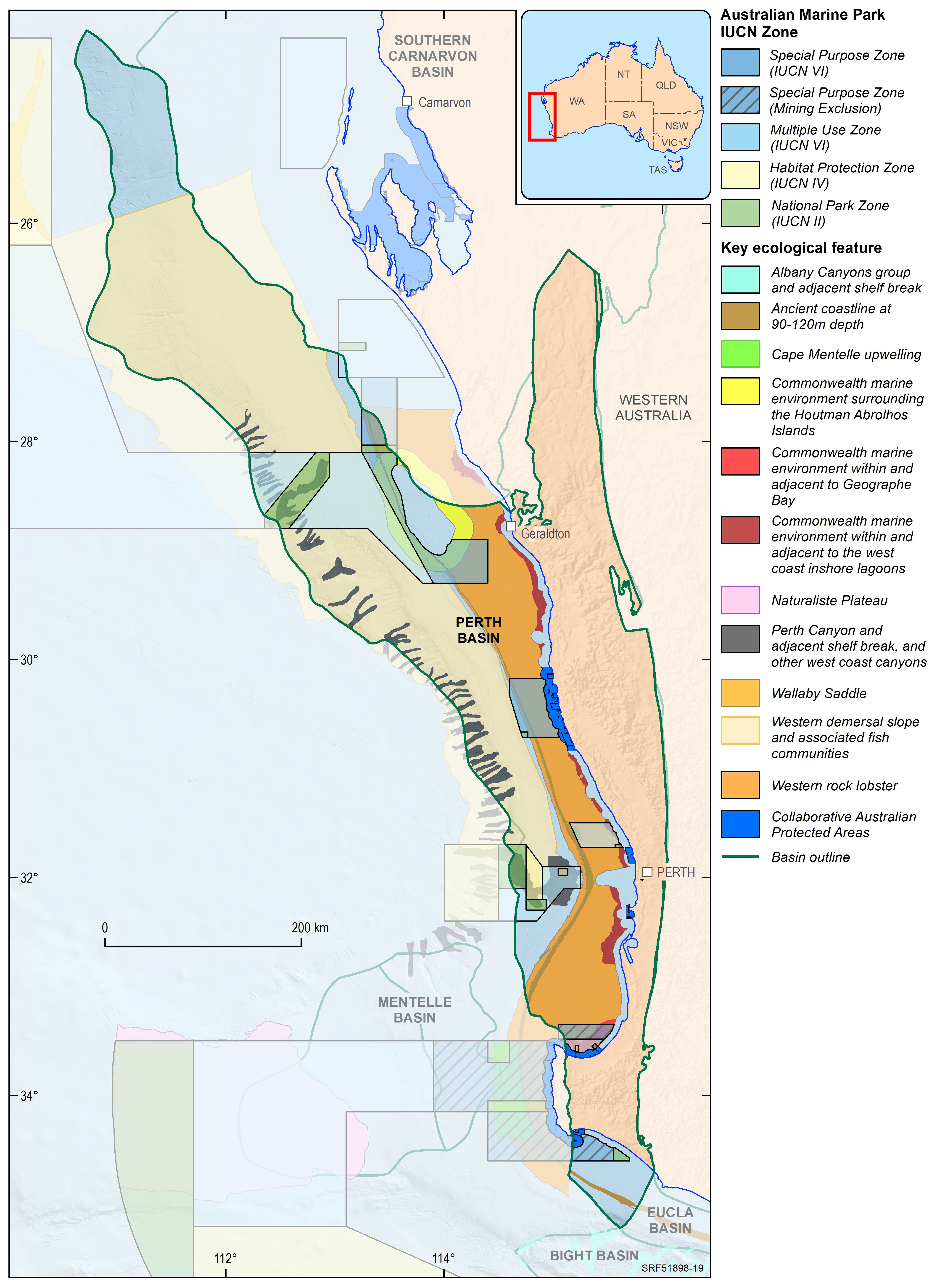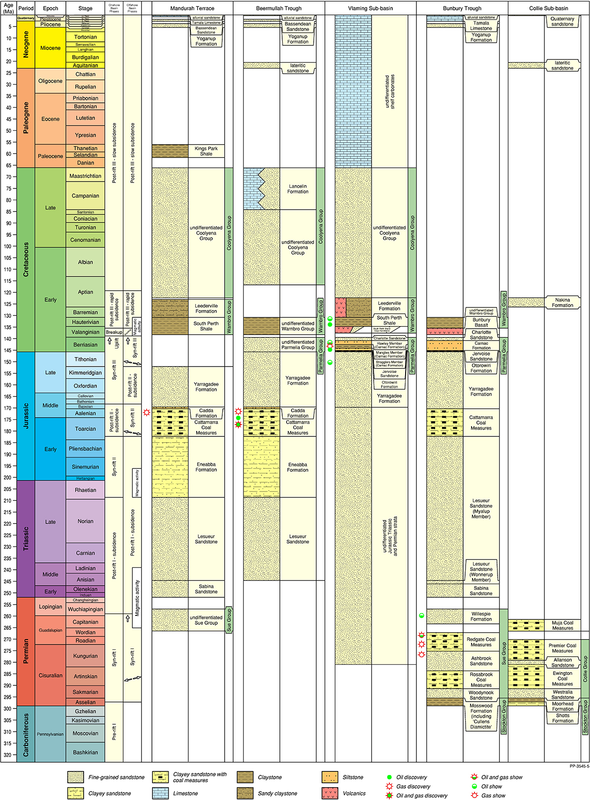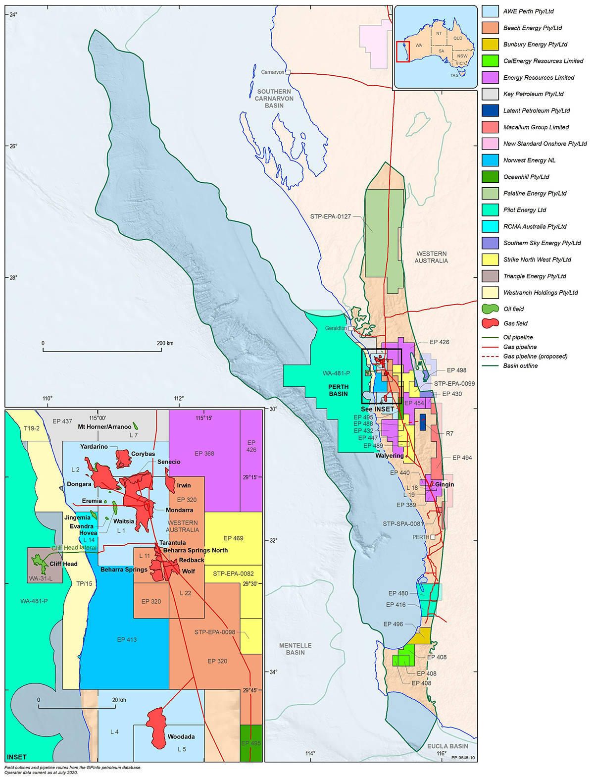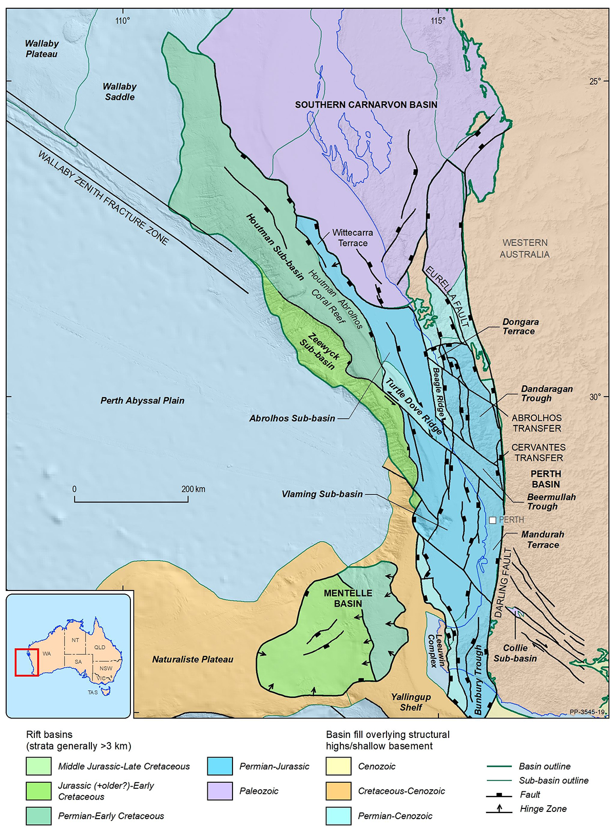 The Perth Basin is a large (172 300 km2) north to north-northwest trending, onshore and offshore sedimentary basin extending about 1300 km along the western margin of the Australian continent (Figure 1). With the exception of Whicher Range and some isolated oil and gas shows in the Vlaming Sub-basin, hydrocarbon occurrences and production are confined to the northern part of the Perth Basin. This includes 20 commercial oil and gas fields and numerous additional significant discoveries of varying size, dominantly in the onshore northern part of the basin. Recent commercial onshore gas discoveries at Waitsia and West Erregulla have highlighted the hydrocarbon potential of the Permian and Triassic sedimentary sequences. The producing region of the basin is close to petroleum industry infrastructure, including two major gas pipelines and trucking facilities to an oil refinery near Perth (Figure 2).