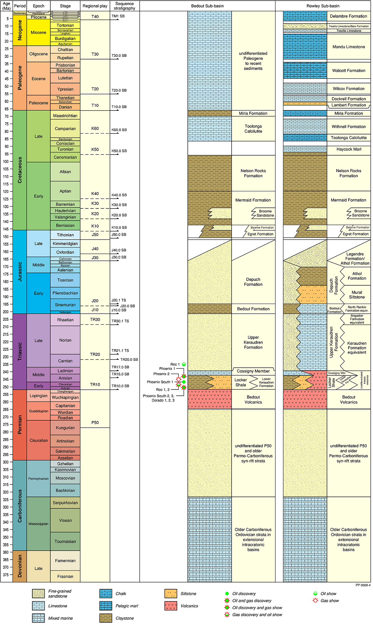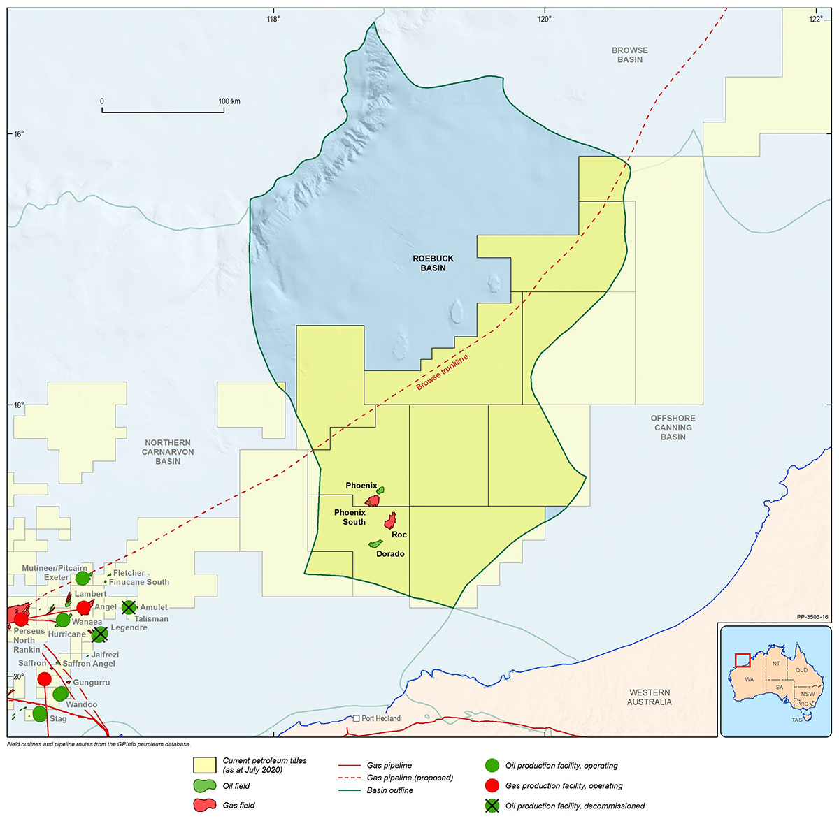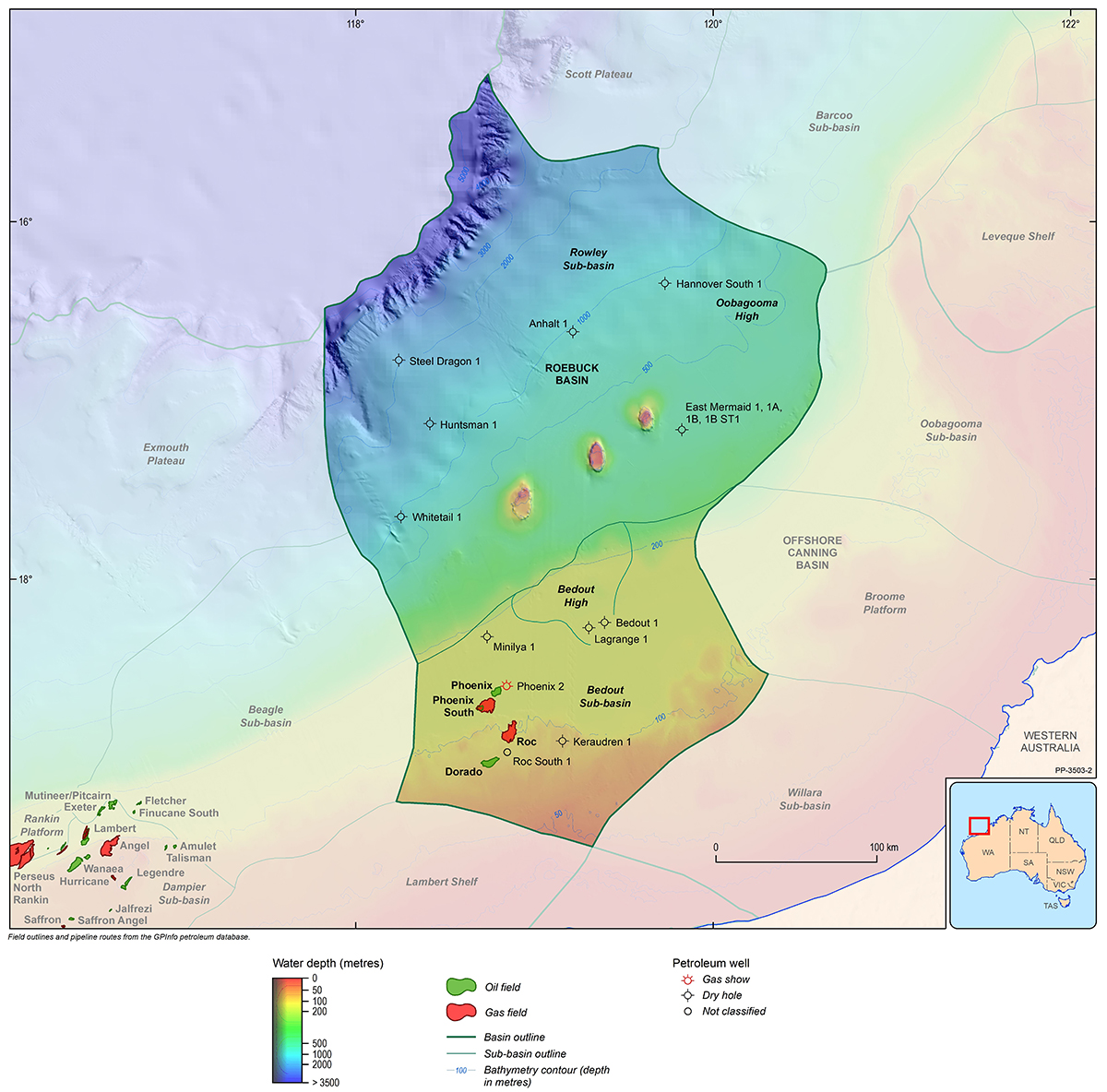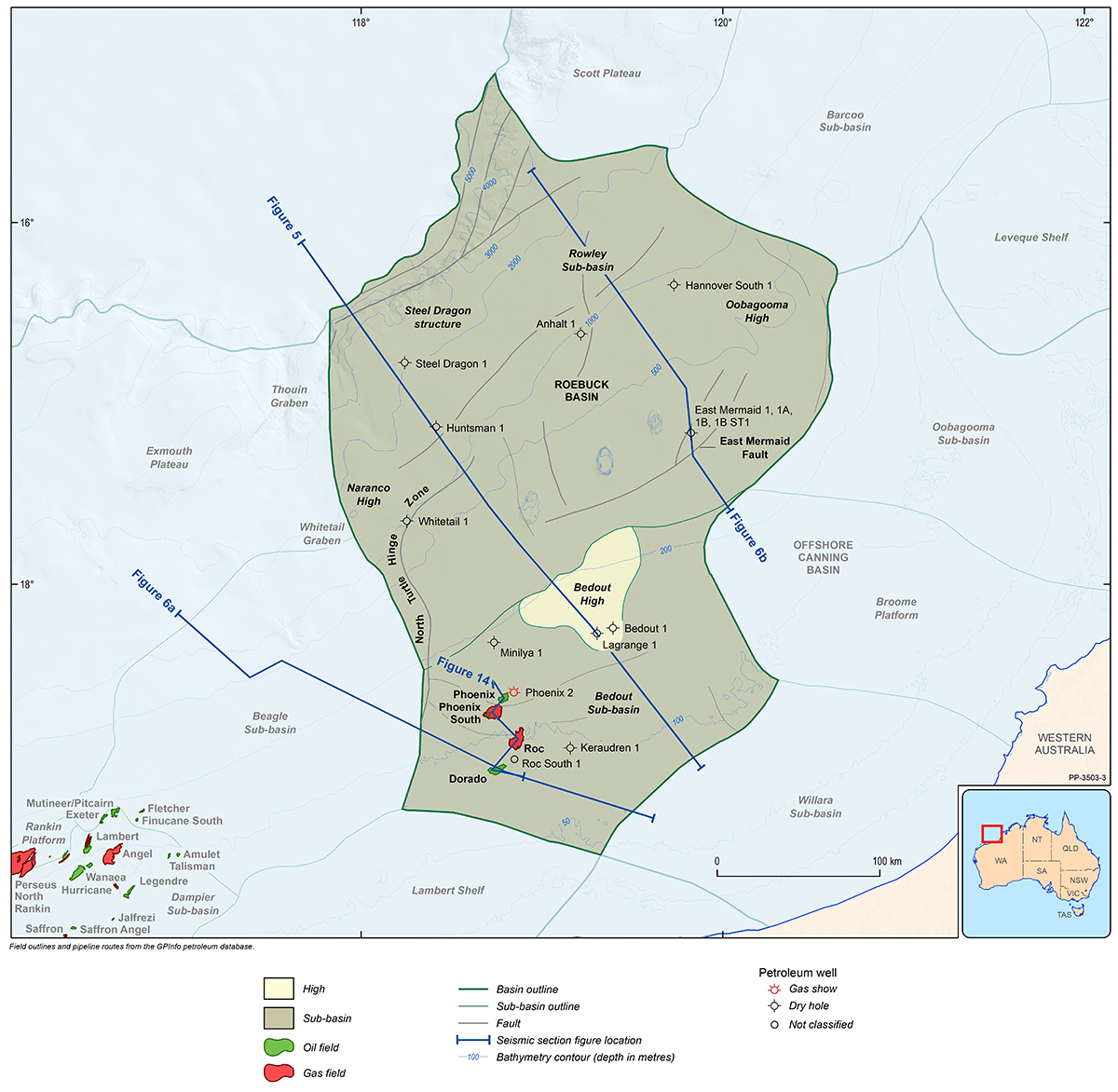The Roebuck Basin is located on the central part of Australia’s North West Shelf (Figure 1), covering approximately 90 000 km2 between the Northern Carnarvon Basin to the south and the Browse Basin to the north, the Canning Basin to the east, and the Argo Abyssal Plain to the northwest. The discovery of oil and gas-condensate at Phoenix South, Roc and Dorado has led to the establishment of the Bedout Sub-basin as an emerging hydrocarbon province in the otherwise underexplored Roebuck Basin (Figure 2). The existence of an active petroleum system has been proven in the Bedout Sub-basin and future production is highly probable. Gross 2C contingent resources at these discoveries, together with the historical discovery at Phoenix, are 1080 Bcf (30.58 Bcm) of gas, and 205 MMbbl (32.59 GL) of oil and condensate (Carnarvon Petroleum Ltd, 2019a). A resurgence in exploration activity in the basin, following these recent discoveries, is providing new data that illuminates the basins geology, structural architecture and prospectivity, particularly for the highly prospective Triassic succession.