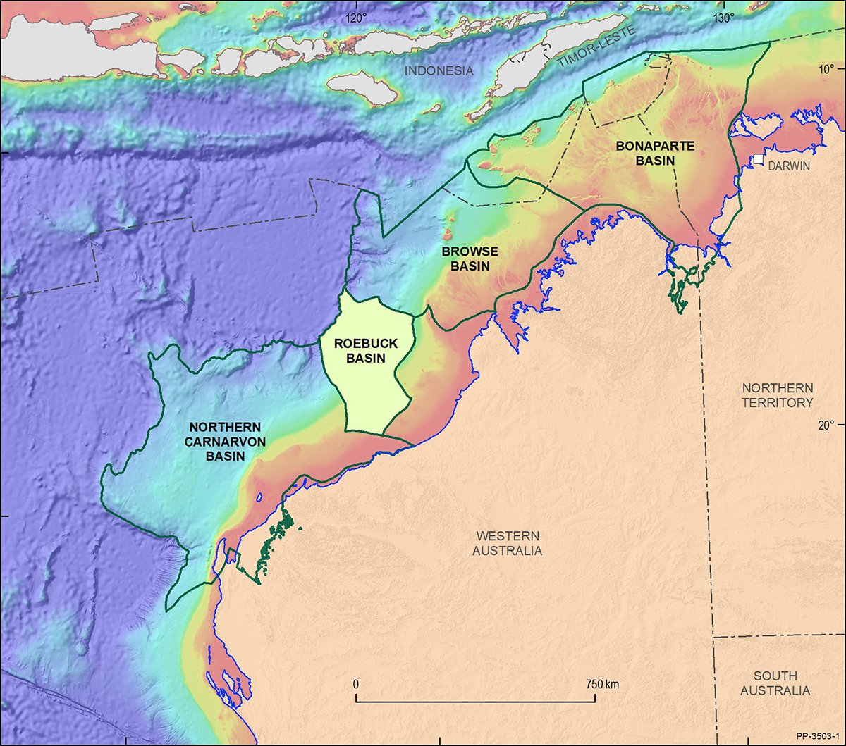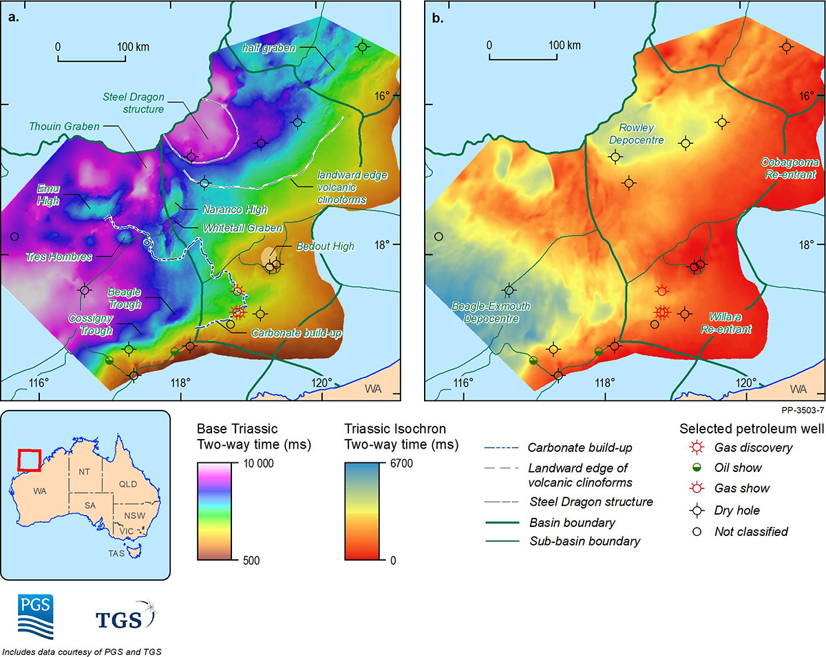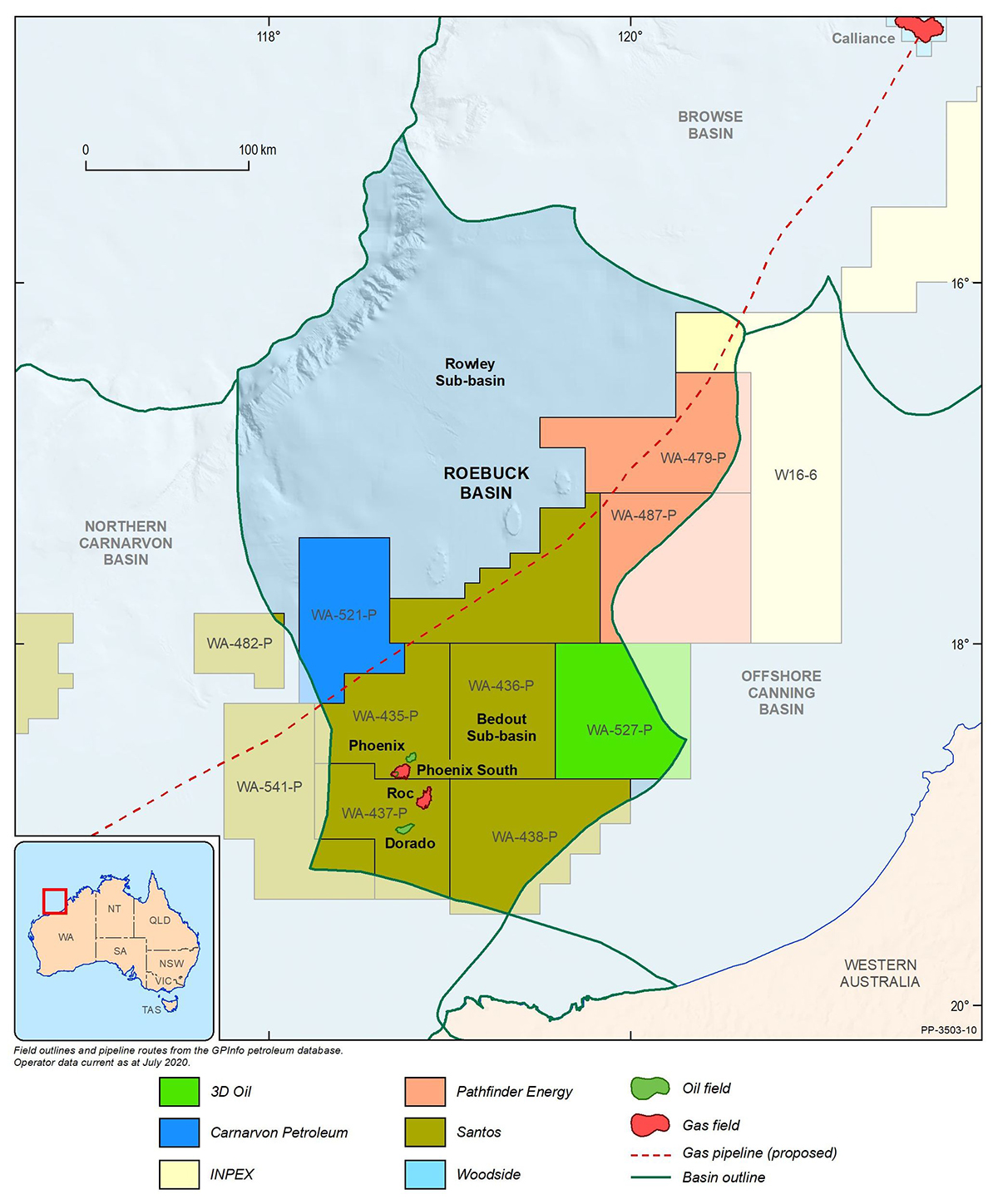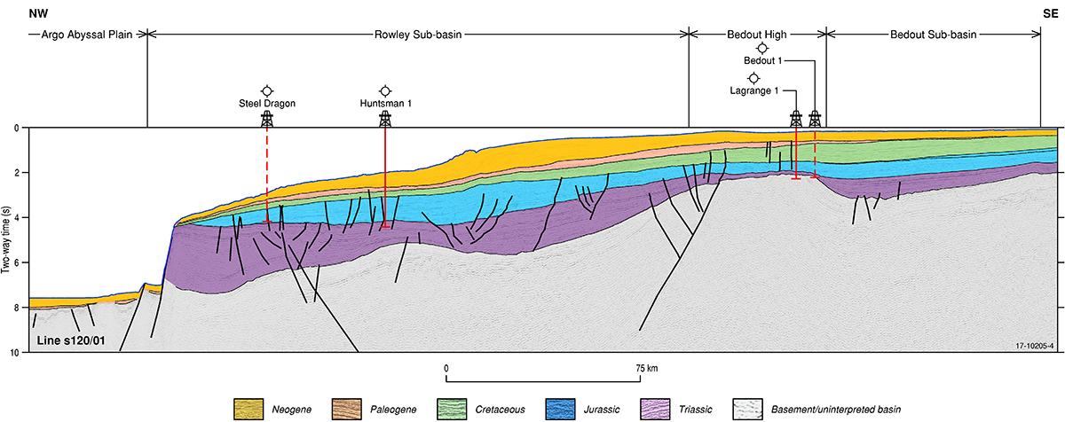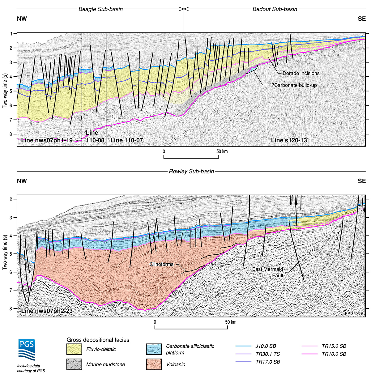The Roebuck Basin is located on the central part of Australia’s North West Shelf (Figure 1), covering approximately 90 000 km2 between the Northern Carnarvon Basin to the south and the Browse Basin to the north, the Canning Basin to the east, and the Argo Abyssal Plain to the northwest. The discovery of oil and gas-condensate at Phoenix South, Roc and Dorado has led to the establishment of the Bedout Sub-basin as an emerging hydrocarbon province in the otherwise underexplored Roebuck Basin (Figure 2). The existence of an active petroleum system has been proven in the Bedout Sub-basin and future production is highly probable. Gross 2C contingent resources at these discoveries, together with the historical discovery at Phoenix, are 1080 Bcf (30.58 Bcm) of gas, and 205 MMbbl (32.59 GL) of oil and condensate (Carnarvon Petroleum Ltd, 2019a). A resurgence in exploration activity in the basin, following these recent discoveries, is providing new data that illuminates the basins geology, structural architecture and prospectivity, particularly for the highly prospective Triassic succession.