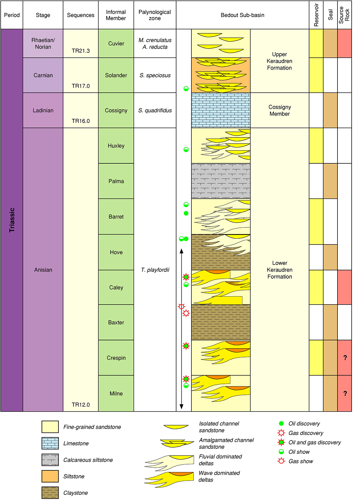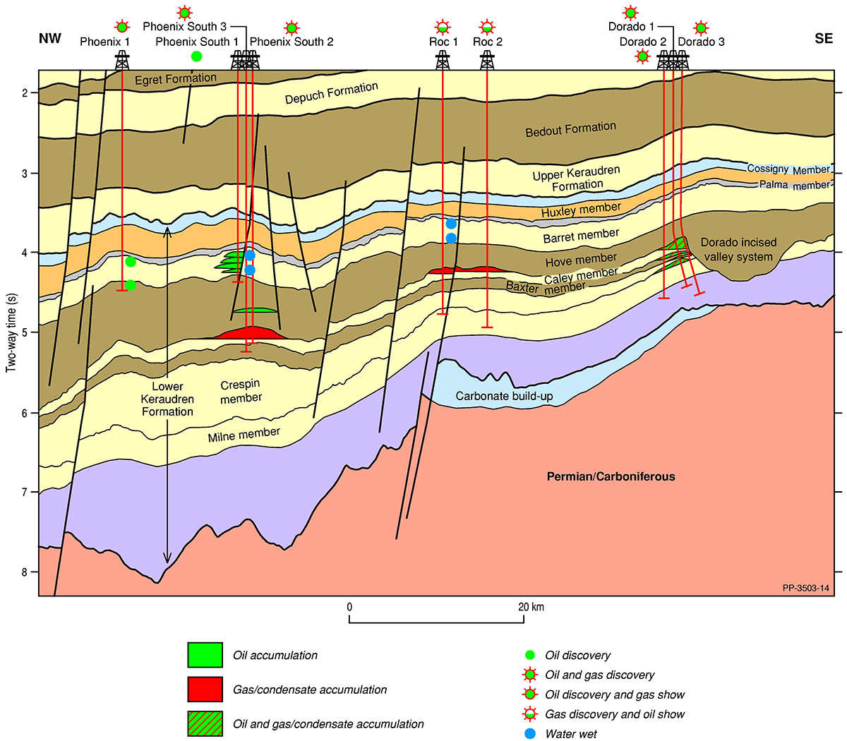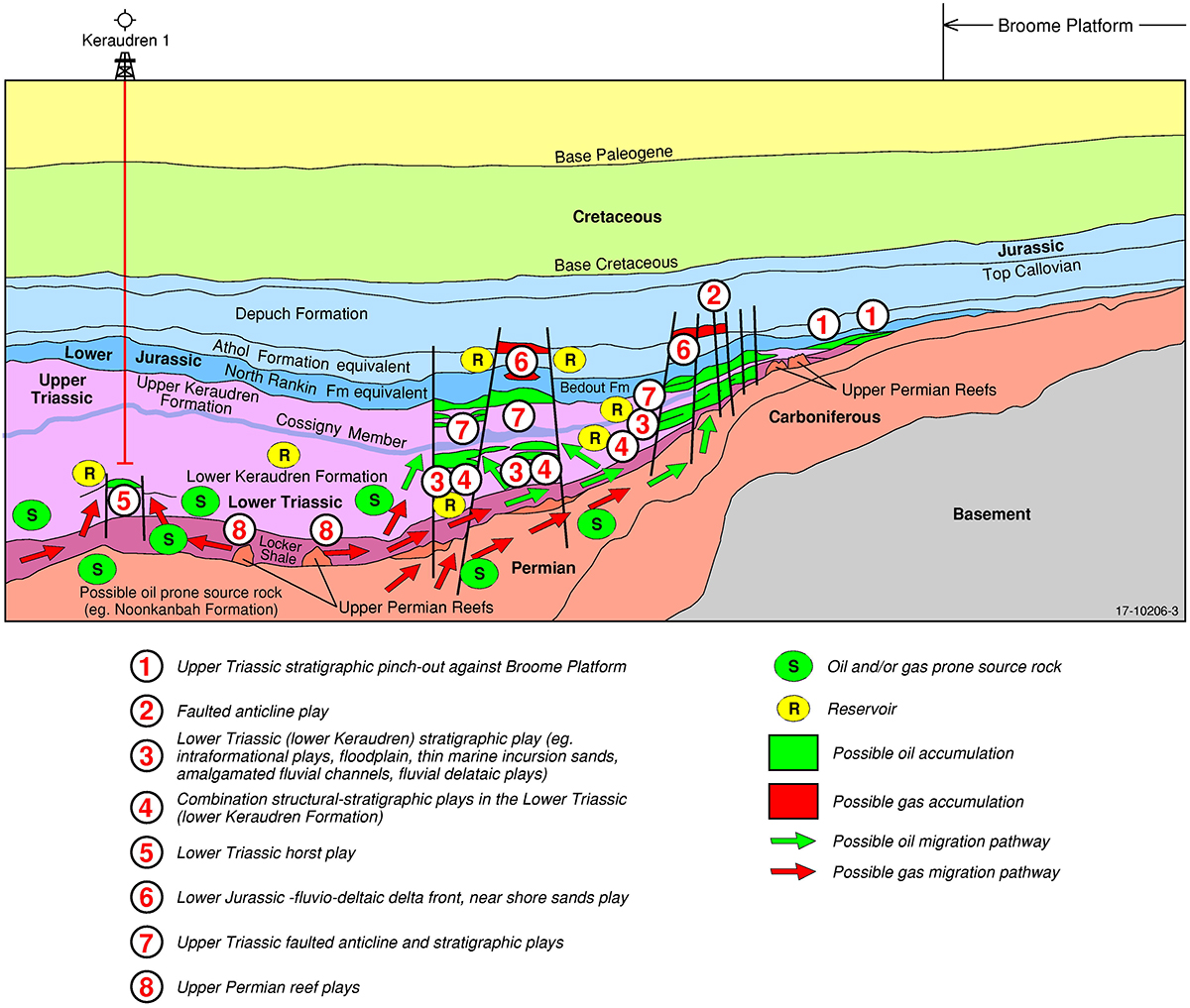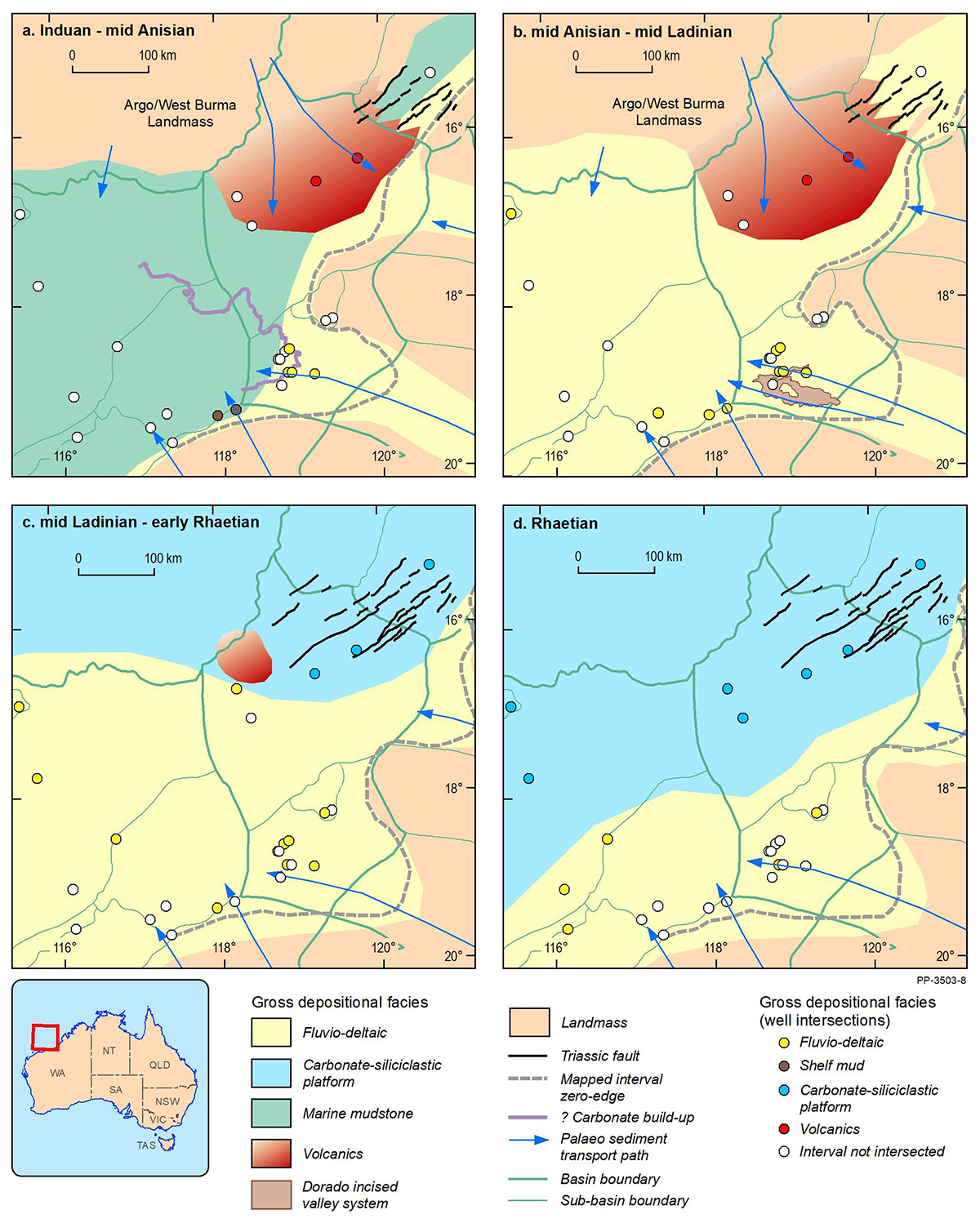 The Roebuck Basin is located on the central part of Australia’s North West Shelf (Figure 1), covering approximately 90 000 km2 between the Northern Carnarvon Basin to the south and the Browse Basin to the north, the Canning Basin to the east, and the Argo Abyssal Plain to the northwest. The discovery of oil and gas-condensate at Phoenix South, Roc and Dorado has led to the establishment of the Bedout Sub-basin as an emerging hydrocarbon province in the otherwise underexplored Roebuck Basin (Figure 2). The existence of an active petroleum system has been proven in the Bedout Sub-basin and future production is highly probable. Gross 2C contingent resources at these discoveries, together with the historical discovery at Phoenix, are 1080 Bcf (30.58 Bcm) of gas, and 205 MMbbl (32.59 GL) of oil and condensate (Carnarvon Petroleum Ltd, 2019a). A resurgence in exploration activity in the basin, following these recent discoveries, is providing new data that illuminates the basins geology, structural architecture and prospectivity, particularly for the highly prospective Triassic succession.
