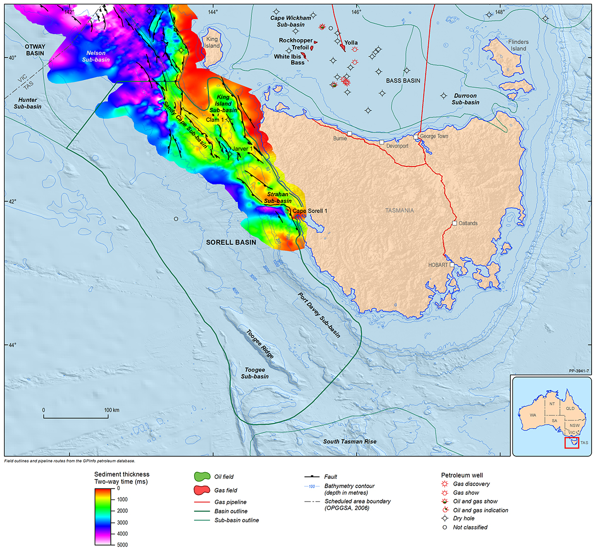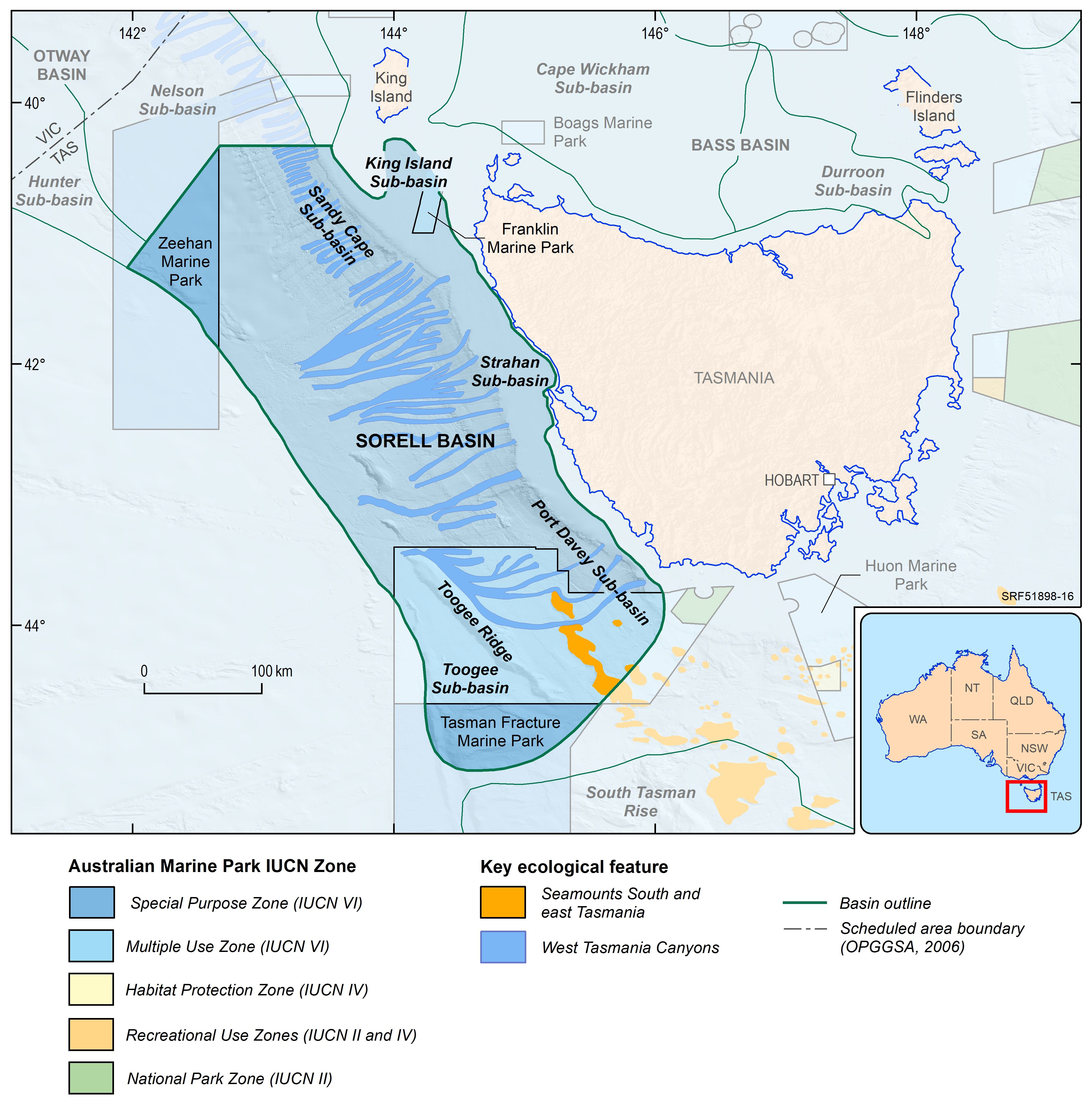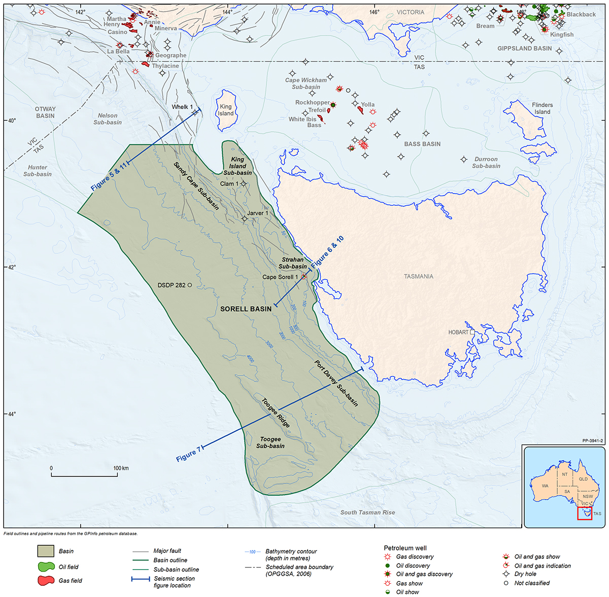 The Sorell Basin is a large transtensional basin that lies off the west coast of Tasmania and King Island (Figure 1), in water depths of 50–4500 m. It is bounded by the Otway Basin to the north, the Tasmanian coast to the east, oceanic seafloor to the west; the South Tasman Rise lies to the south. The Sorell Basin is structurally and stratigraphically contiguous with the Otway Basin and contains a largely siliciclastic Lower Cretaceous to Holocene succession. The basin includes five sub-basin depocentres: the King Island, Sandy Cape and Strahan sub-basins in the north, and the Port Davey and Toogee sub-basins in the south (Figure 2).