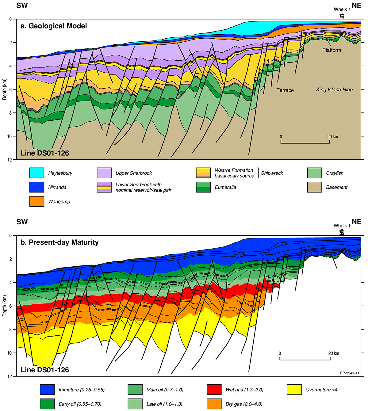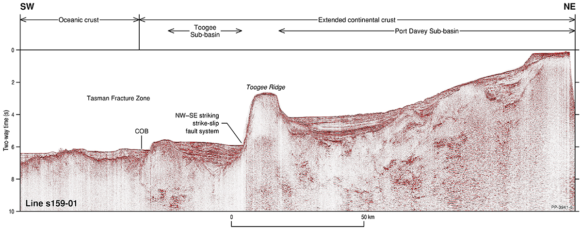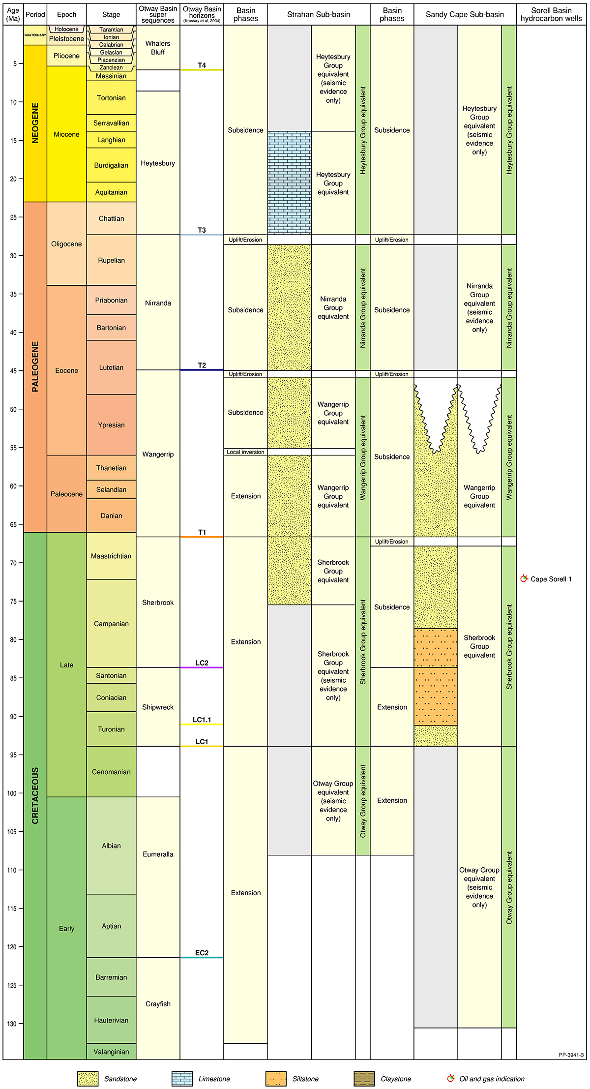 The Sorell Basin is a large transtensional basin that lies off the west coast of Tasmania and King Island (Figure 1), in water depths of 50–4500 m. It is bounded by the Otway Basin to the north, the Tasmanian coast to the east, oceanic seafloor to the west; the South Tasman Rise lies to the south. The Sorell Basin is structurally and stratigraphically contiguous with the Otway Basin and contains a largely siliciclastic Lower Cretaceous to Holocene succession. The basin includes five sub-basin depocentres: the King Island, Sandy Cape and Strahan sub-basins in the north, and the Port Davey and Toogee sub-basins in the south (Figure 2).