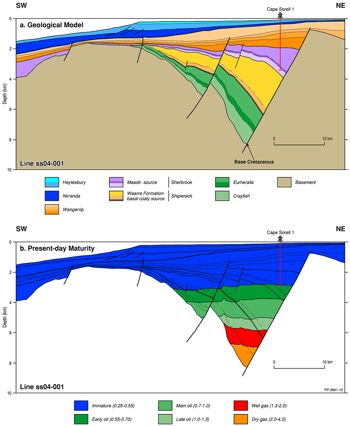 Limited exploration activity has been focused entirely in the northern part of the basin. The southern part of the basin is essentially unexplored and the geology of this part of the basin is poorly understood. In general, sediment thickness in the basin decreases to the south and maximum thicknesses vary from approximately 6000 m in the Sandy Cape and Strahan sub-basins, to 3000 m in the Port Davey Sub-basin. Although the Sorell Basin is largely underexplored, the presence of thick Cretaceous basin-fill, interpreted to contain organic-rich coaly, deltaic and marine facies that are mature for hydrocarbon generation in much of the basin, and minor oil indications in one well, indicate that active petroleum systems may be present in the basin.
