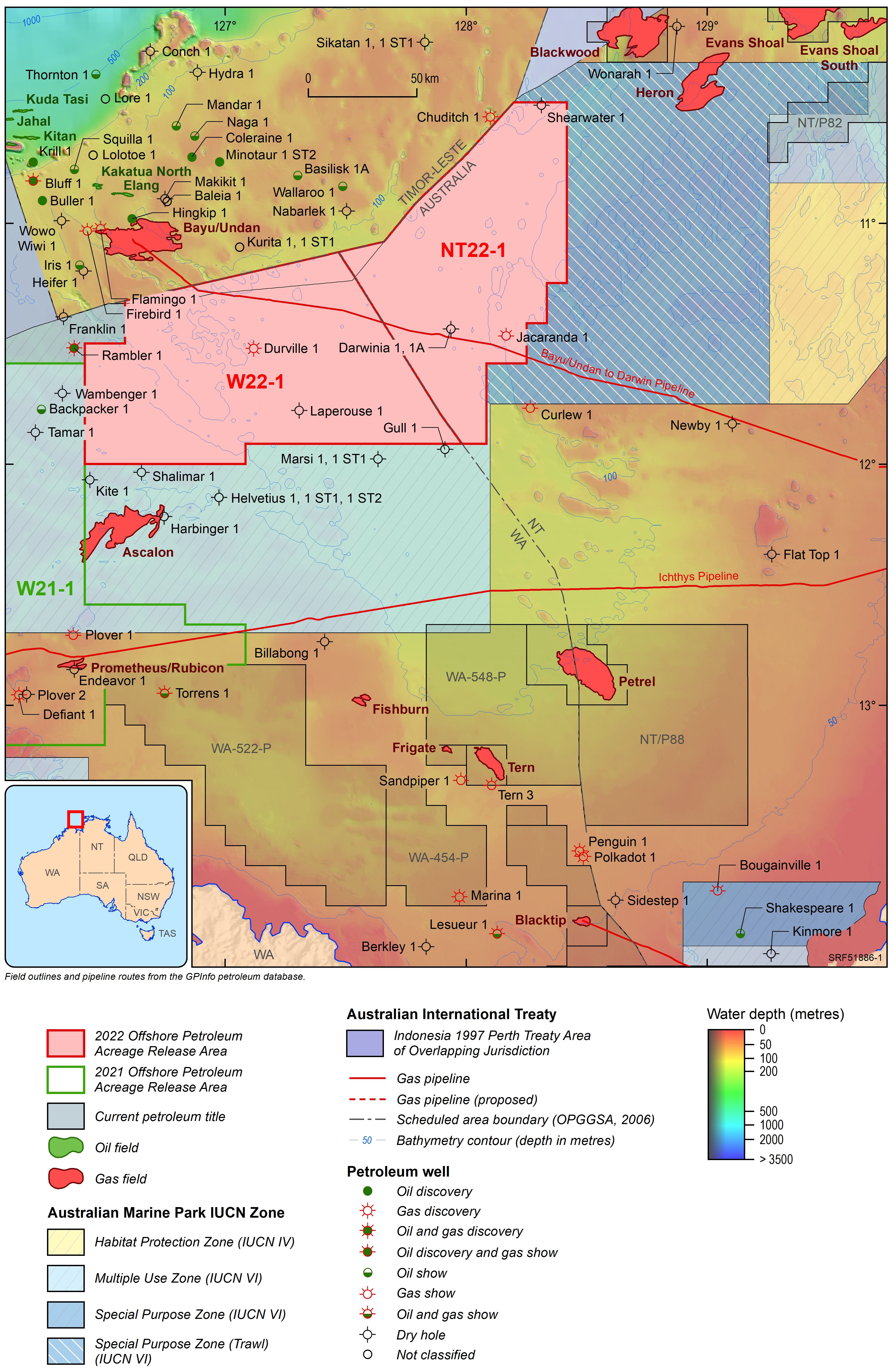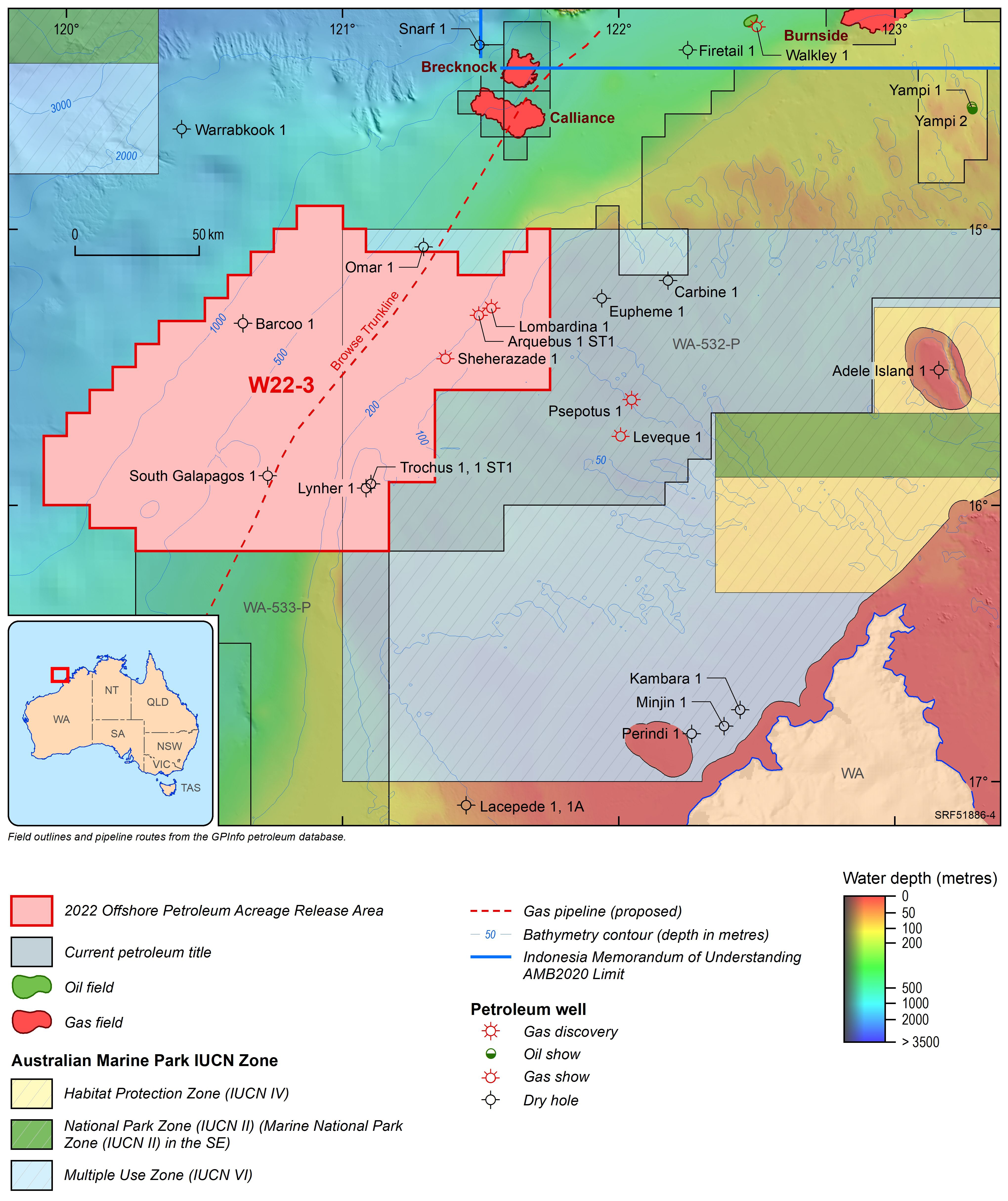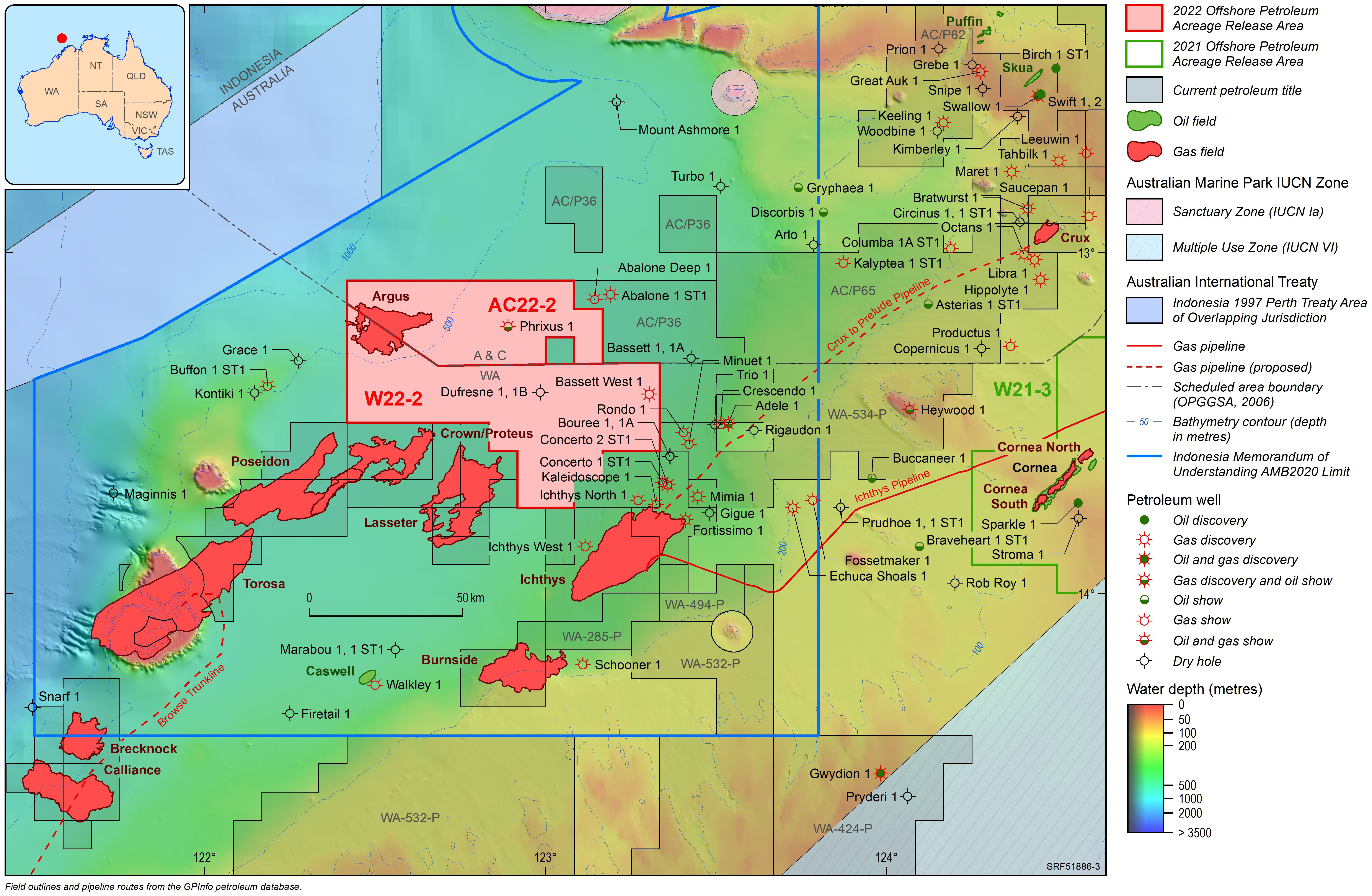 For information on the 2022 acreage release areas visit the Department of Industry, Science and Resources website. The release areas can also be viewed interactively via the Acreage Release persona on Geoscience Australia's Data Discovery Portal.
