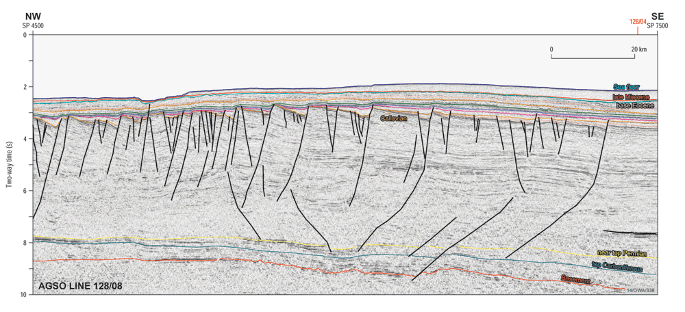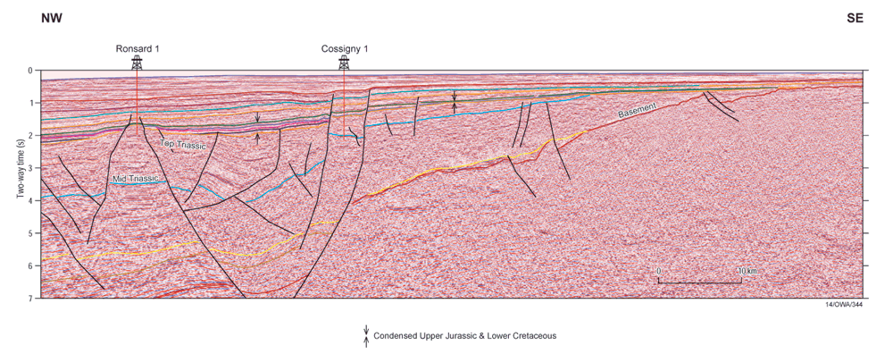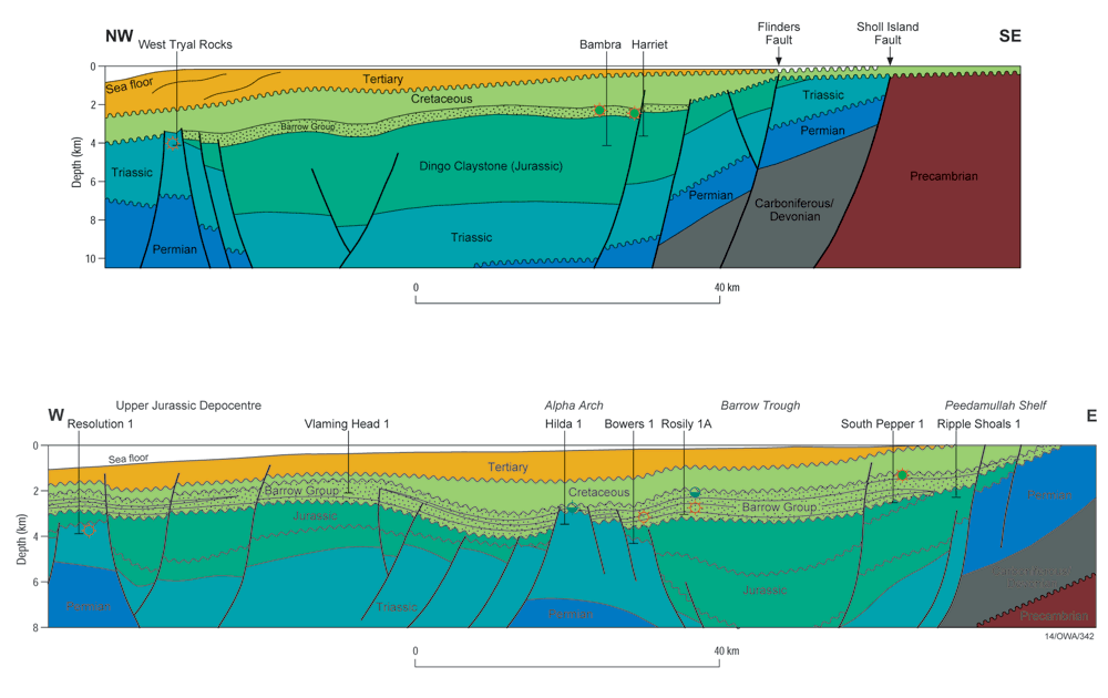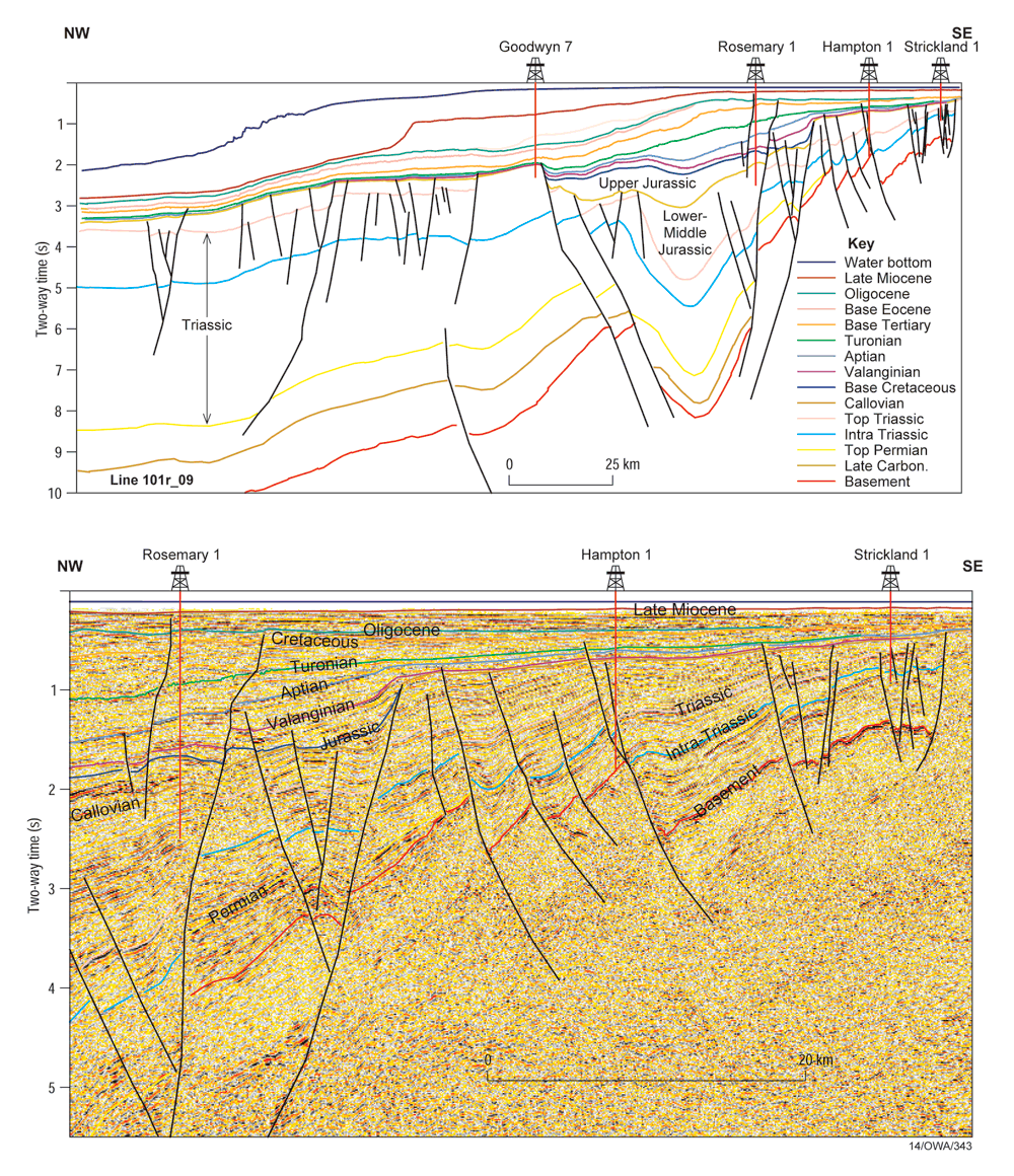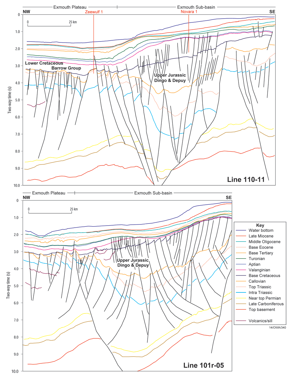 Comparison of the five cross-sections reveals differences in geometry, thickness and structural style between the sub-basins. Together, the profiles document the complex history of development and deformation of the Northern Carnarvon Basin.