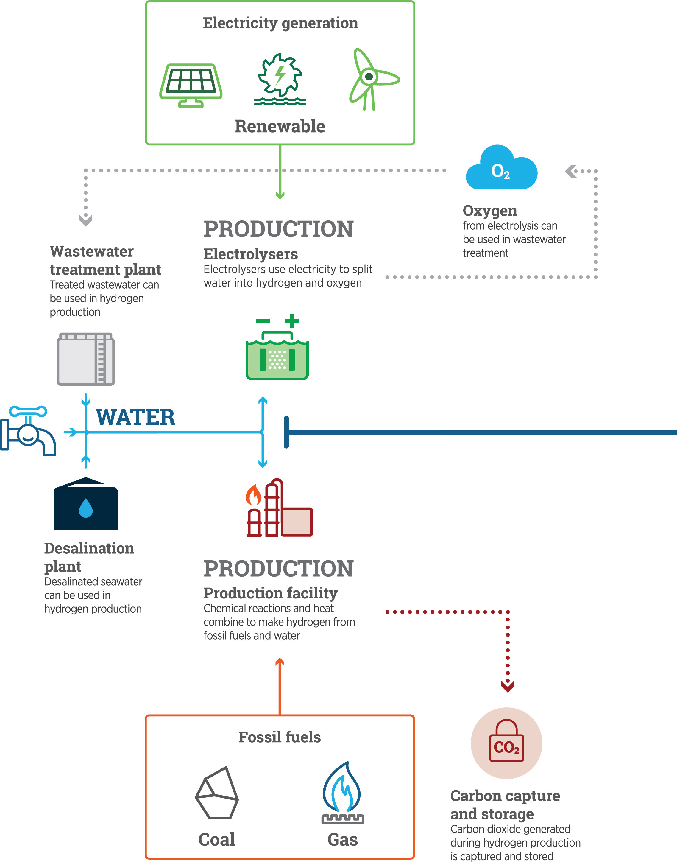 - using renewable energy sources such as solar and wind power to provide the electricity required to split hydrogen from water through a process known as electrolysis;