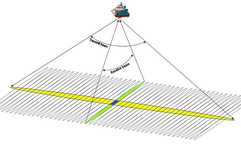 This figure shows an example of multibeam backscatter data collection where yellow represents the transmit beam, green is an example of one of the received beams and blue is a single footprint formed by the intersection of the two (©2017 Image from AML Oceanographic).