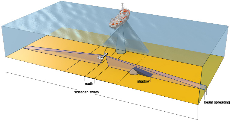 Strong return (high backscatter) typically occur when the sound is reflected off hard and rocky surfaces, while weak return (low backscatter) occur if reflected off softer sediments (e.g. sand). Because of the geometry of the sound pulse sent toward the sea floor, an obstacle rising above the seabed, such as shipwreck or steep hill can cast shadows (no return) in the sonar image. The size of the shadow can be used to determine the size of the feature (Figure 1).