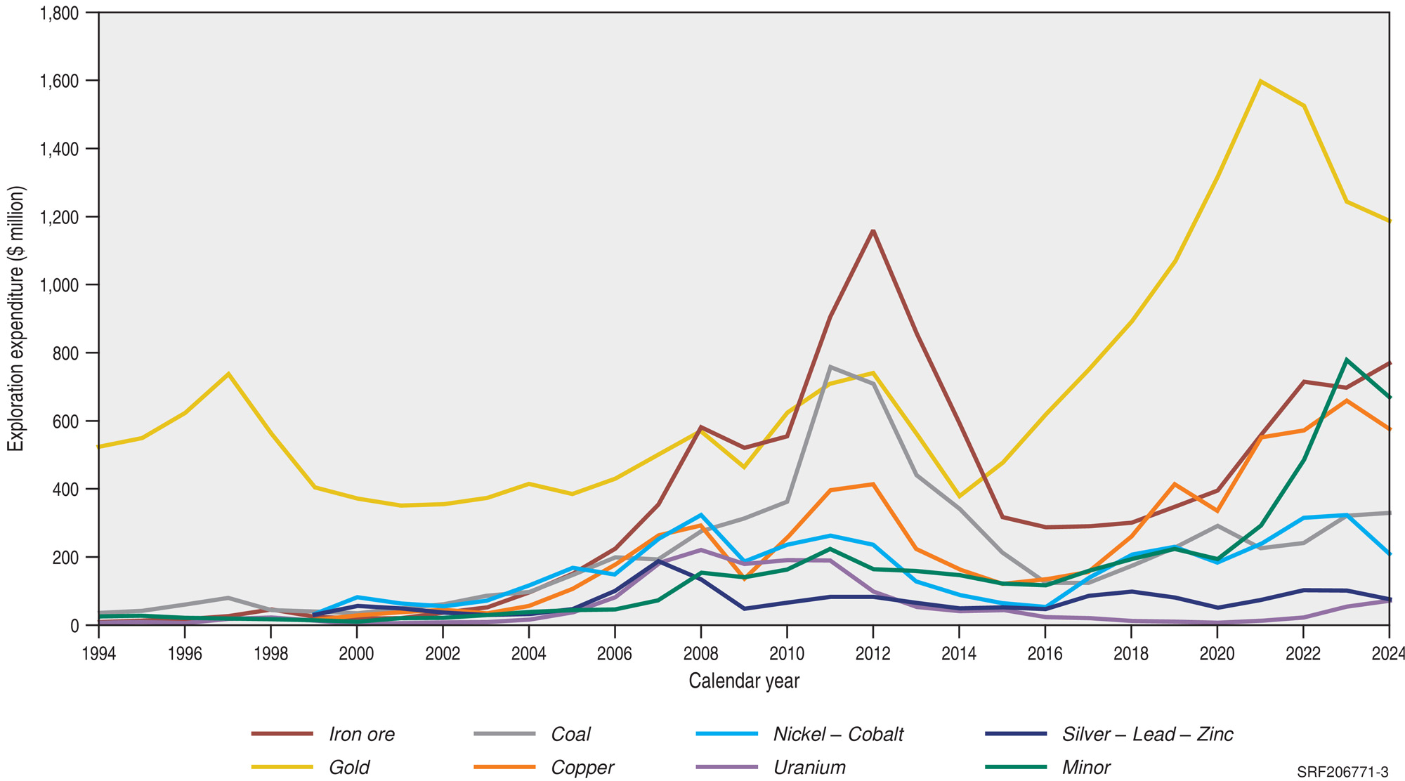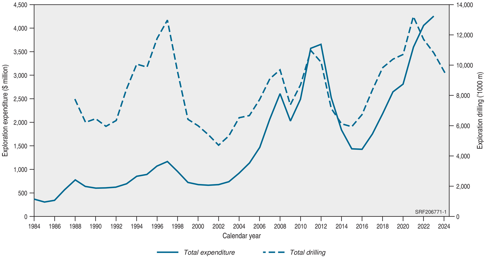 - Total mineral exploration expenditure for the 2024 calendar year was $3,949.0 million (Figure 1).