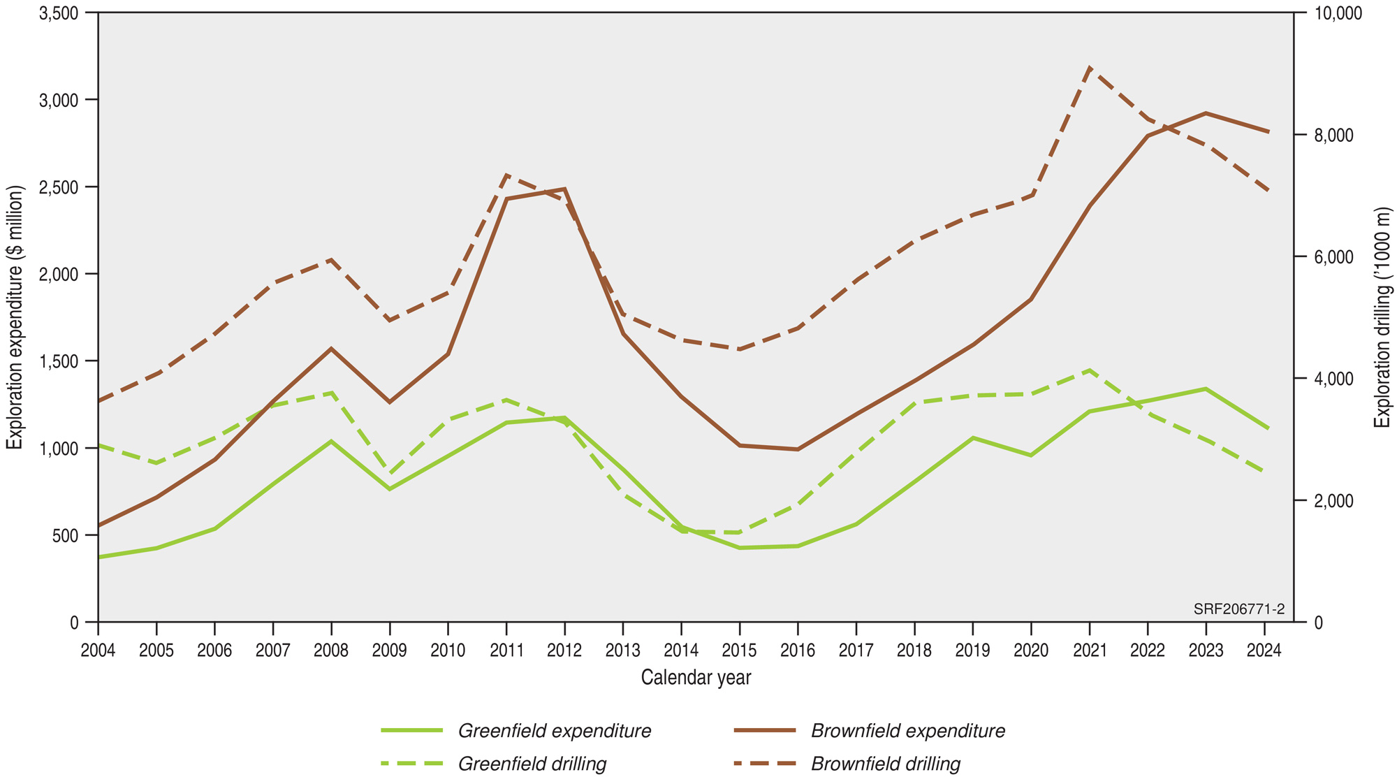 - Exploration expenditure in and around known deposits (brownfields) in 2024 was $2,823.0 million and expenditure for undiscovered mineralisation in frontier regions (greenfields) was $1,125.9 million. Brownfields drilling totalled to 7,129,600 metres (m) and greenfields drilling totalled 2,463,400 m (Figure 2).