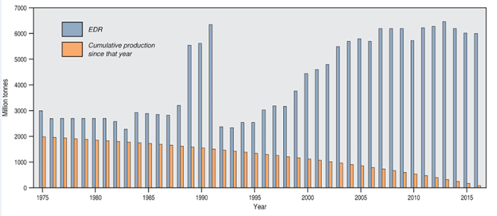 Figure 2 demonstrates the vast Australian bauxite inventory by showing that even over the last 40 years, cumulative production (1981 Mt) has only mined out 66% of the 3000 Mt of resources assessed as economic back in 1975. Despite these significant resources, Figure 6 shows that over the last 40 years, bauxite production has increased more rapidly than the bauxite inventory. In 1975, bauxite production was 21 Mt which rose to 82 Mt in 2016, a 290% increase. Bauxite EDR has increased 100% over the same time period (3000 Mt in 1975 to 6005 Mt in 2016) and total resources of bauxite (EDR + Subeconomic + Inferred) have increased from 6678 Mt in 1976 to 9520 Mt in 2016, an increase of 43%.